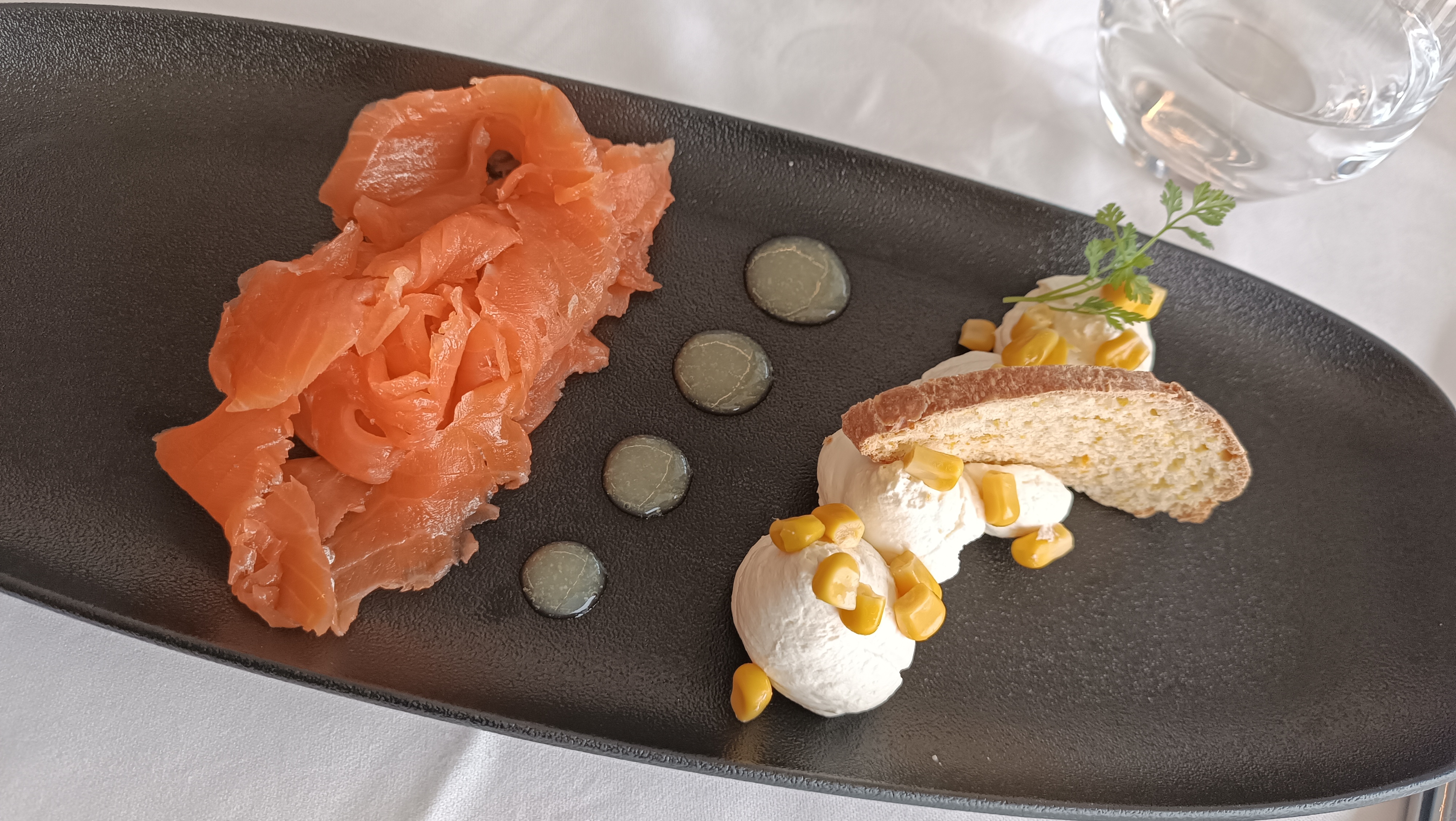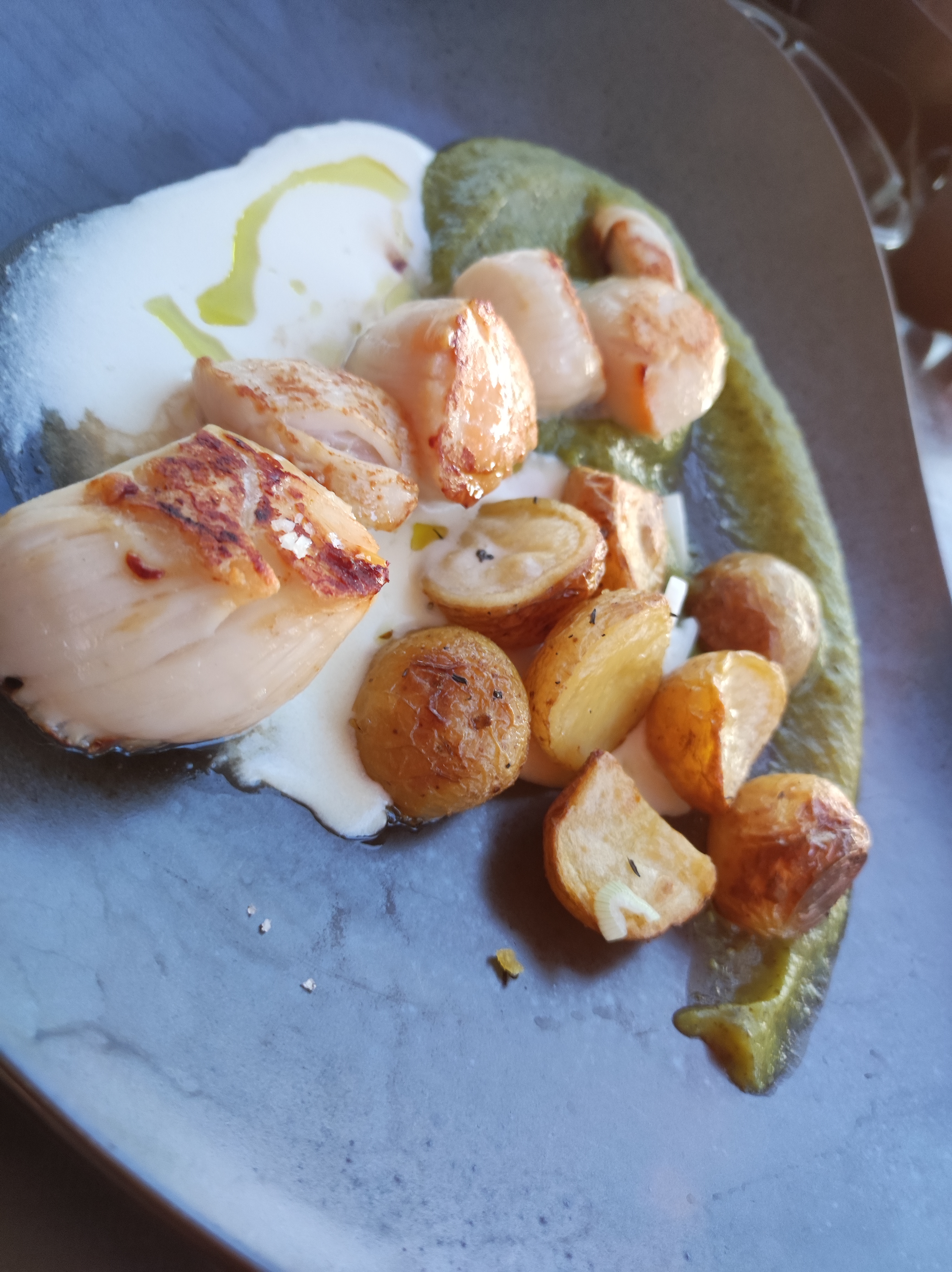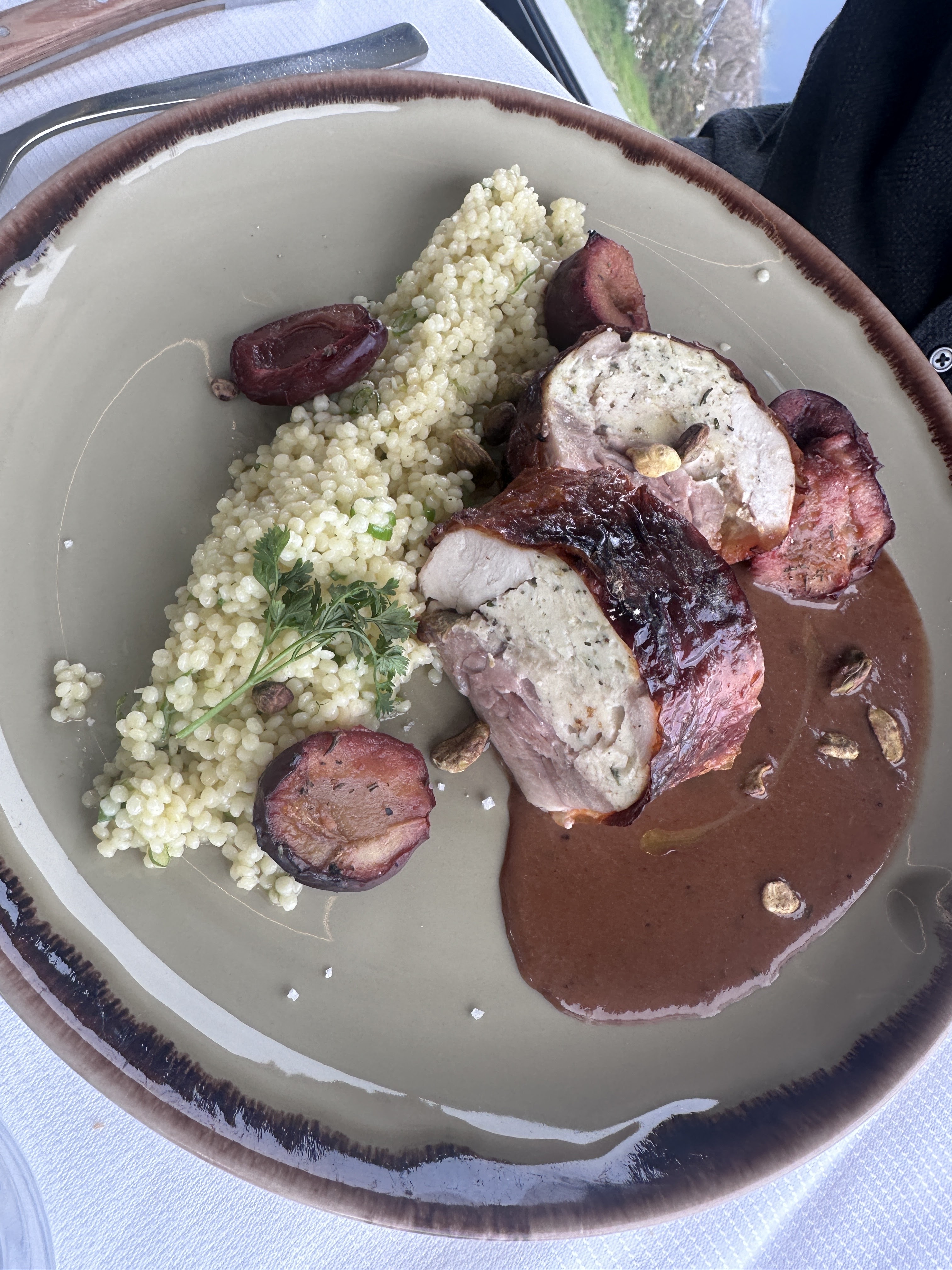 Vue magnifique, assiettes très jolies c'était beau et c'était bon mais pas extraordinaire et très limité au niveau des quantités. Nous nous attentions à autre chose en voyant la carte et les prix. Un peu long au niveau du service surtout pour un repas un midi en semaine. Par contre la serveuse était adorable 😁