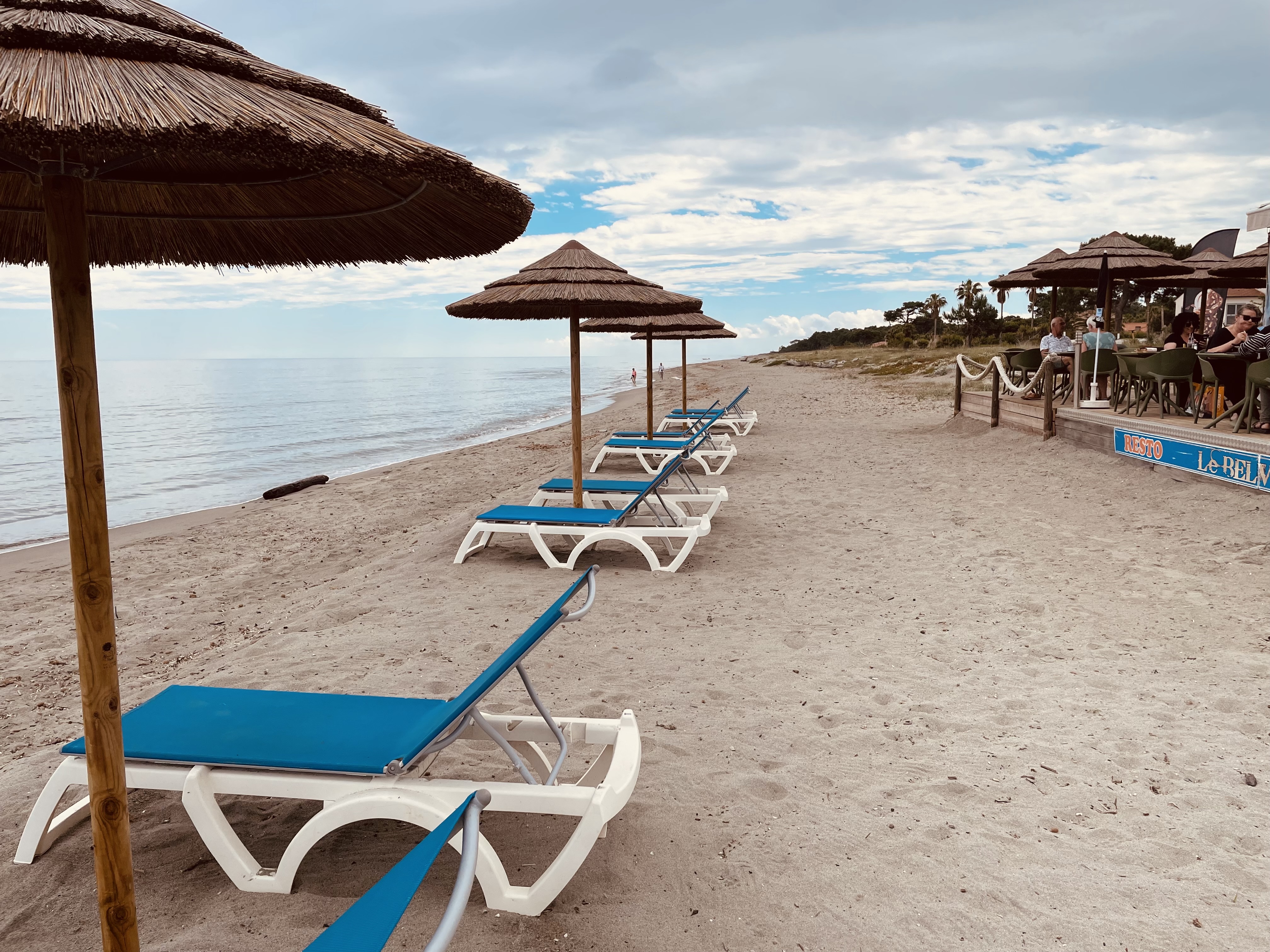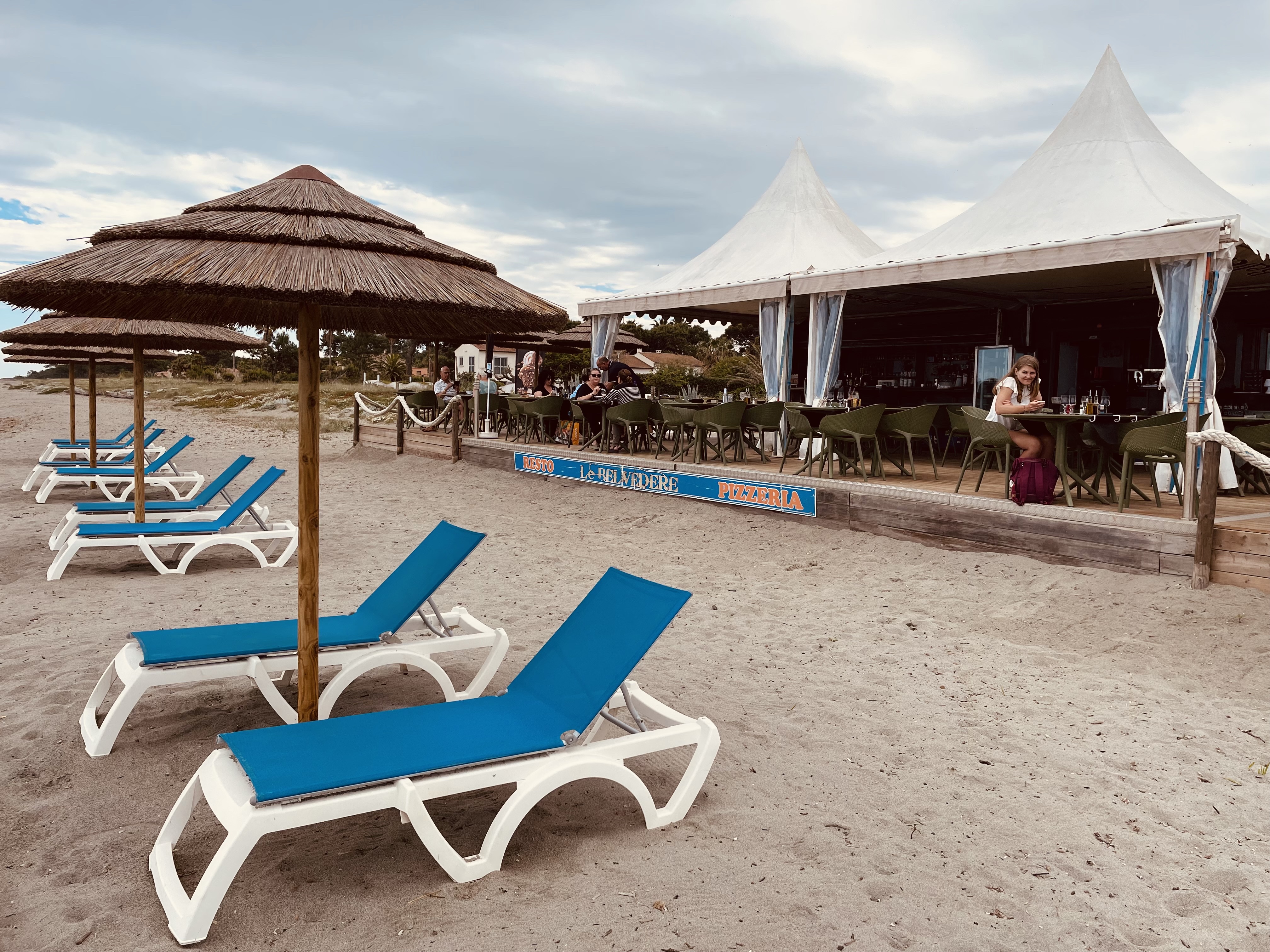 Café pizzeria terrasse bois sympa sur la plage. On peut avoir un parasol paillote avec une chaise longue pour 10 euros la journée. Le café par contre est à 2 euros.
