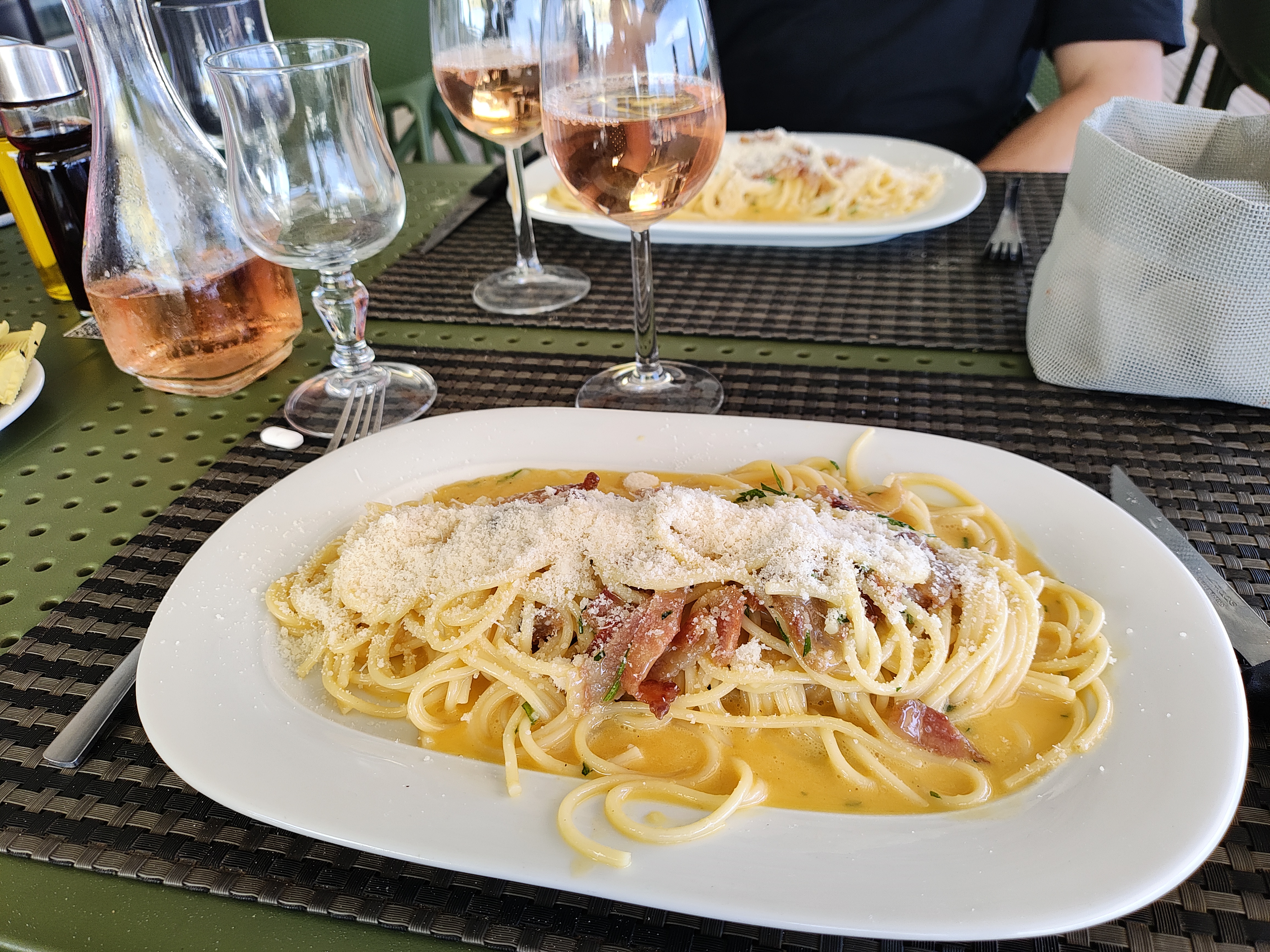 Nous étions 2, pâtes bolo et salade Belvedere. Les portions sont plutôt grandes,. C'est très bon. Le décor avec la plage juste à côté est parfait. Service sympathique. Je recommande vivement.