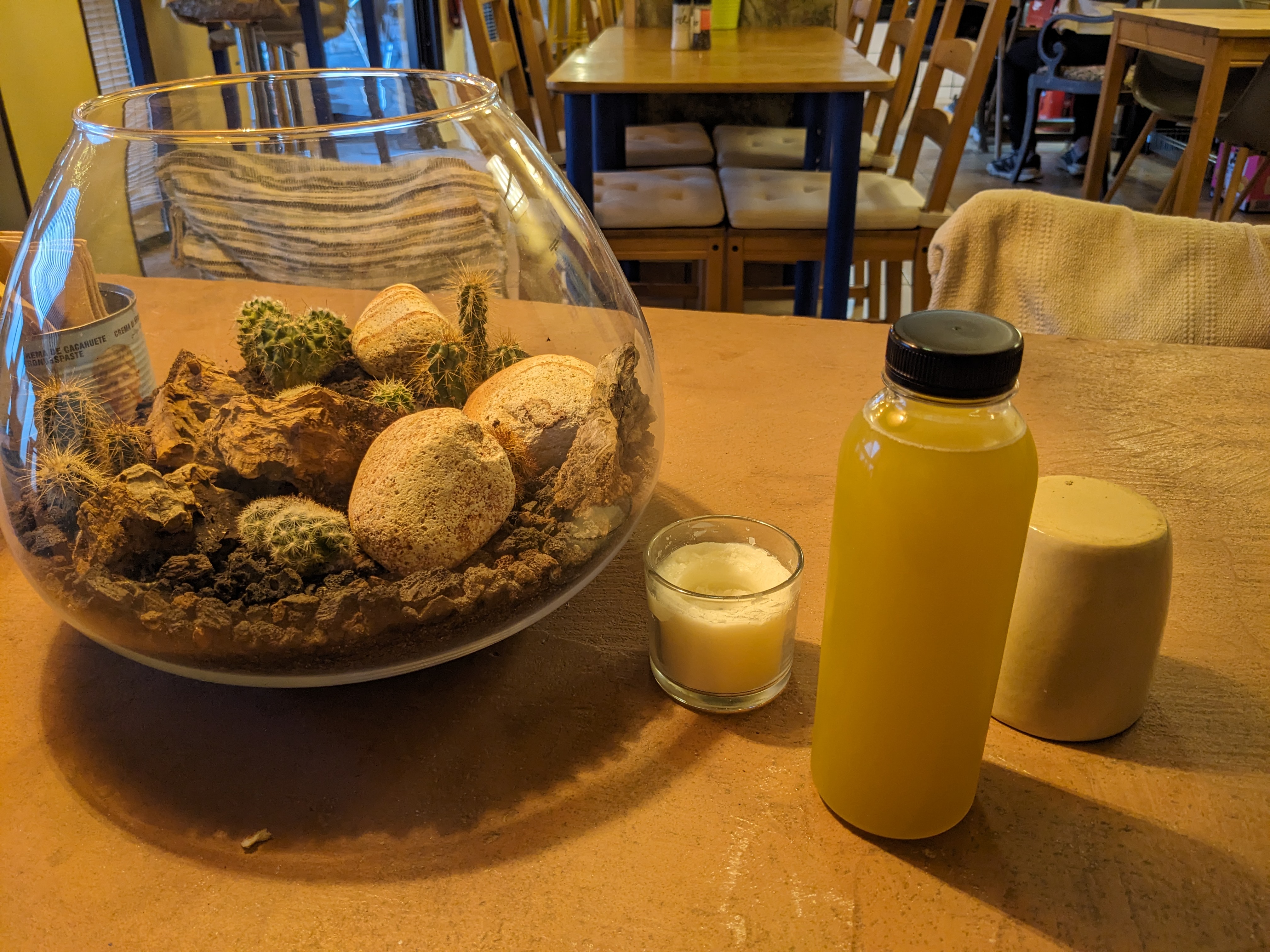 Absolument conquise par cet établissement. Les prix sont abordables et les plats sont exquis, mention spéciale aux boissons, que ce soit la mangue passion , la citronnade ou la litchi hibiscus. Bref je ne serais que vous recommandez d'y déjeuner ou dîner. (Vraiment dégoûtée de ne pas habiter les environs sinon j'y serais très souvent.)
