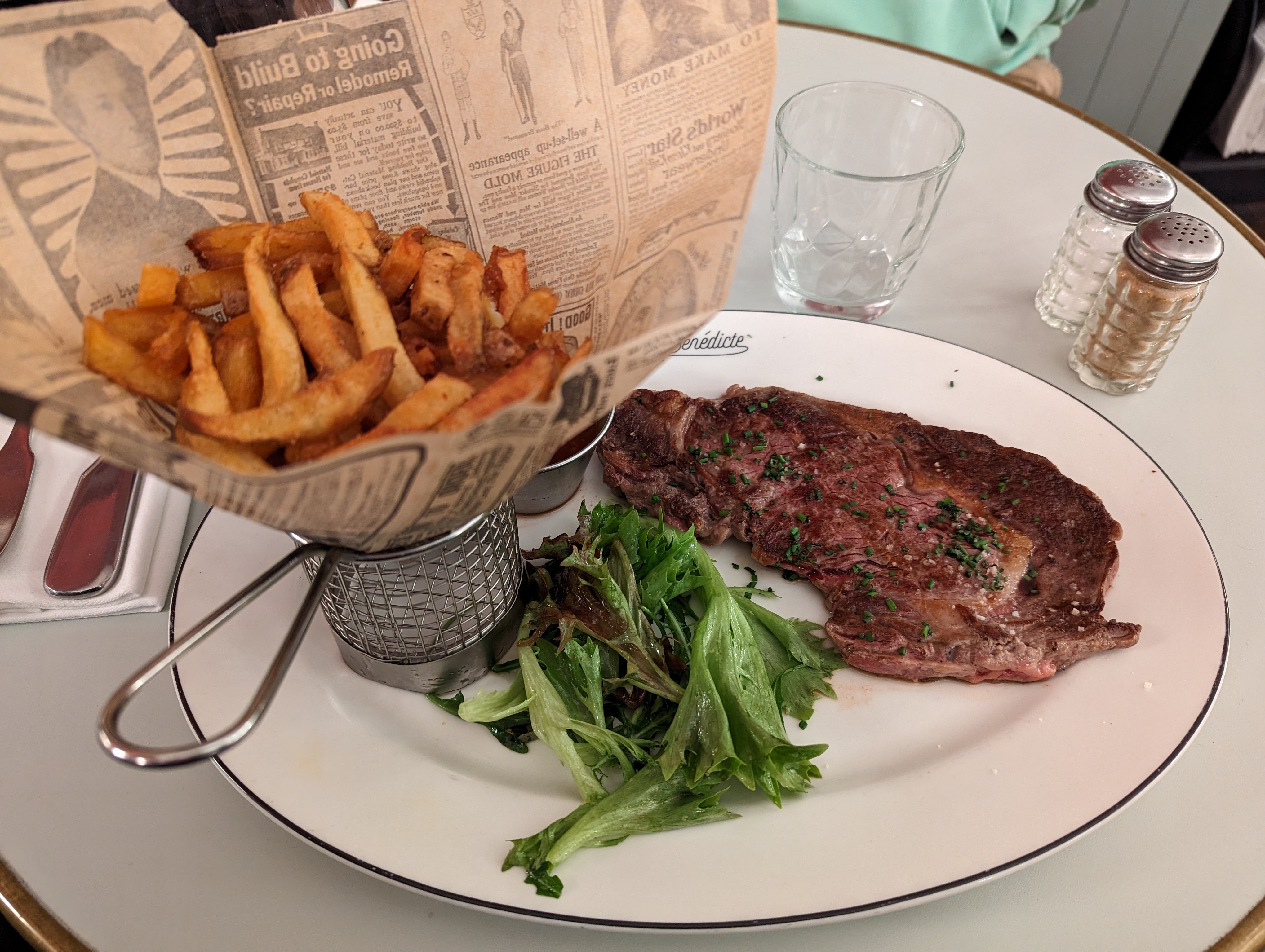 La viande était très tendre, les frites étaient faites maison, la sauce au poivre aussi : tout était bon. Service très agréable et jolie vue sur la place Saint Germain.