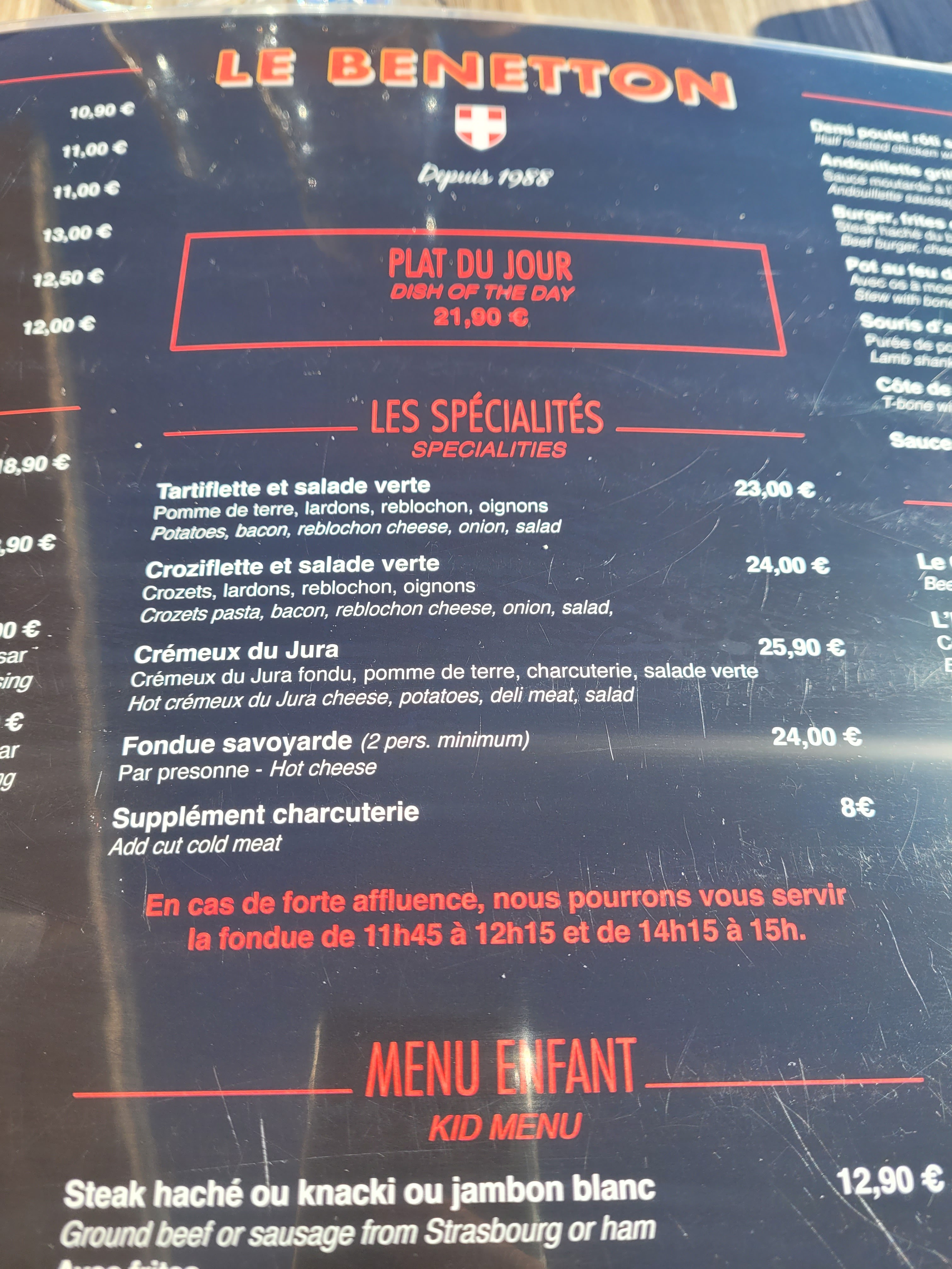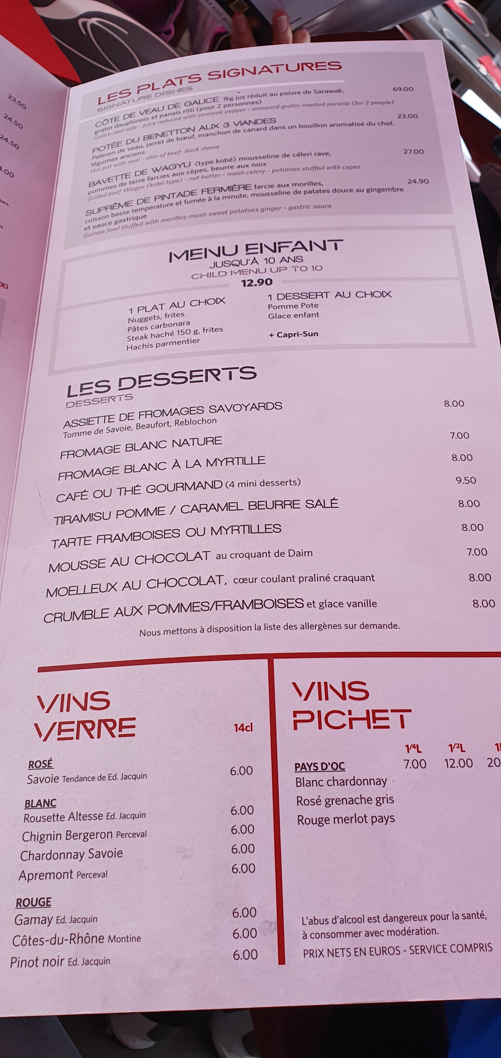 Le 24/01 repas le midi avec des amis après le ski restaurant un peu cher selon moi 12€ la soupe du jour 13€ pour celle au beaufort et 19€ les pâtes, accueil convenable. Je joins une photo du menu.
