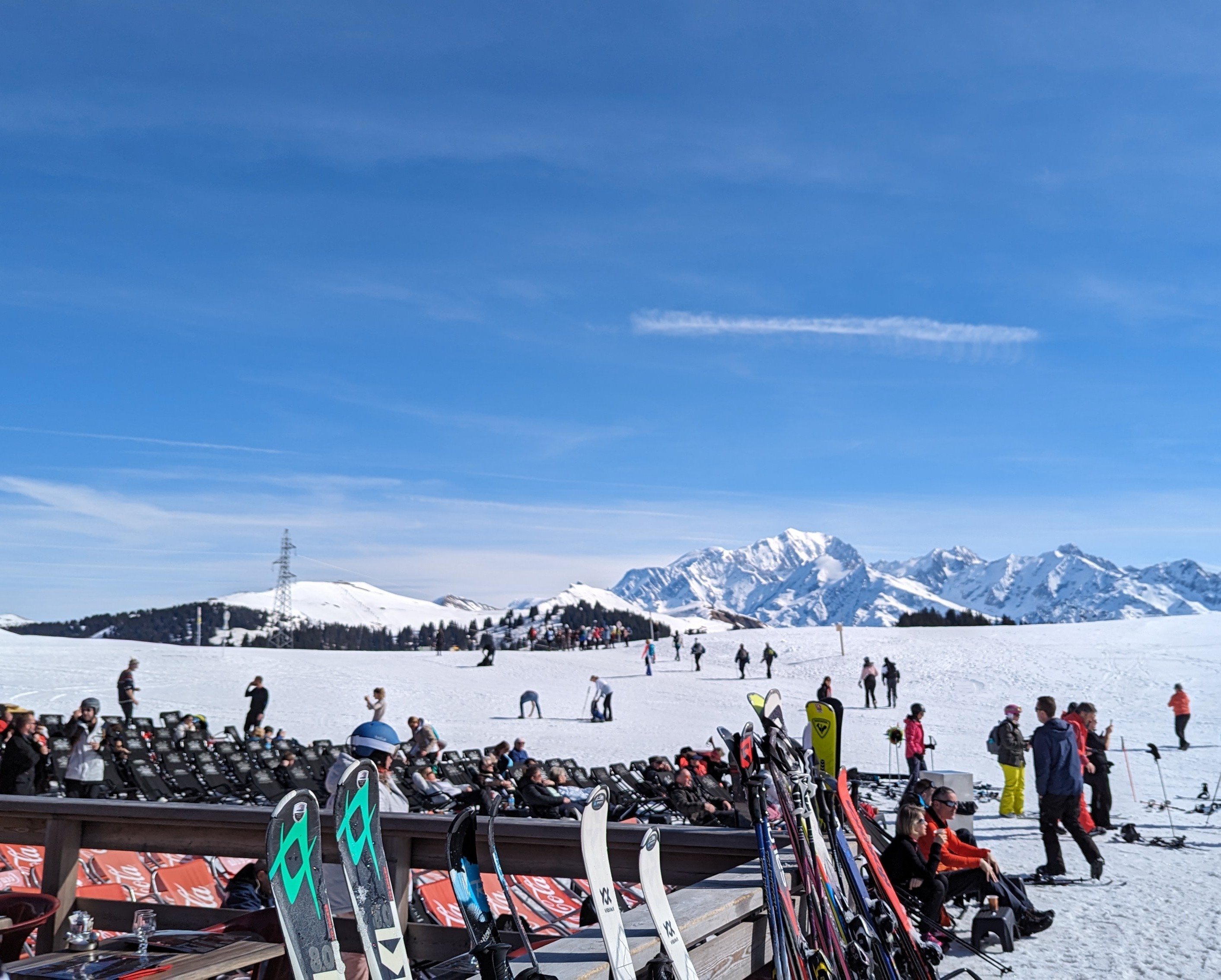Manger en terrasse, face au mont Blanc, au milieu des pistes, le pied. La cuisine est bonne, ce qui ne gache rien.