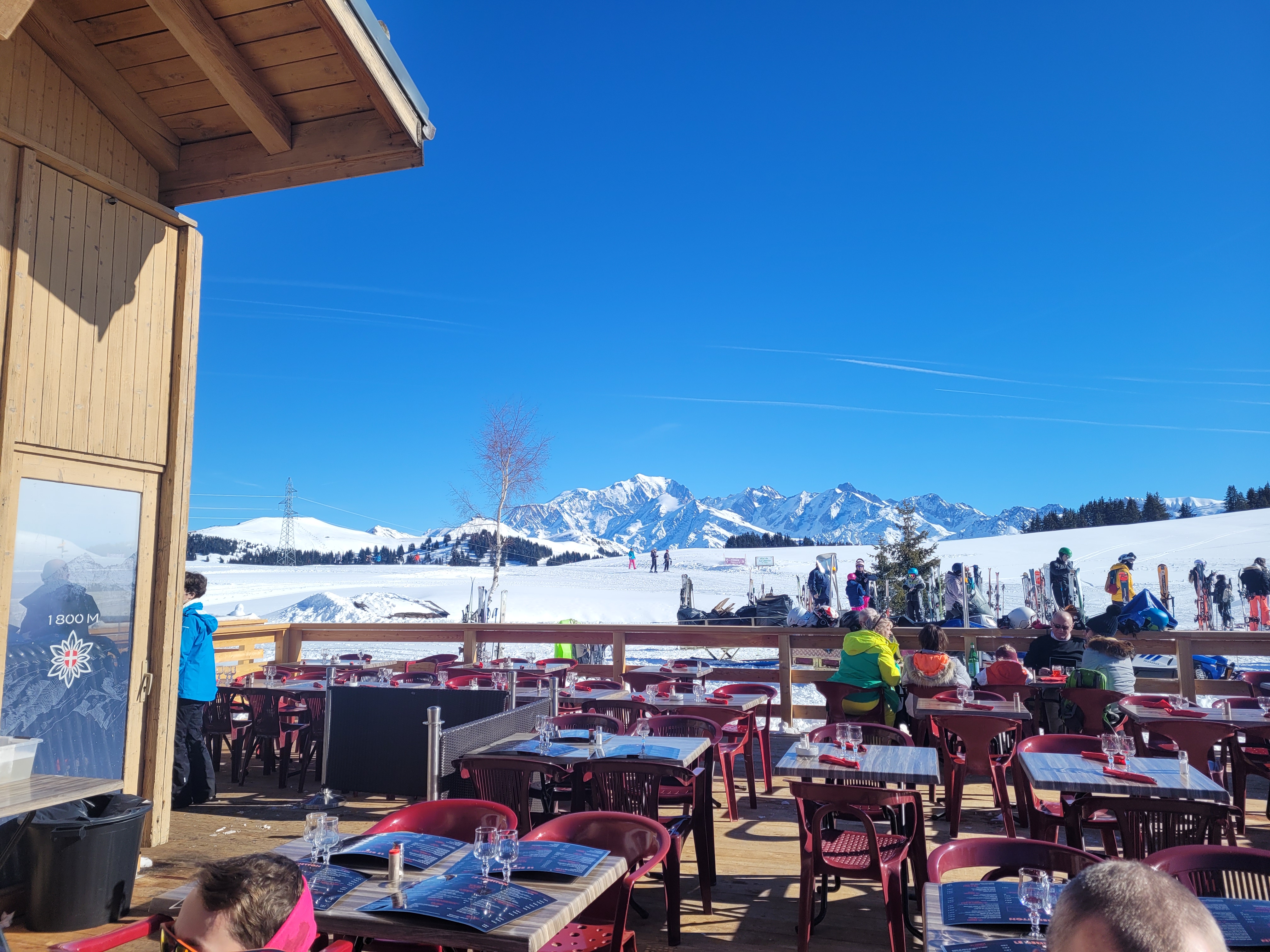 Restaurant d altitude idéalement situé avec vue sur le mont blanc, accessible aux skieurs et aux piétons par un très beau chemin piéton qui peut se poursuivre encor plus haut
