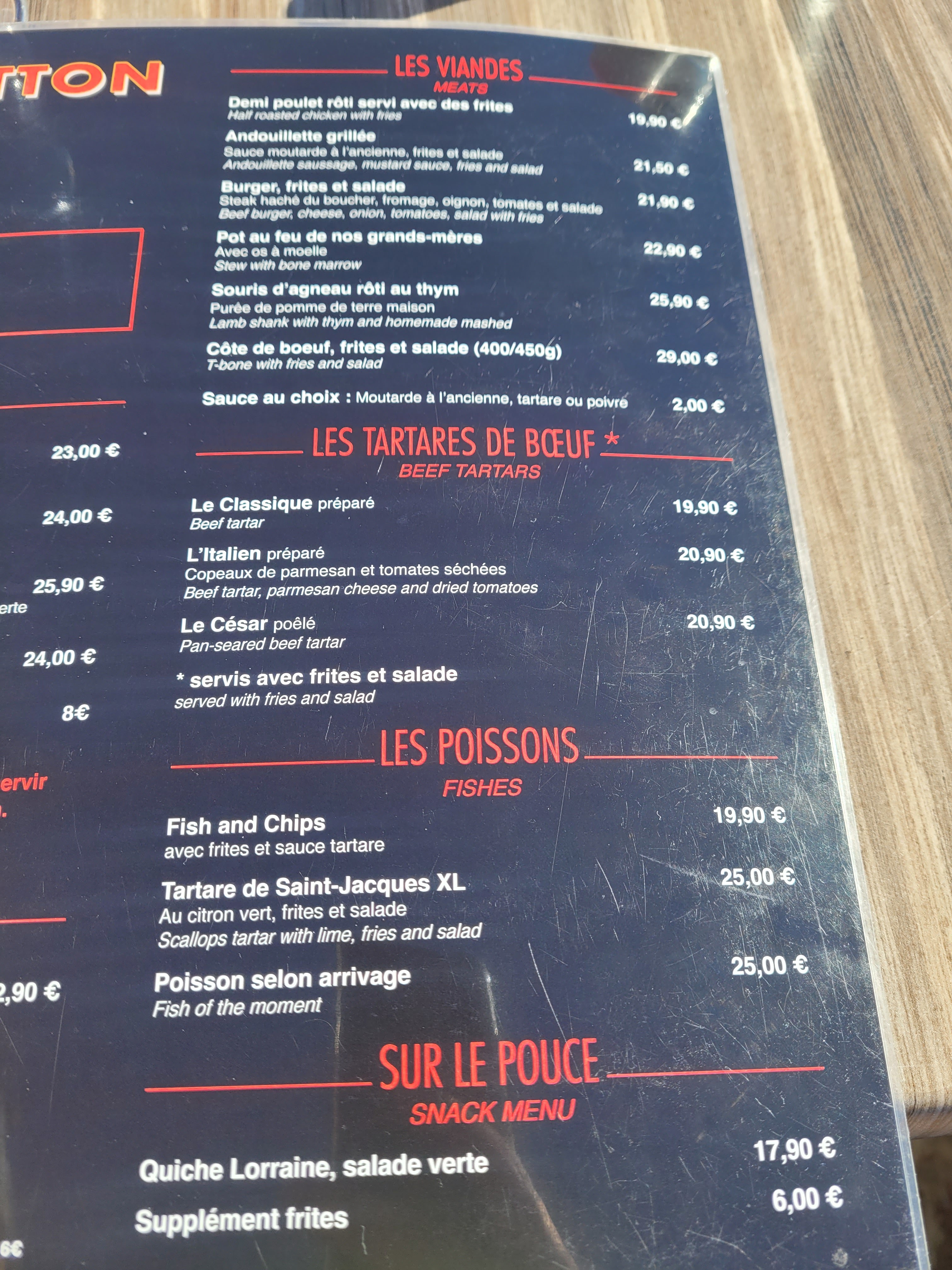 Repas correct : bon mais hamburger froid, poulet rôti ok, pâte carbo (grosse assiette) ok. Service rapide, personnel agréable Tarif trop cher, pas de plat à moins de 20€. Pour 4 personnes : 4 plats, 3 boissons = 100€ !!!! 😥😱