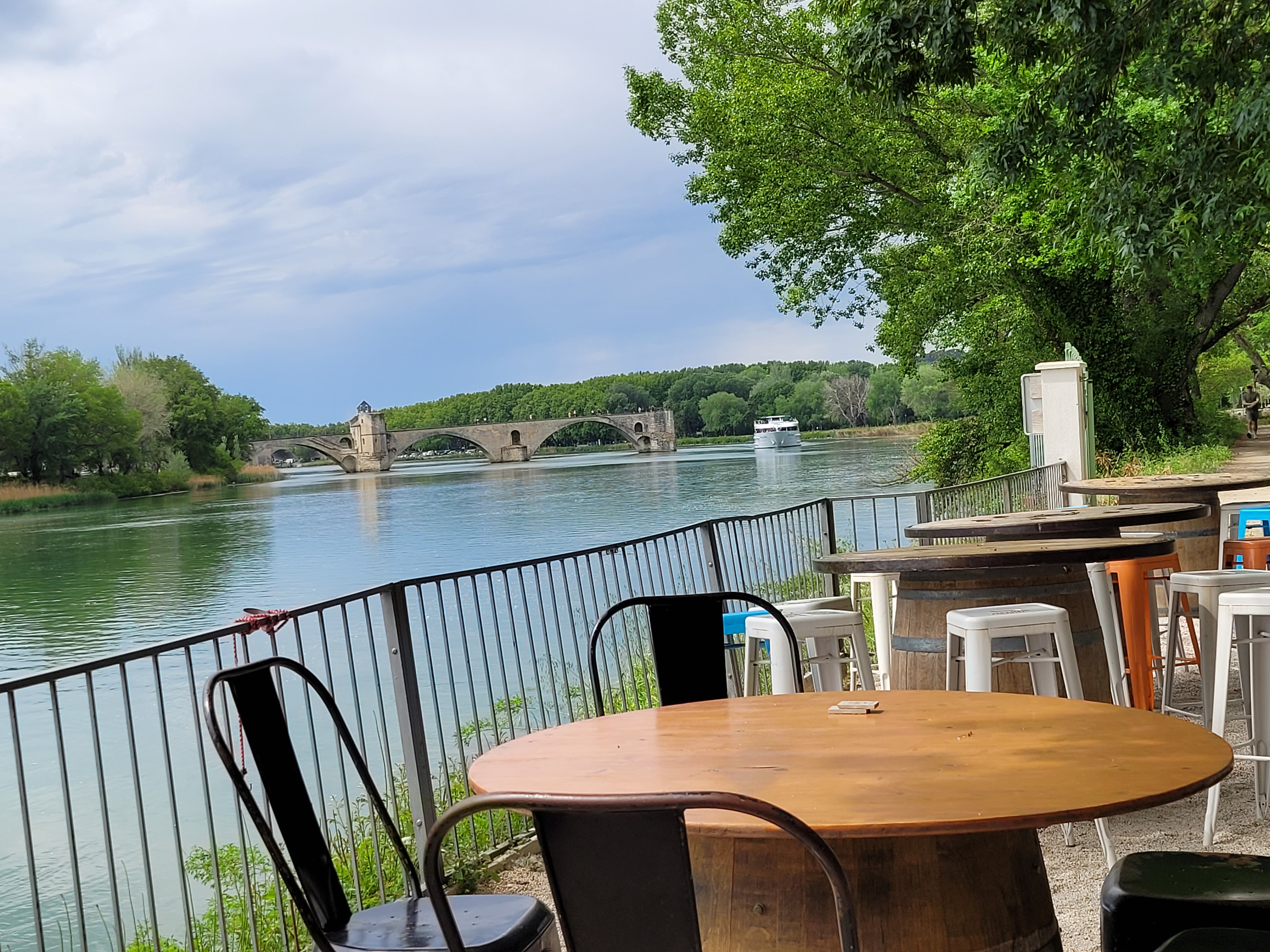 Un restaurant situé au bord du Rhône avec une vue sur le pont d'Avignon... c'est superbe ! Une équipe nombreuse très efficace et avenante, pour un service qui ne traîne pas en longueur (mais laisse prendre le temps de profiter) : on aime ! Des plats variés, goûtus et abordables. On n'a moins aimé le dessert du jour à base de griottes mais c'est plus une question de goûts personnels. On regrette de ne pas avoir de grillades à la carte... On recommande bien évidemment !