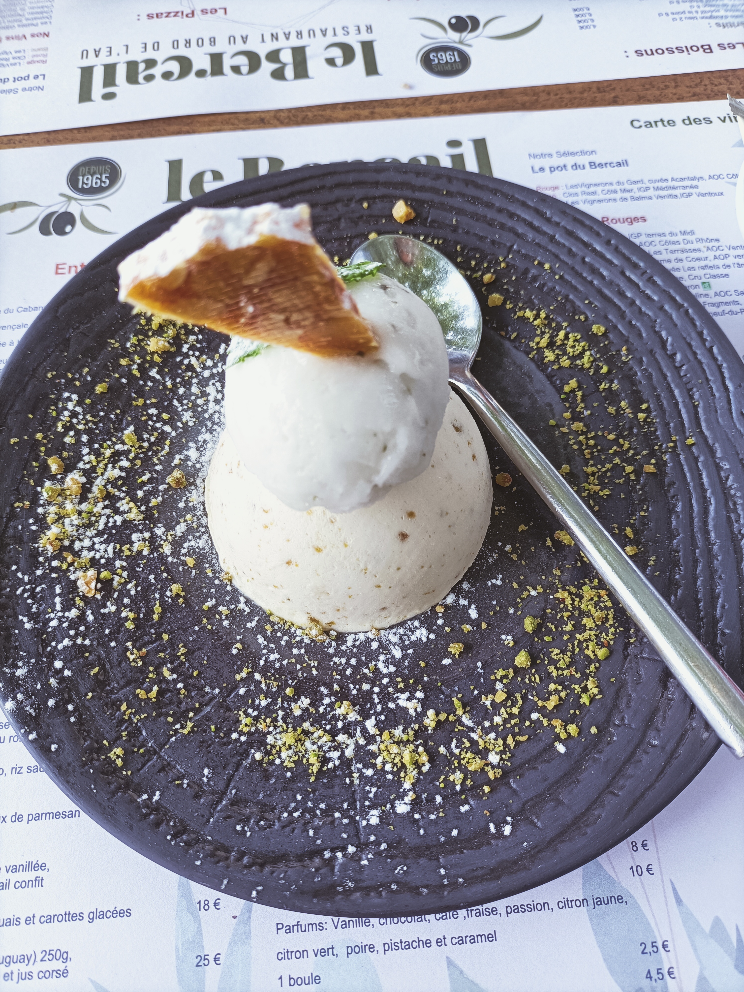 N en déplaise à certains internautes, le Bercail est un lieu , non seulement d exception mais nous avons été accueilli avec beaucoup de gentillesse. 11h , après une ballade à moto, nous avons réservé une table et souhaité boire un café. Alors que le service n était pas ouvert, l employé à accédé à notre souhait. Excellents repas, créativité, fraicheur, rapidité du service et vue magnifique sur le pont d Avignon. Une jolie expérience à renouveler. Je recommande le gaspacho et sa boule de glace au basilic et son crumble acidulé . Mais aussi les filets de dorade et ses petits legumes ou encore la soupe de fruits et sa glace à la lavande Juillet 2023 , dîner au Bercail, jamais déçue. Personnel agréable, service rapide