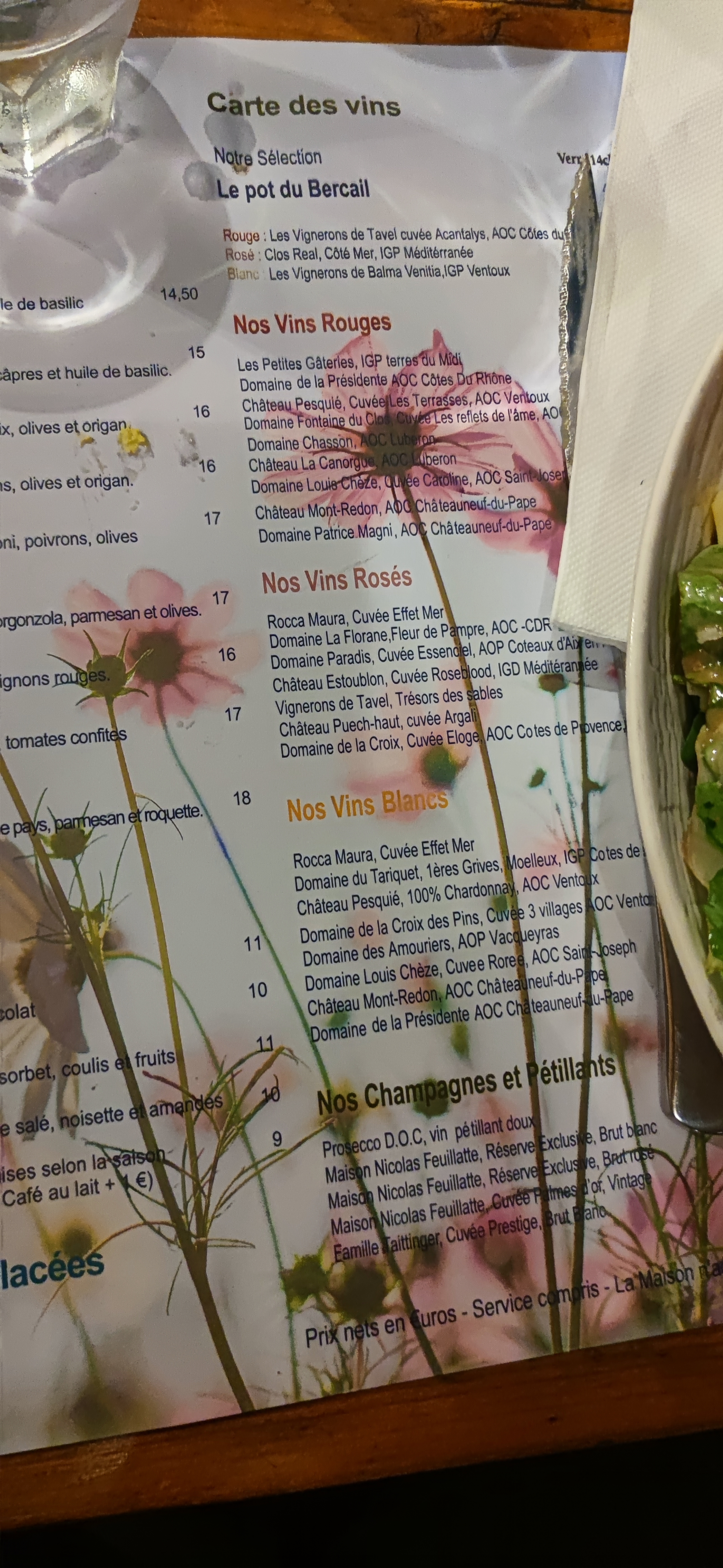 Le restaurant est bien situé nous pouviez voir le pont d avignon depuis notre table. Il devrait revoir cependant la structure du sol de leur parking parce qu en arrivant la poussières étaient au rendez-vous donc voiture toute blanche en rentrant et en sortant. Le cadre autrement est pittoresque et convivial. Le restaurant en lui même est bien organisé et accueillant. Vous trouverez des places à l intérieur et en extérieur. Concernant la carte vous n'avez qu'un menu à 31 euros que je trouve cher pour le repas servi. J avais pris en entrée une ardoise qui était bien copieuse mais dont la tapenade n'était pas top(un arrière gout), pour le plat nous avions toute la tablé pris le poisson et nous avons tous remarqués que l'accompagnement (1 asperge n'était pas cuite et de plus pour ma part mal épluchée). Pour le dessert, l'ensemble des convives étaient contents. J'ai testé à refaire pour voir si je me suis pas trompé.