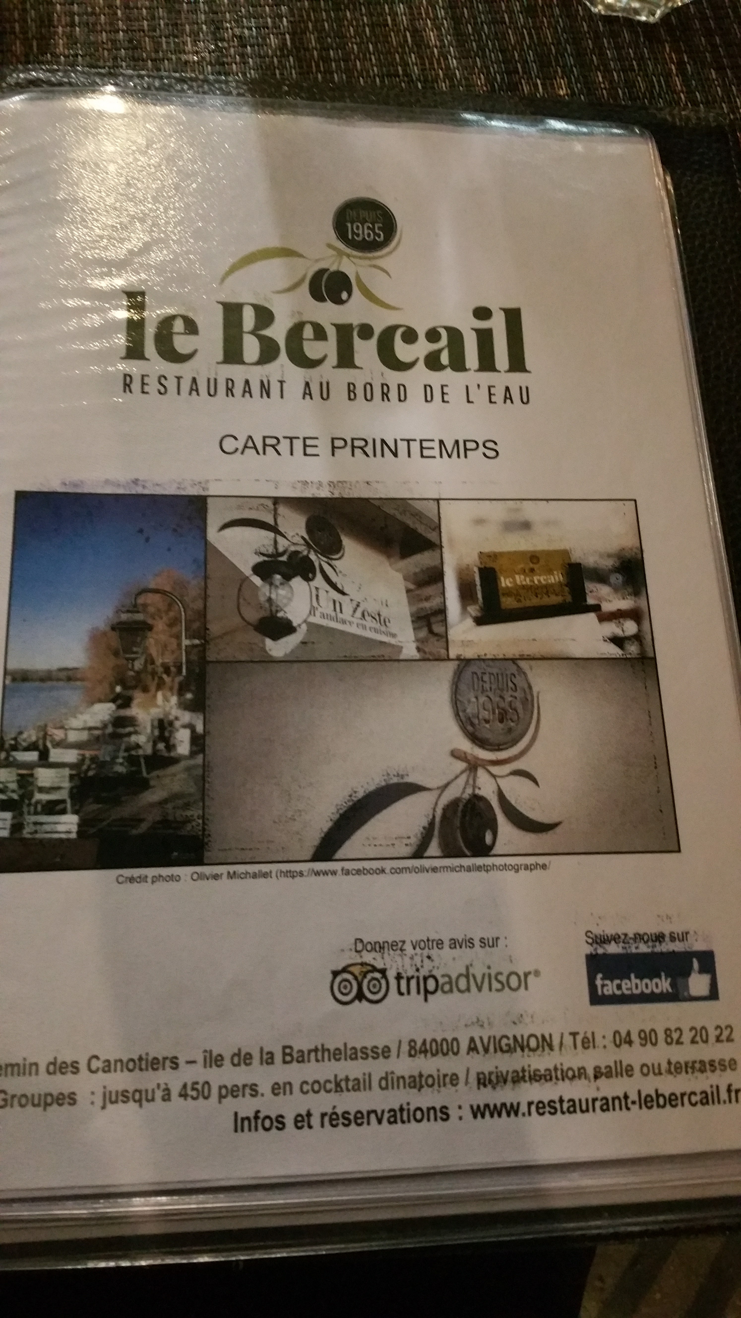 Un chouette moment passé en famille au Bercail. Nous étions en groupe et installé au calme, dans une véranda rien que pour nous. Cuisine très bonne et serveurs/ses très aimables. Parking facile et emplacement superbe au bord du Rhône et face au pont d'Avignon et Jardins des Doms