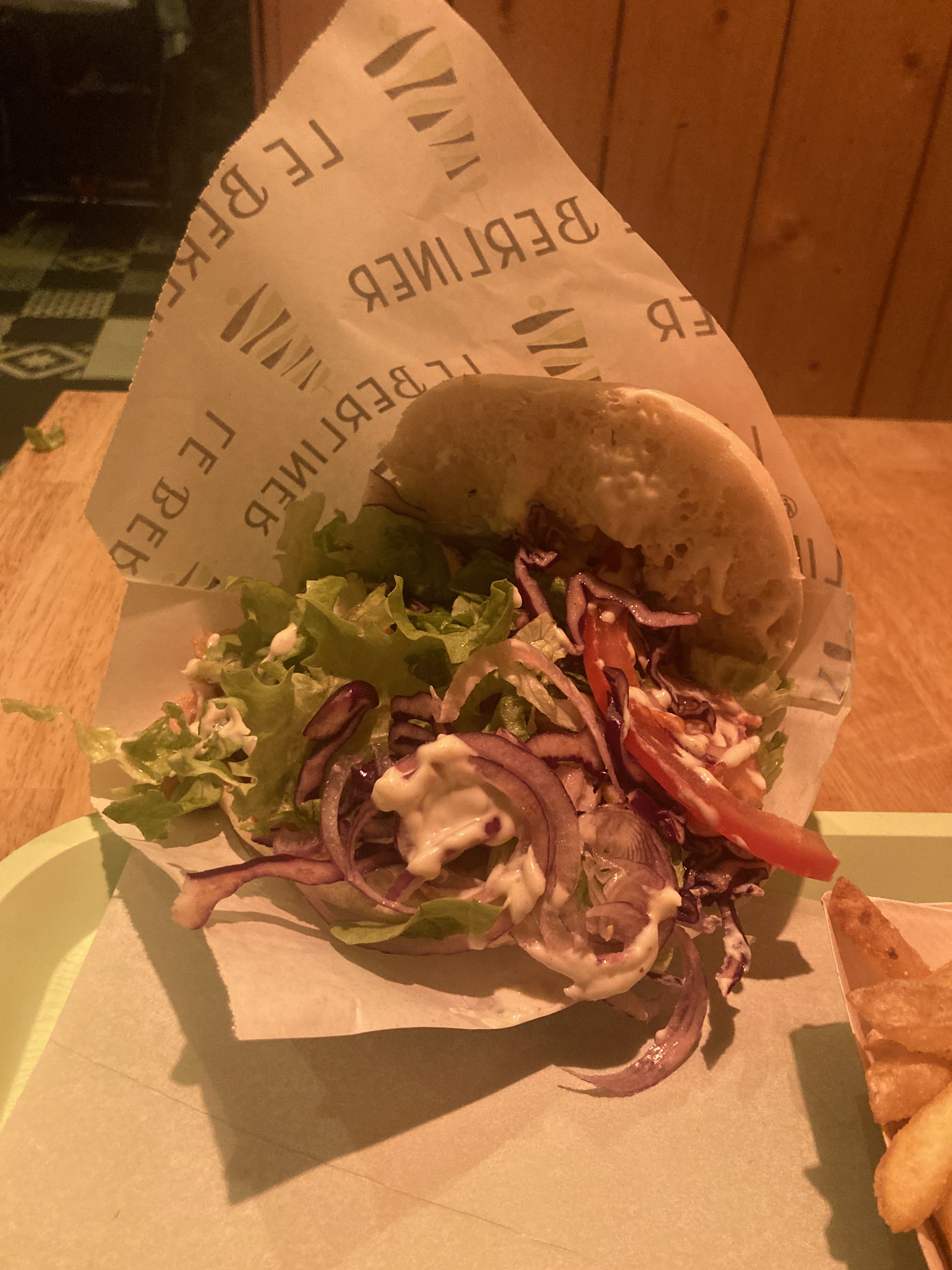 N’a de Berliner que le nom et les extras dans le sandwich (concombre, fêta,…) Rarement mangé une viande aussi mauvaise, grasse, molle et au goût des pires broches industrielles. Ça reste sur l’estomac et c’est mangé sans aucun plaisir.