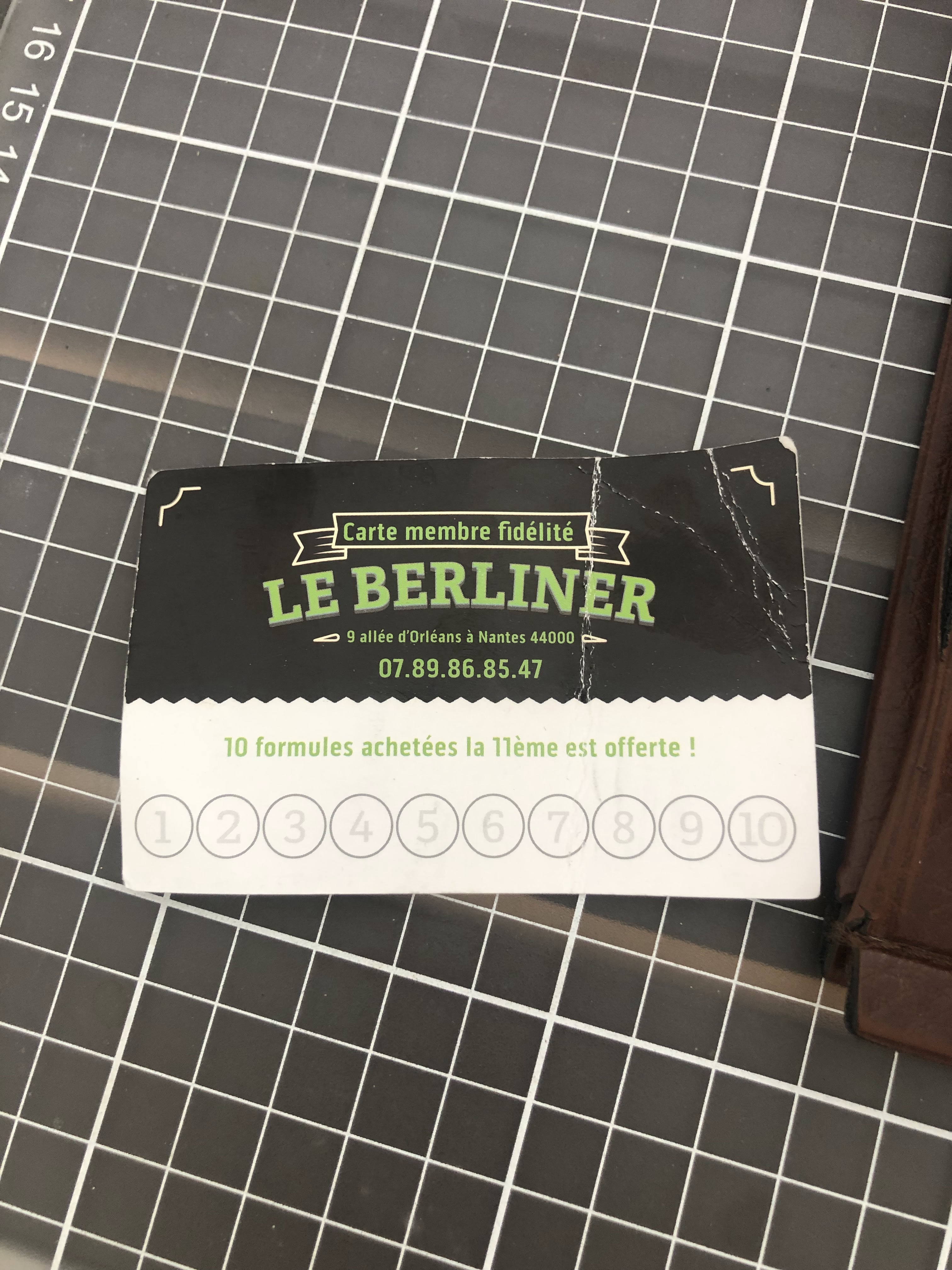 Bonjour, je souhaiterais obtenir des informations concernant la mention sur votre carte membre fidélité qui stipule : 10 formules achetées la 11ème est offerte !. Le mois dernier, j'ai eu l'occasion de me rendre deux fois au restaurant Le Berliner et lors de chaque visite, j'ai acheté 2 formules. Toutefois, je me questionne sur le nombre de tampons qui devraient m'être attribués. Selon la mention sur la carte, je m'attendais à recevoir 4 tampons, soit un par formule achetée à chaque passage. Pouvez-vous m'expliquer pourquoi je n'ai pas reçu les tampons correspondant à mes achats ? J'apprécierais vivement une clarification sur le fonctionnement de votre programme de fidélité. Je vous remercie d'avance pour votre réponse.