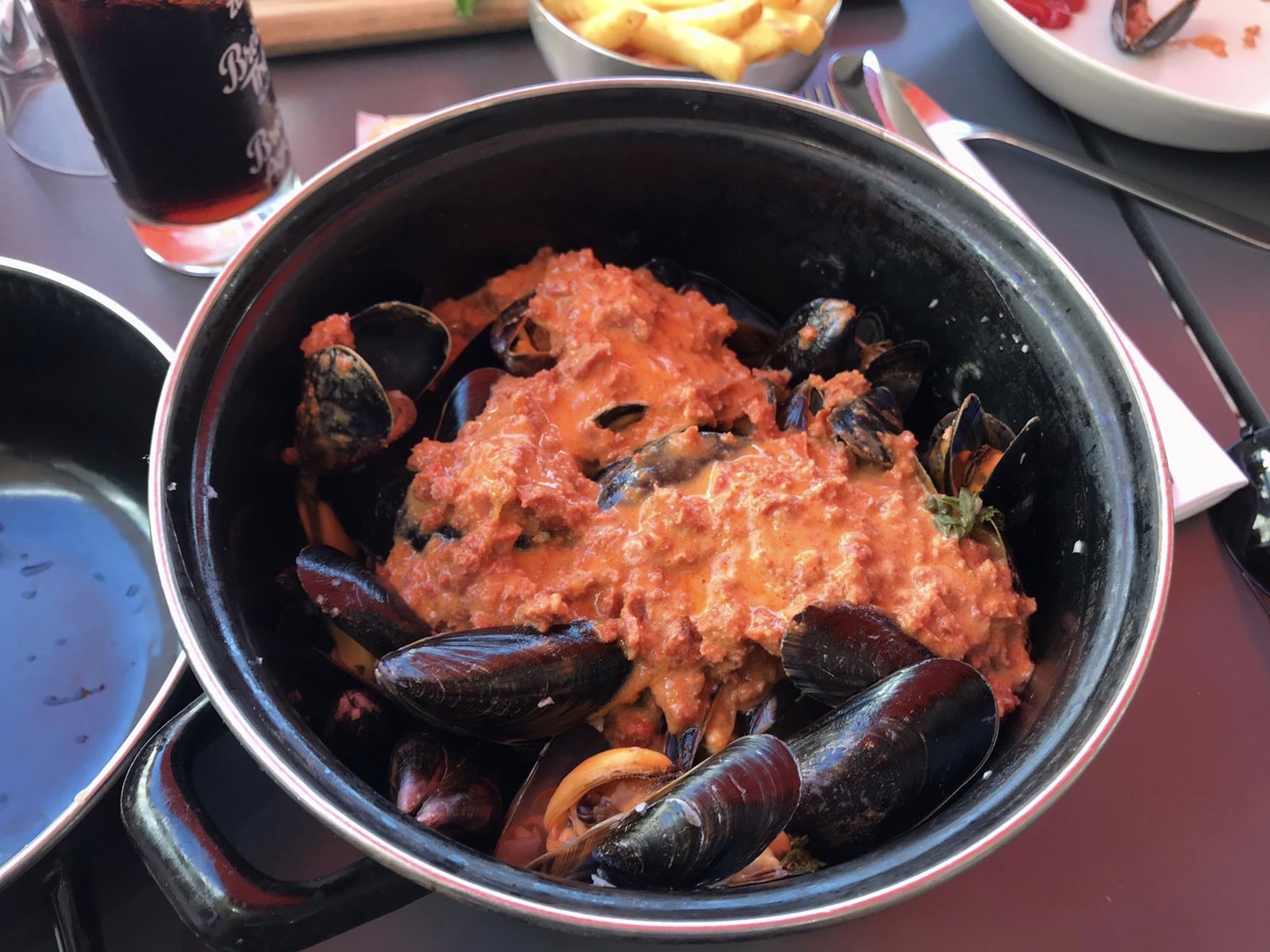 Accueil de serveur en terrase super sympa. On avons manger des moules frites. Chorizo et gorgonzola. Super bonne , dommage que les frites ne soient pas maison car la mayonnaise l était. Cependant le menu enfant reste cher je trouve pour ce qu il y a dedans 10€ par enfant ( nugget/frites, boisson avec un sirop dedans et une boule de glace)