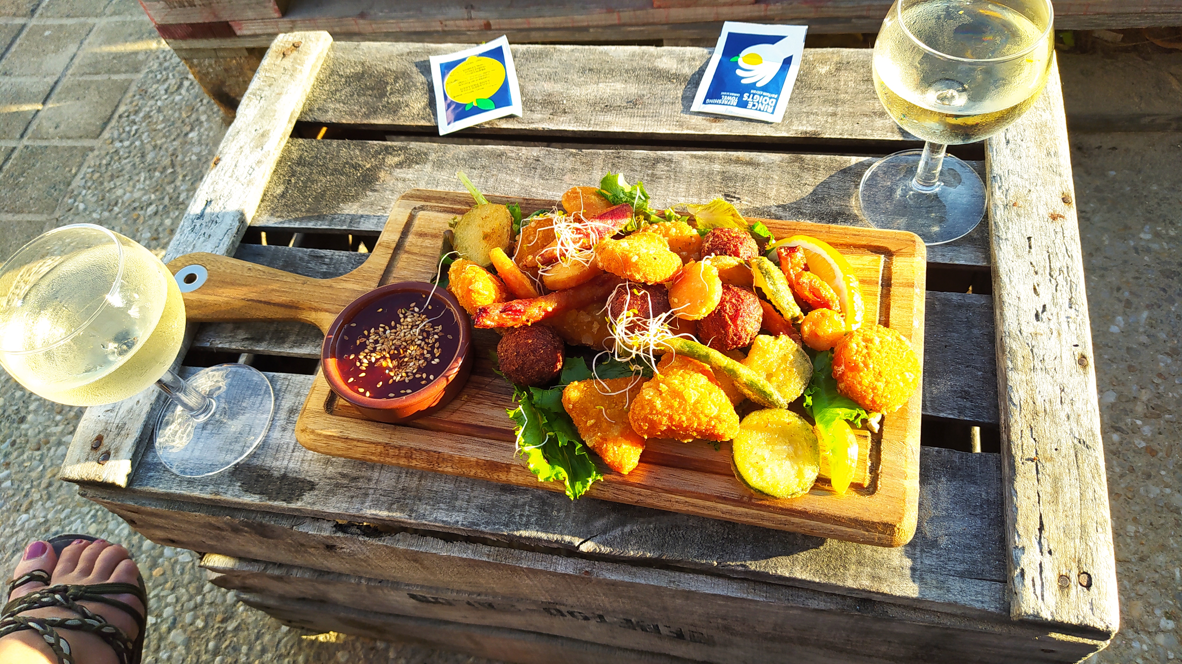 Dîner fin juillet. Friture en entrée nickel... Moules au chorizo...a oublier ! Des énormes morceaux de chorizo sur des moules .. boffff lourd ...
