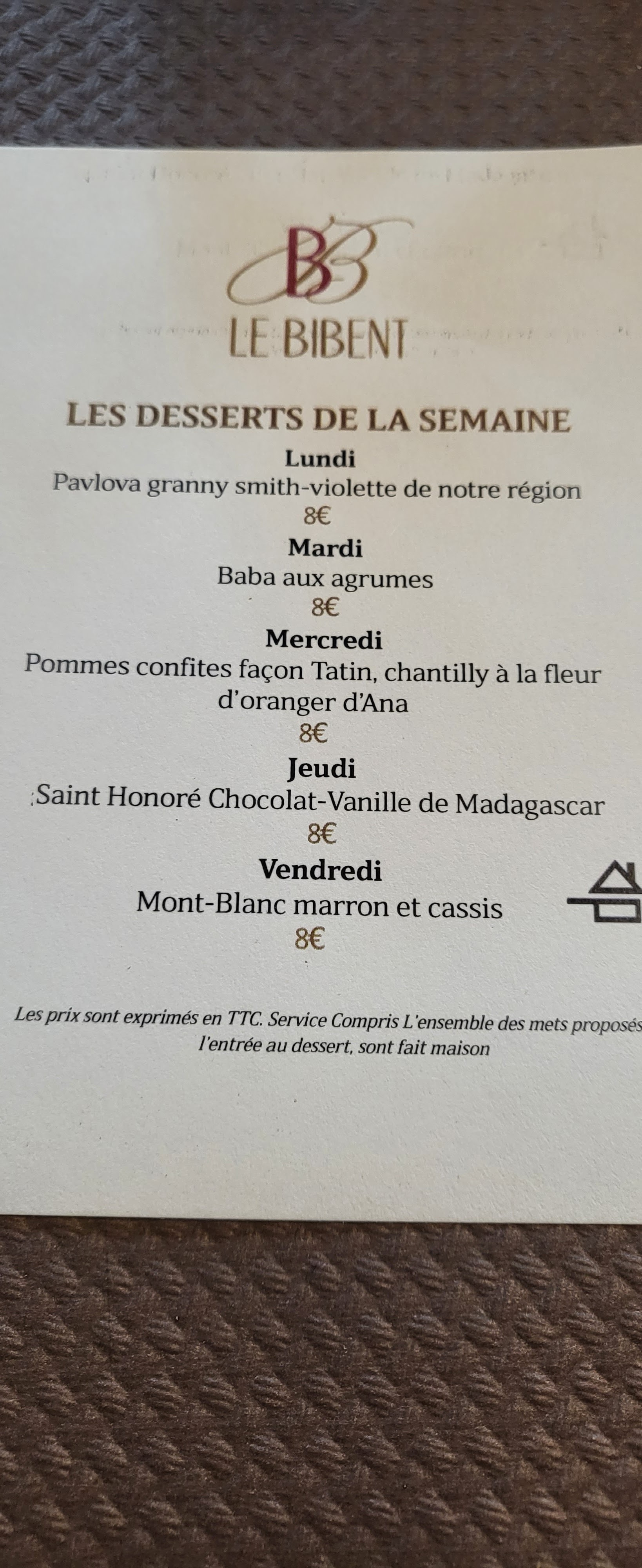 Une super expérience au Bibent. Il n'y a rien à redire suite à notre repas. Les plats étaient très goûteux et le service au top. Le tajin de pigeon est excellent et le veau d'une tendresse folle. Mention spéciale pour l'attention faite à ma femme à l'occasion de son anniversaire. Même s'il y a eu inversion de nos desserts (j'avais commandé la tarte framboise pistache et ma femme la tarte au chocolat), c'était fort appréciable et apprécié. Nous reviendrons.