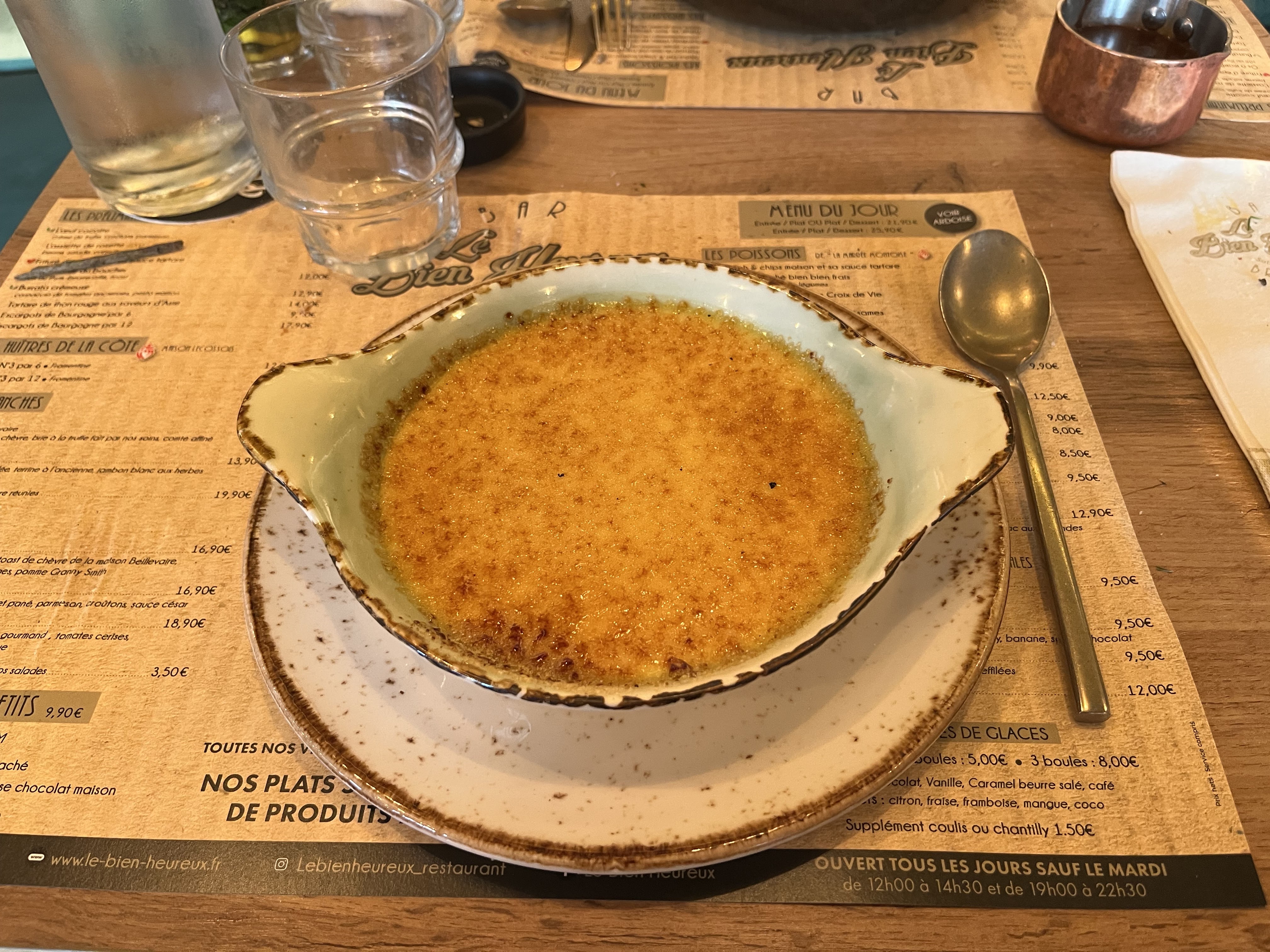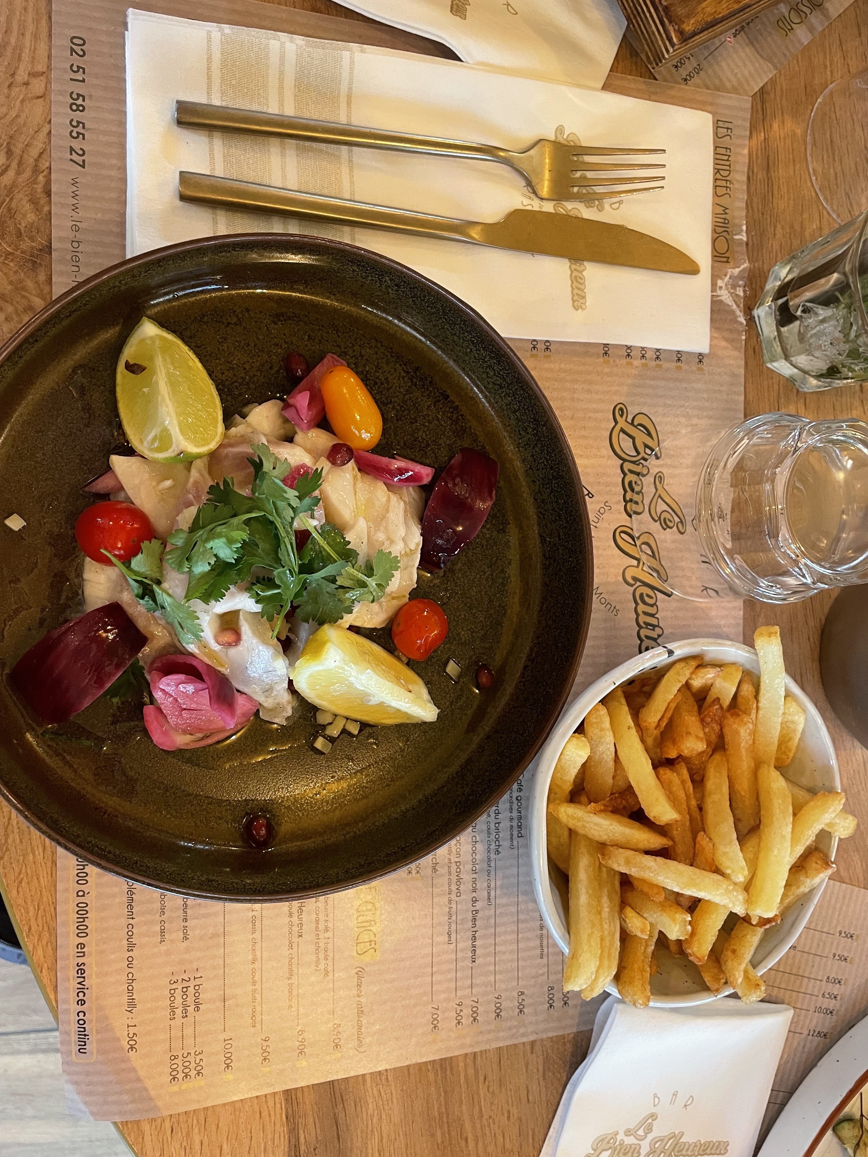 Que dire? Quelle magnifique adresse! Les sourires accueillant et la bonne humeur du barman et des serveuses sont expressifs et chaleureux. Du cocktail savoureux, en passant par l'œuf cocotte à la truffe divinement assaisonné (ne passez pas à côté). Plats copieux, moules délicieuses et frites maison. A grands regrets, plus de place pour un dessert. Nous reviendrons c'est une certitude. En conclusion, nom du restaurant fidèle au sentiment du client lorsqu'il en ressort : le bien heureux 😁