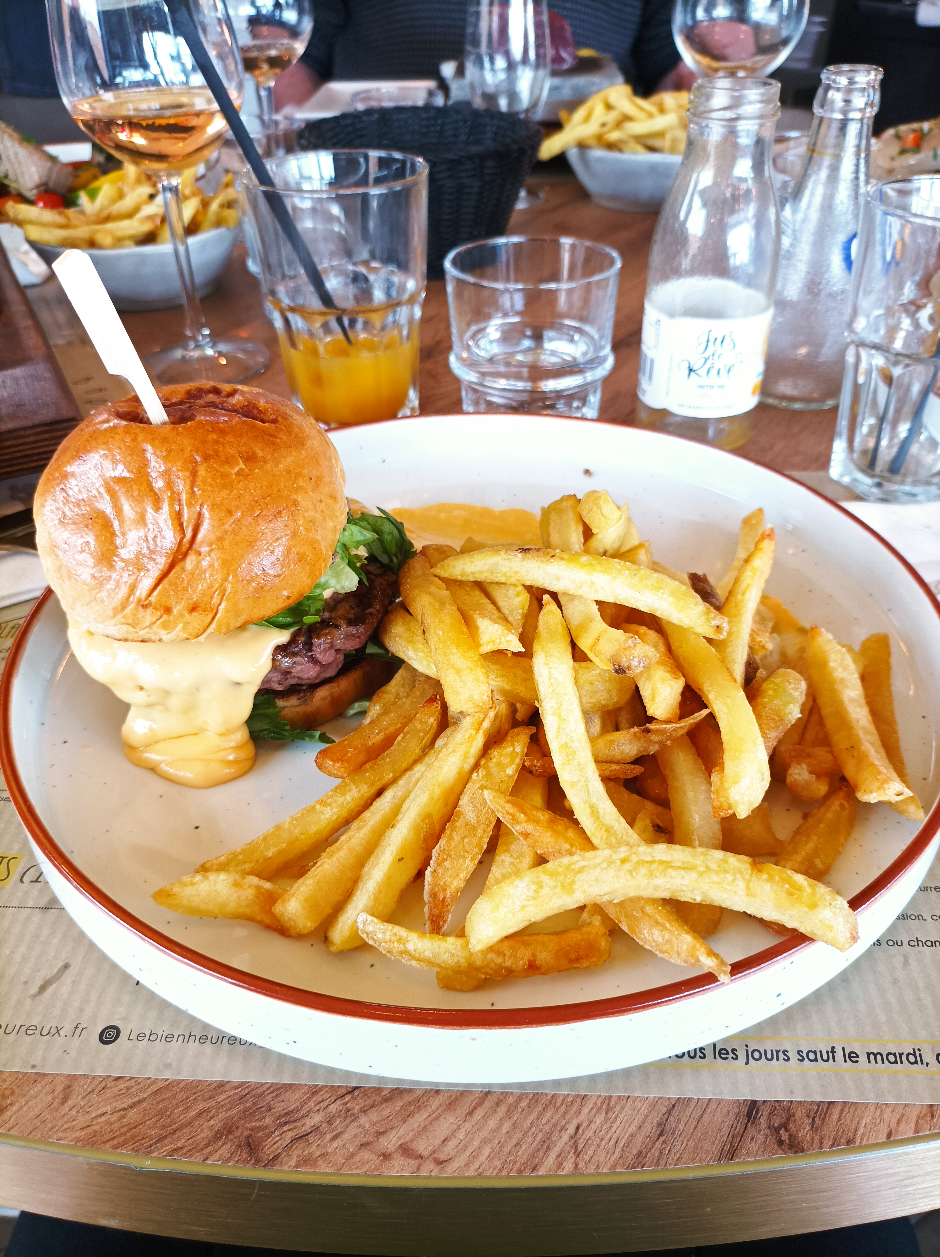 Alors pour commencer je dirais juste : INCROYABLE Le service très rapide, le personnel professionnel et très agréable, précis, ils connaissent leurs métier. Le restaurant en lui même est beau et sympathique pour un moment convivial! Quand à la cuisine… irréprochable, le goût, la présentation, la quantité ainsi que la qualité des produits servi sont vraiment là. Nous étions deux et nous sommes allés demander à l’improviste si ils avaient de la place, ils nous ont trouvé une table très rapidement et avec le sourire. Je m’adresse à vous, personnel du Bien Heureux, vous avez votre place dans mon top 3 des restaurants les plus qualitatifs que j’ai eu l’occasion de visiter, en tout points. Merci, et désolé pour les photos qui ne sont pas vraiment représentatives de vos dressages, à vrai dire nous nous sommes jetés sur nos assiettes avant de penser à capturer la qualité visuelle qu’elles représentaient ce qui prouve encore une fois l’appréciation que ma copine et moi avons eu à l’égard de votre travail. En vous souhaitant bonne continuation et.. à bientôt!!