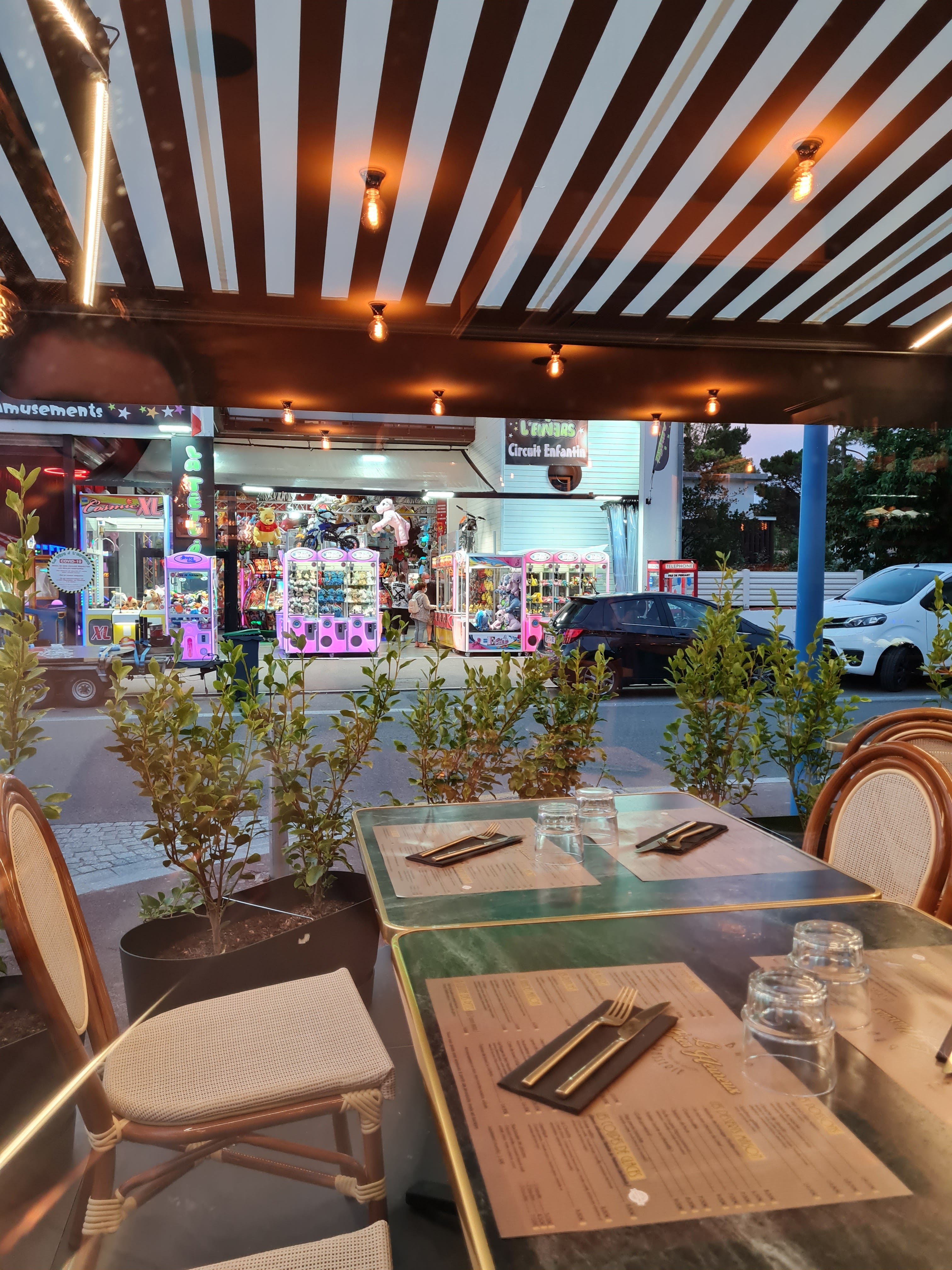 Déco sympa, en revanche c'est juste en face d'une salle de jeux ouverte donc relativement bruyant. Le personnel n'est pas très souriant. Venus pour un apéro on a trouvé un peu chères les boissons et planches par rapport à ce qui est servi... plutôt niveau quantité parce que la qualité est là. En revanche, très surpris de voir les serveurs refuser une famille qui se présente pour manger à 19h alors qu'à le resto était vide (ils sont revenus 30 minutes plus tard) et également un groupe de 10 personnes venues prendre l'apéro alors qu'il n'y avait personne qui est reparti alors que le resto était vide...!? De même, entré dans le resto pour payer j'ai attendu face à un barman occupé à ses petites affaires et qui ne s'est pas du tout préoccupé de moi : j'ai du attendre qu'un autre barman vienne encaisser. Aucune demande de pass sanitaire... les serveuses avaient bien leurs masques mais derrière la comptoir, à l'intérieur... aucun masque pour les 2 barman.