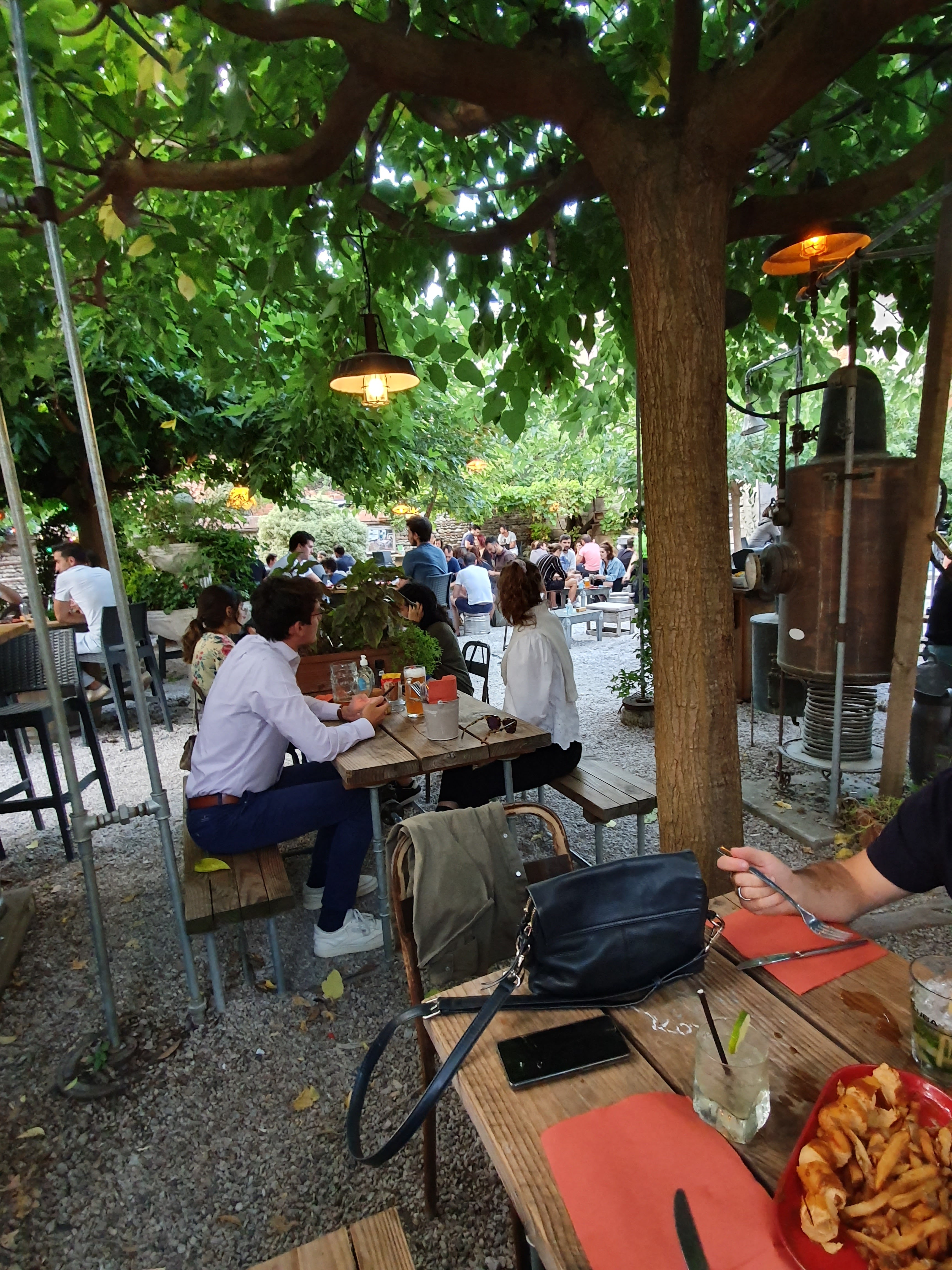 C'est un endroit qui ne paye pas de mine au début (une toute petite entrée, un aspect couloir) et puis on découvre une arrière cour magnifique, grande, rare pour le centre ville, bien aménagée, avec de grandes tables pour les groupes mais aussi des endroits plus intimistes avec des coussins le long d'une fausse cheminee de bon ton ou des chaises hautes. Les boissons sont variées (pas que de la bière même si évidemment c'est LA spécialité donc il vaut mieux aimer) et la nourriture est plutôt bonne pour des prix cohérents. Bref, un endroit à fréquenter aux beaux jours surtout pour son jardin et ses bières évidemment 😋