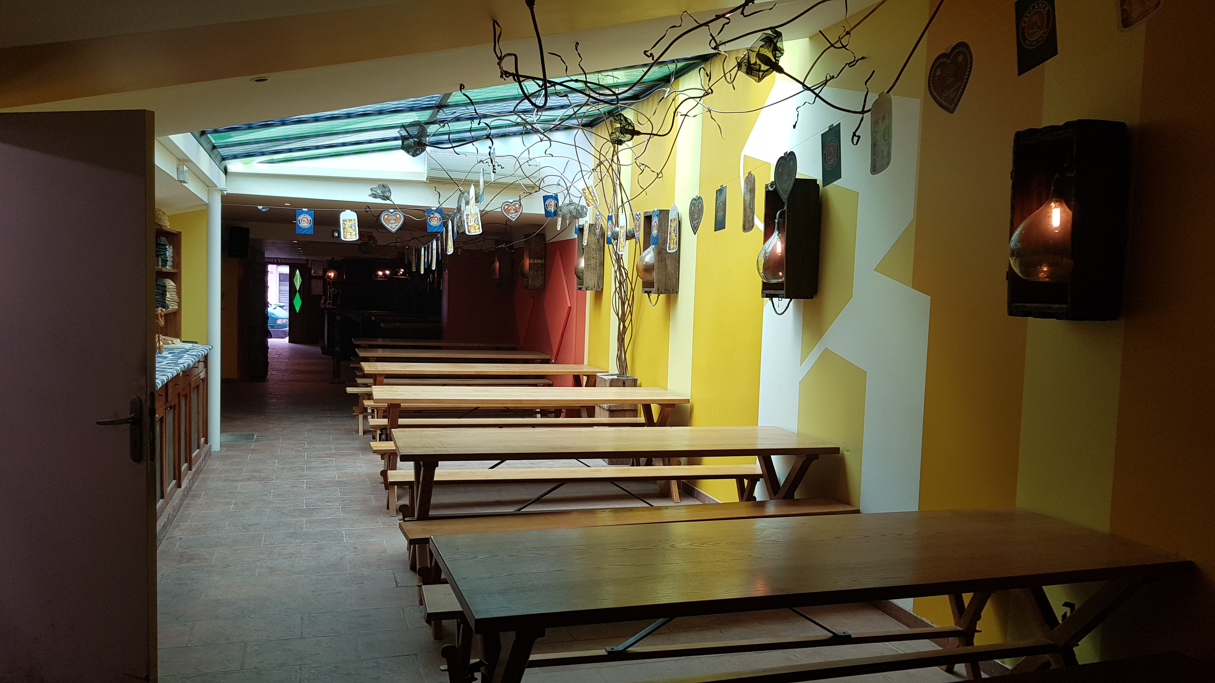 Bar avec des tables organisées comme dans les brasseries allemandes. Lieu de retrouvailles des jeunes. Pas une ambiance de folie quand même.