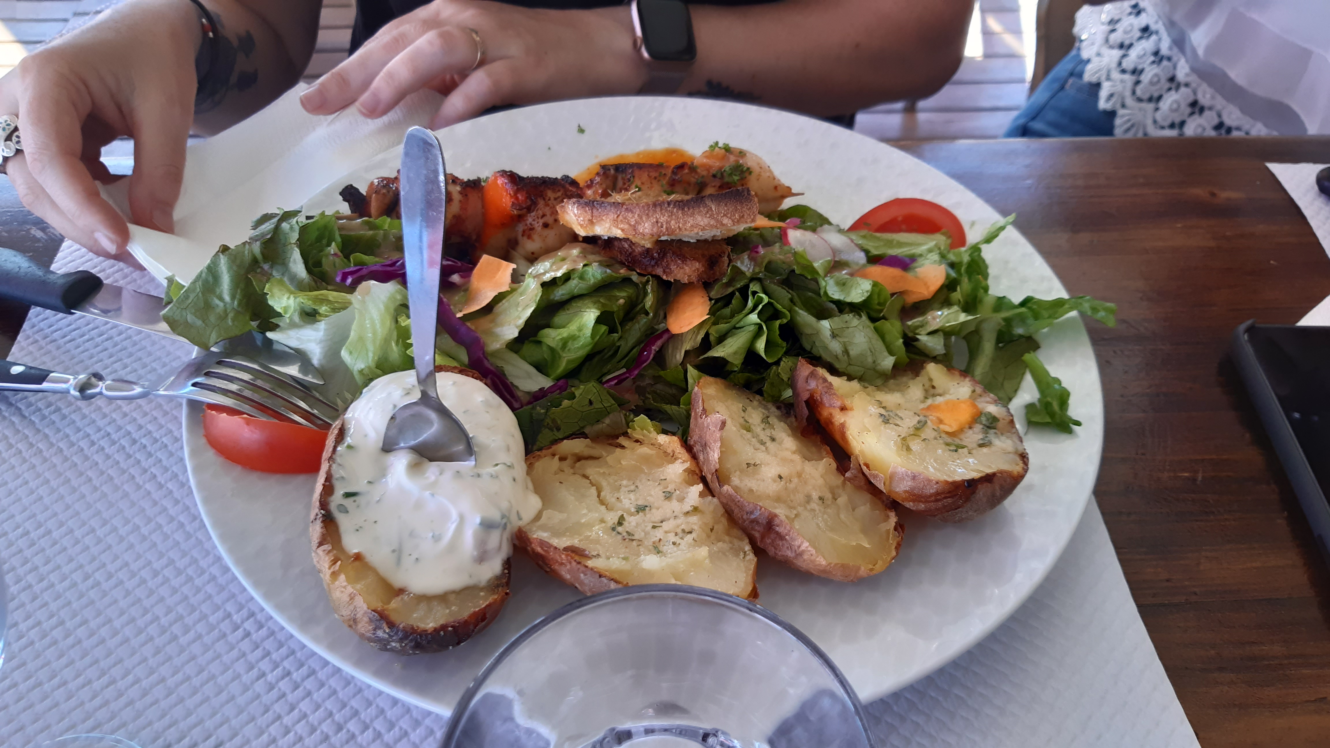 Un déjeuner ensoleillé avec une vue panoramique sur la mer, des délicieuses sardines grillées accompagnés de pommes de terre et de salade verte et un personnels chaleureux et compétents, simple et efficace, j'y ai passé un très bon moment !