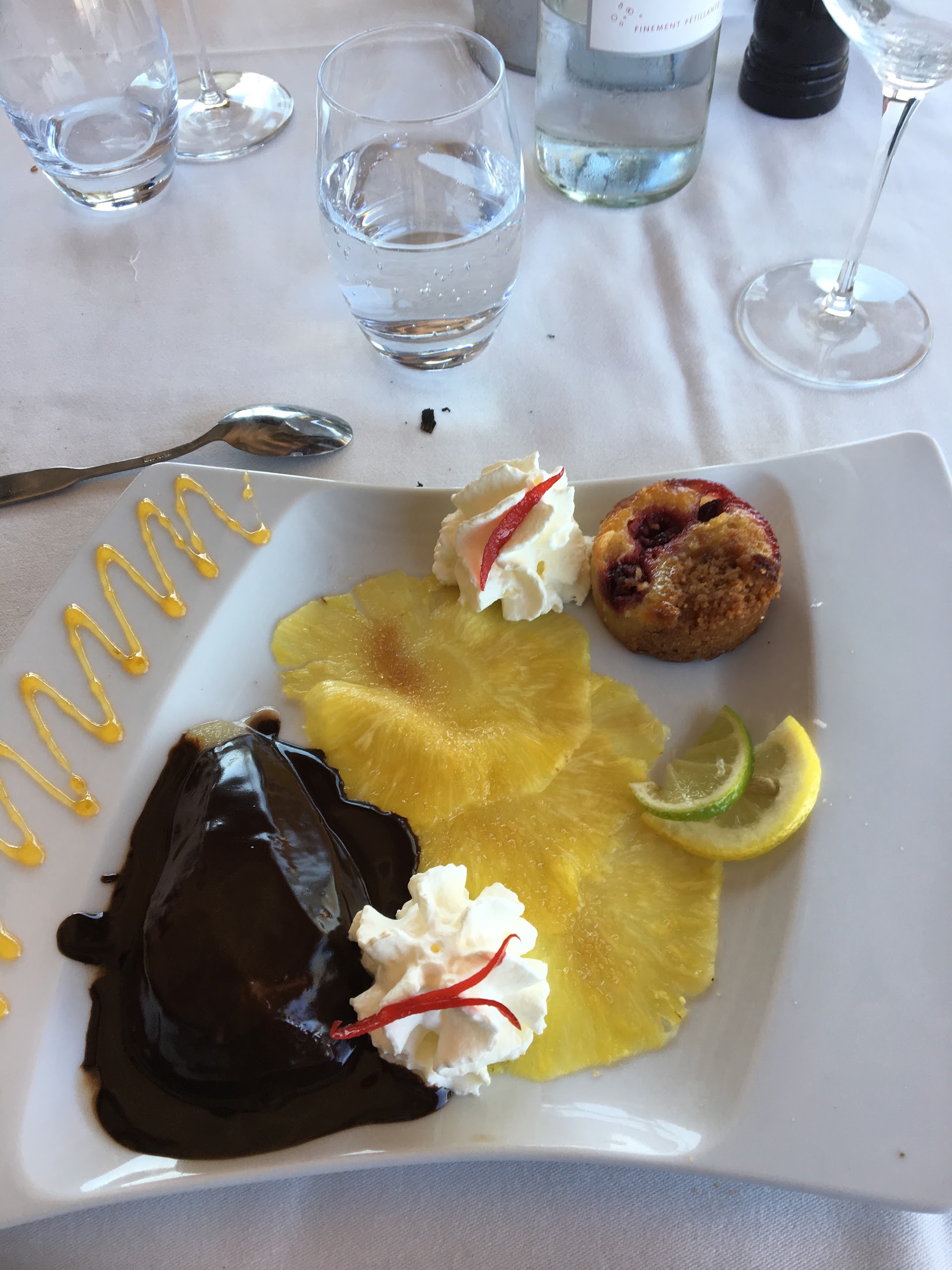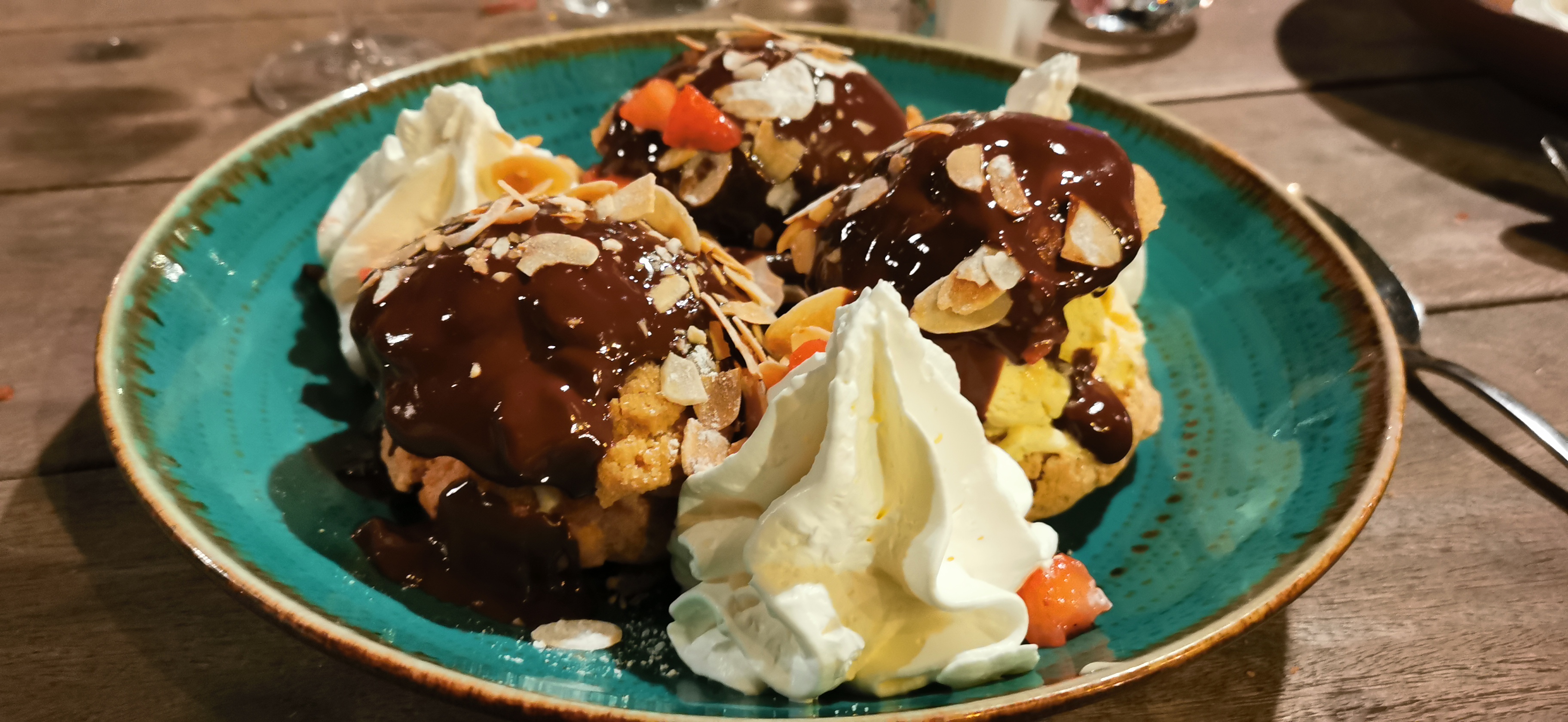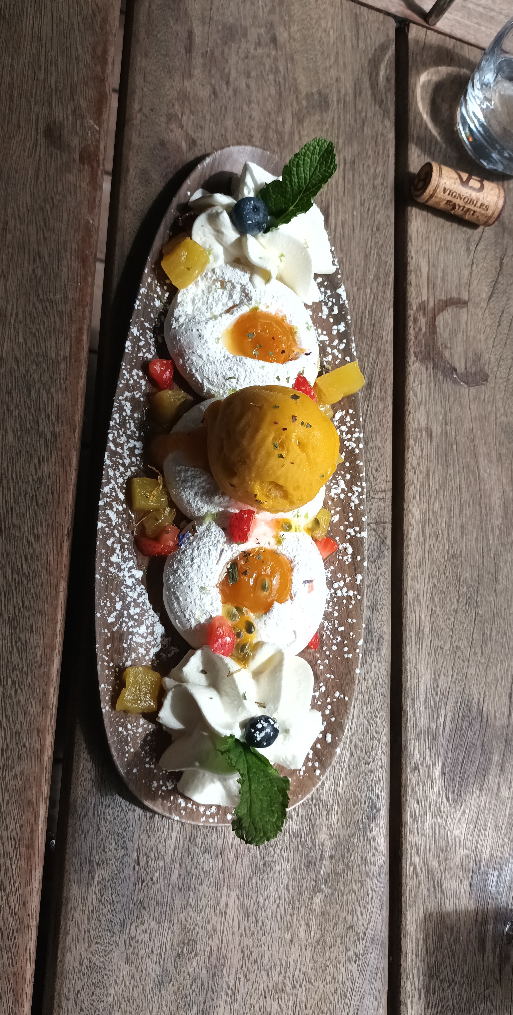 Restaurant avec une superbe terrasse idéale pour un coucher de soleil, les plats sont copieux, surtout les profiteroles