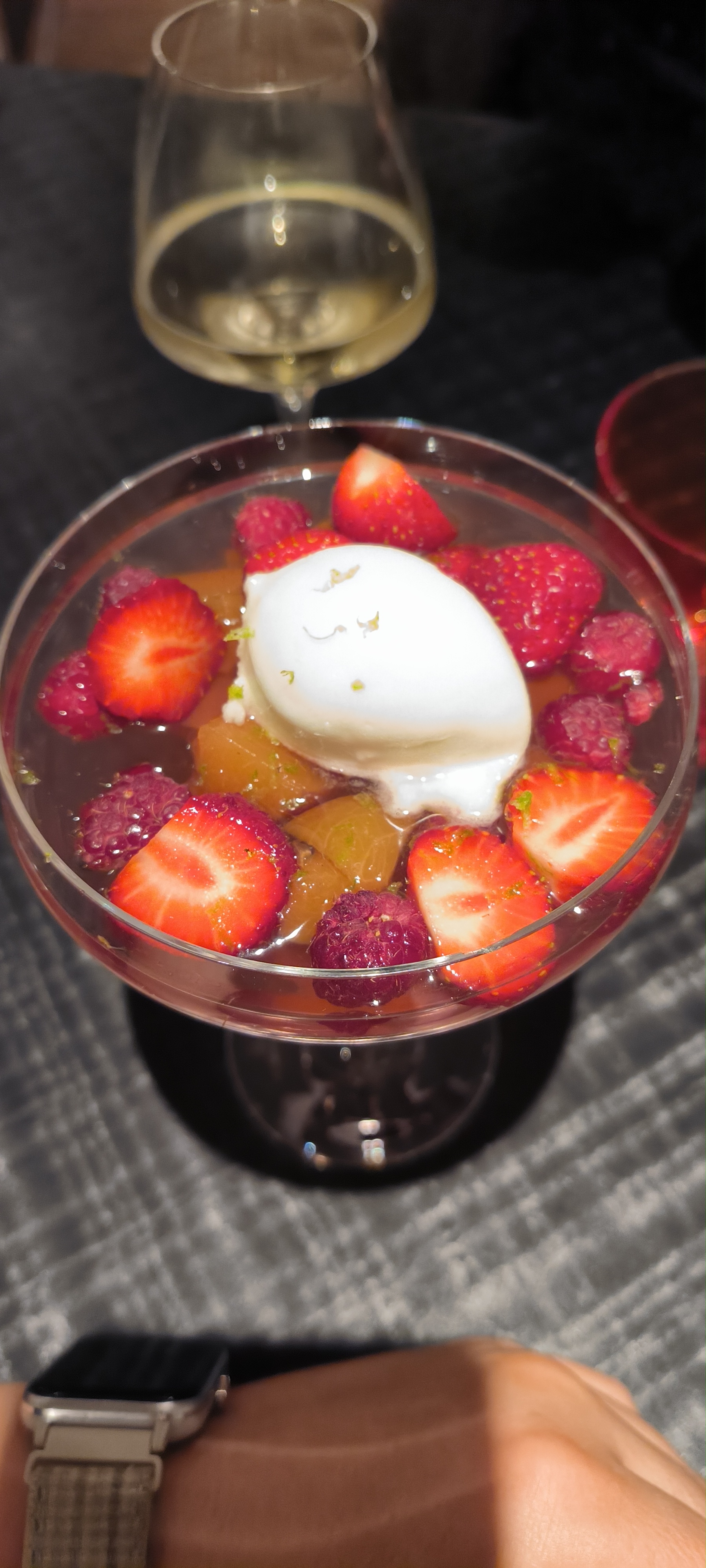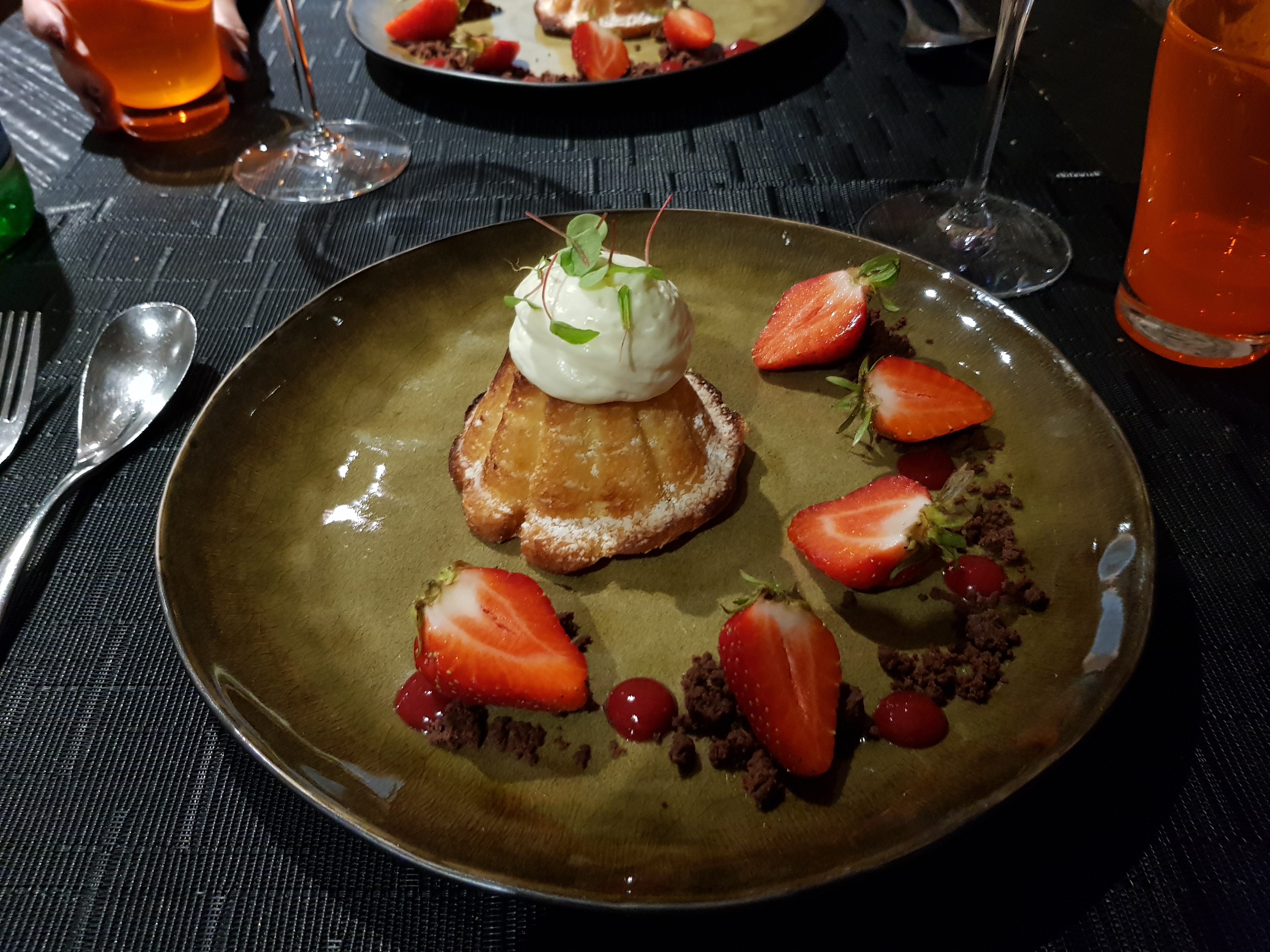 Il ne suffit pas d'avoir de belles assiettes bien décorées, les saveurs doivent être plus recherchées, quelques fraises et des morceaux de rhubarbe ainsi qu'une boule de glace n est pas digne d'un repas à ce prix .repas trop cher pour la prestation.