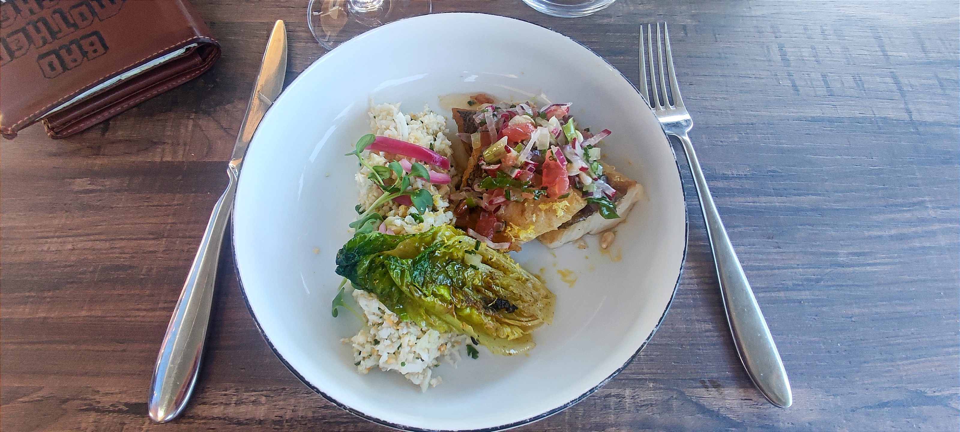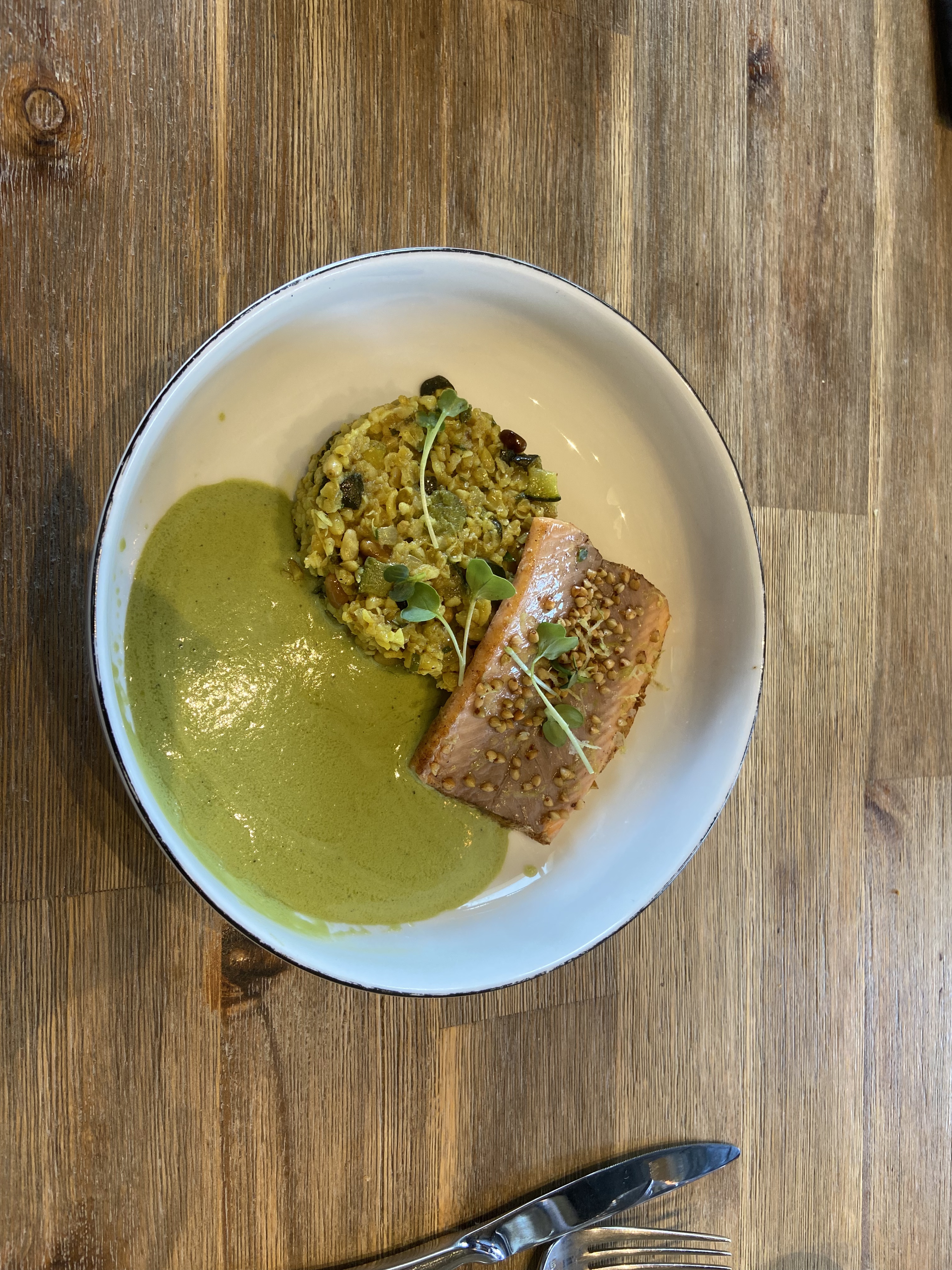 Plat très goûteux. Je n'ai pas l'habitude de manger du poisson. La façon dont il est cuisiné le rend très goûteux avec l'accompagnement très équilibré et se marient très bien avec le poisson. En plus le restaurant est petit et très ouvert, j'ai l'impression de manger dans mon salon, en plus je vois mon plat être cuisiné devant moi. Ça met en confiance. Ça donne trop hâte d'être servi. Détail important, le bruit ambiant est équilibré. Je recommande vraiment ce restaurant !