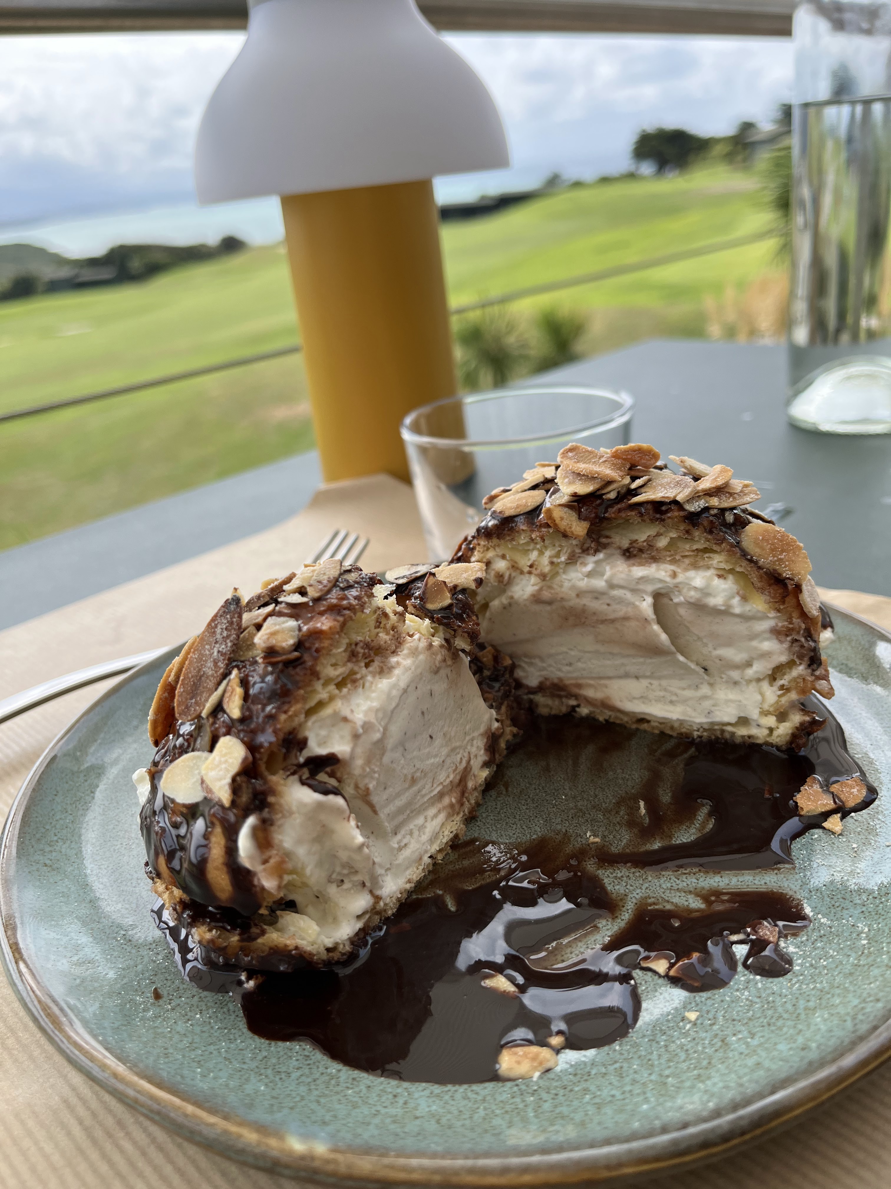 Restaurant en lisière des parcours du centre international de golf, avec terrasse semi-circulaire et large vue sur la côte et sur l'océan. Plats variés, frais, bien présentés, bon service.