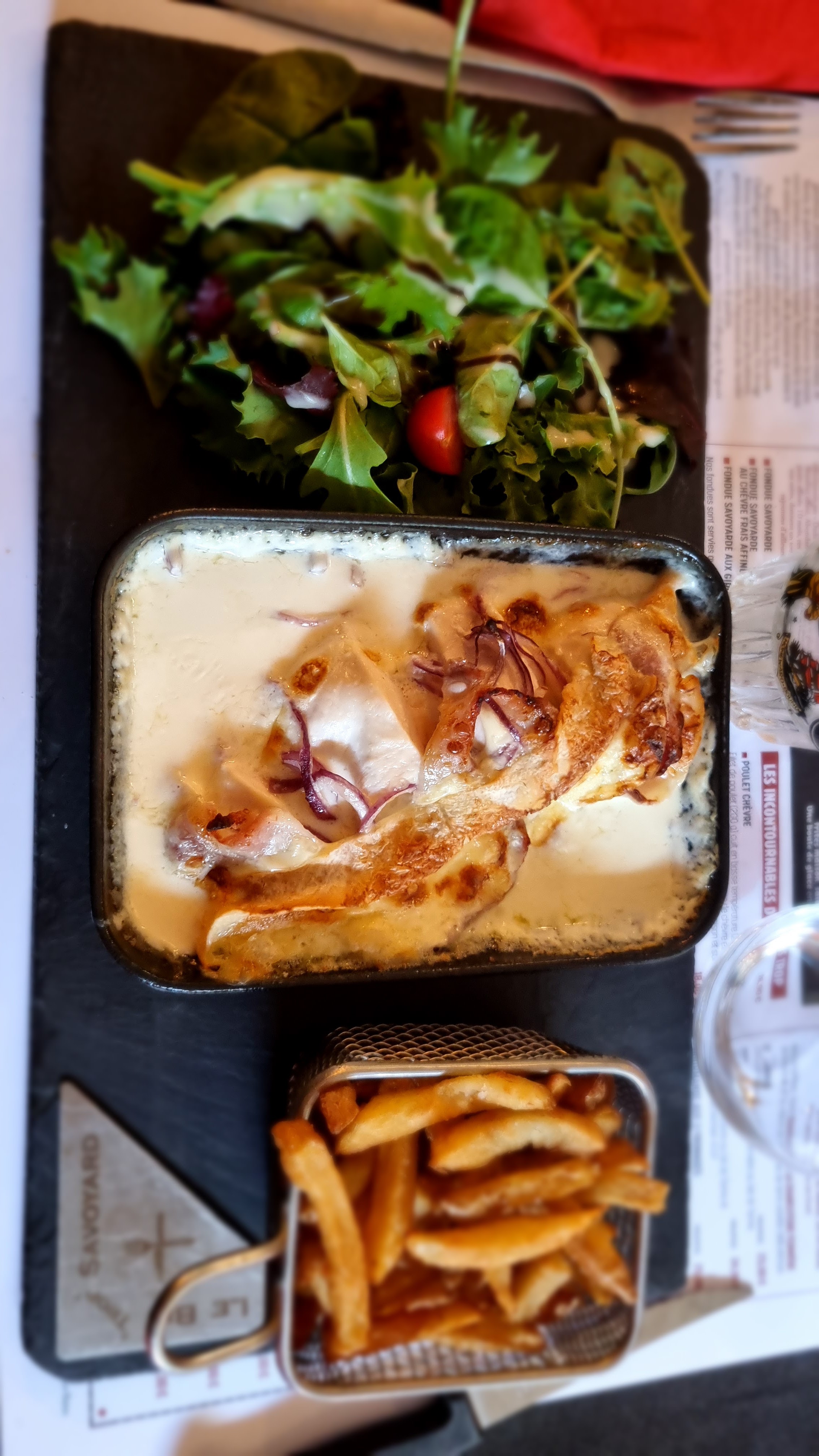 On s'attend à un cadre bien plus savoyard vu le nom et la salle est bruyante avec beaucoup de passages. Plats et tarifs corrects.