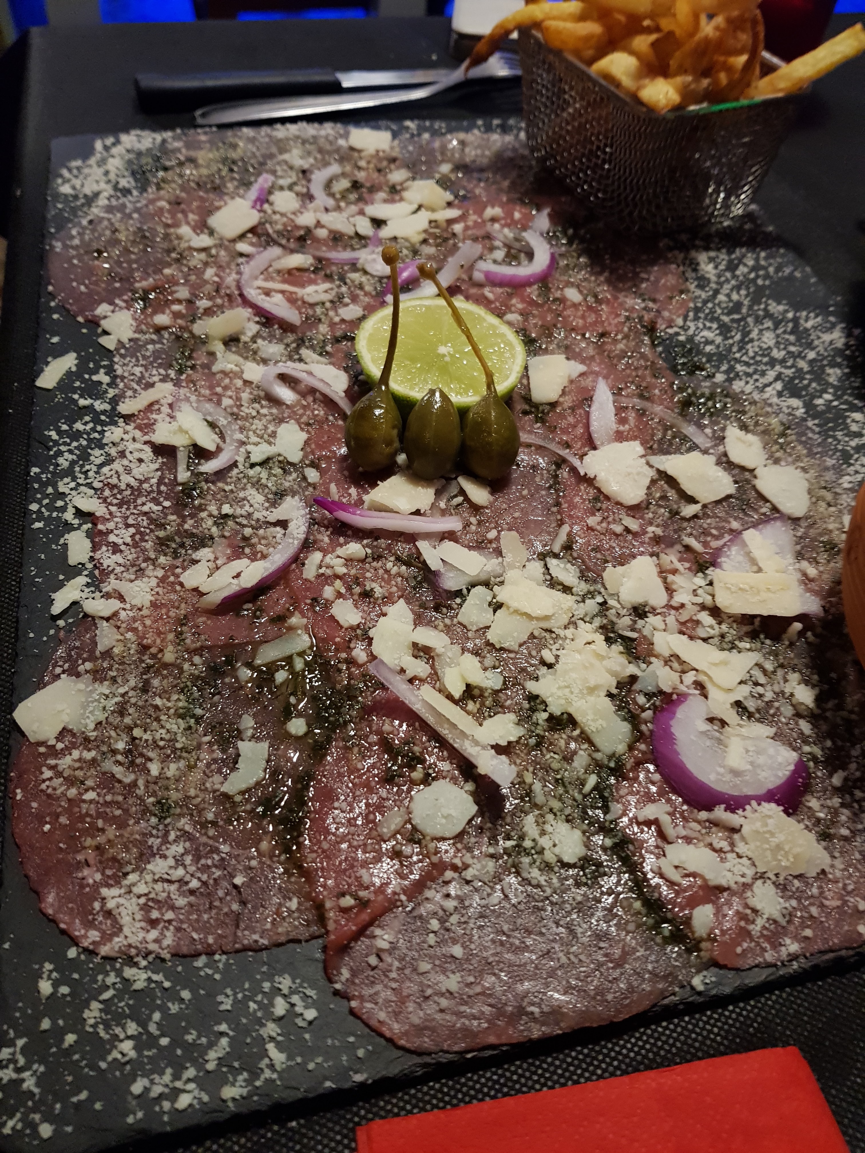 Superbe ambiance ! Personnelle accueillant et a l'écoute. N'ayant pas réservé nous pensons essuyées un échec... et bien pas du tout... Apéros personnalisé en fonction de la demande de ma femme. A table, produits de qualité je recommande vraiment ! Nous avons goûter à l'entrecôte et au carpaccio de bœufs et nous nous Sommes régalé. Cuisson parfaite, comme demandé. Les frites sont faites maison et excellentes (paroles de ch'tis) Ps: petit remerciement pour l'irish coffee qui n'est pourtant pas sur la carte, qui a était fait avec amour et que j'ai vraiment apprécié. Pour finir le rapport qualité prix et très acceptable. Étant motard je n'hésiterai pas à repasser par la a l'occasion et en attendant je recommande sincèrement. Merci à toute votre équipe