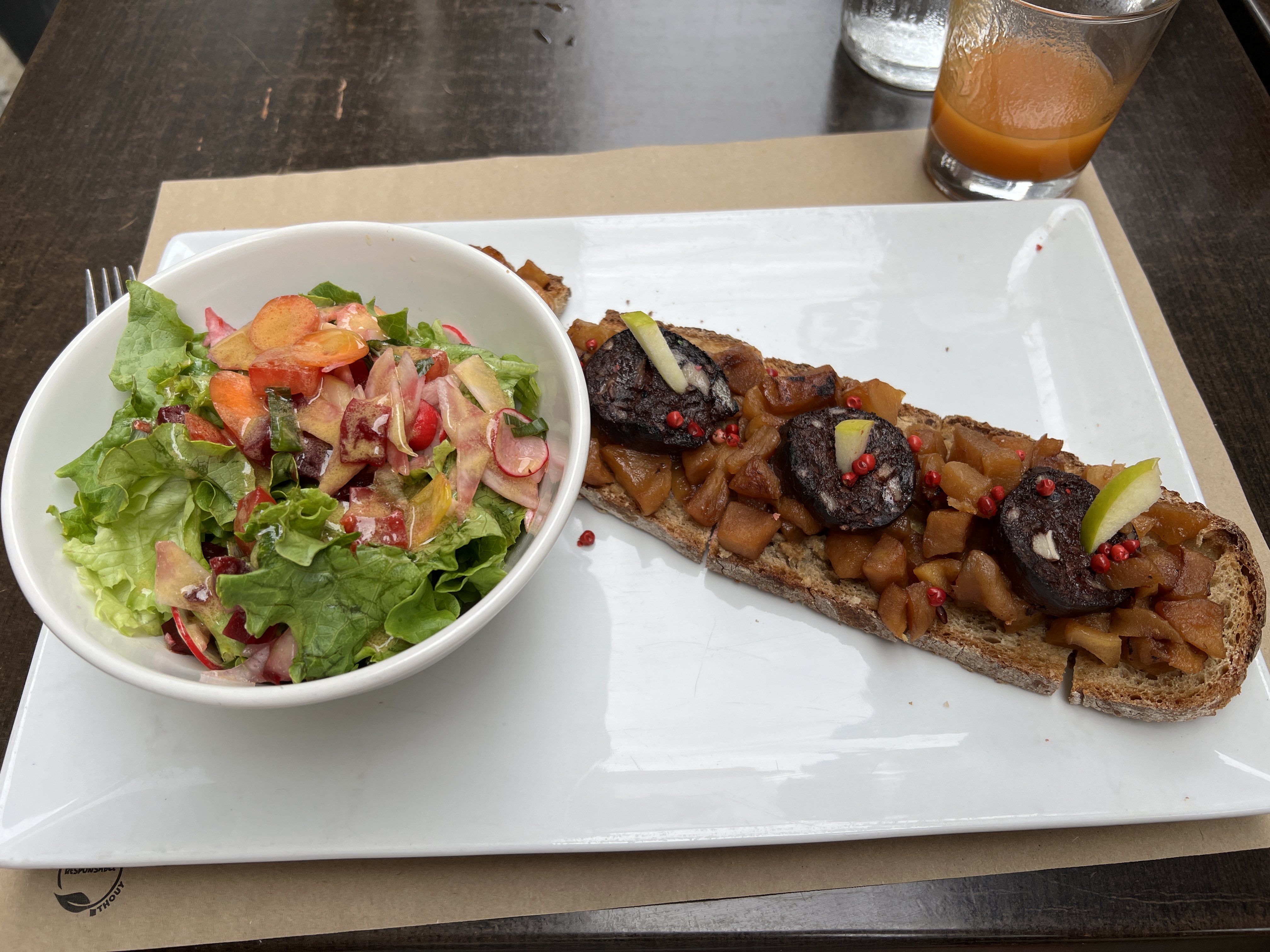 En photo, la délicieuse brioche façon pain perdu. Personnel accueillant et sympathique. Large choix de tartines élaborées avec des produits de qualité et accompagnées d’une soupe ou d’une salade. Végétarien accepté. Seul bémol, pour « la terroir », des tranches de boudin noir un tout petit peu plus épaisses permettraient d’en apprécier plus amplement le très bon goût. Un plat du jour excellent. Côté boissons, des bières de brasseurs locaux, un bon choix de vin de la région. Bon service. Bon rapport qualité-prix. À essayer sans hésitations.