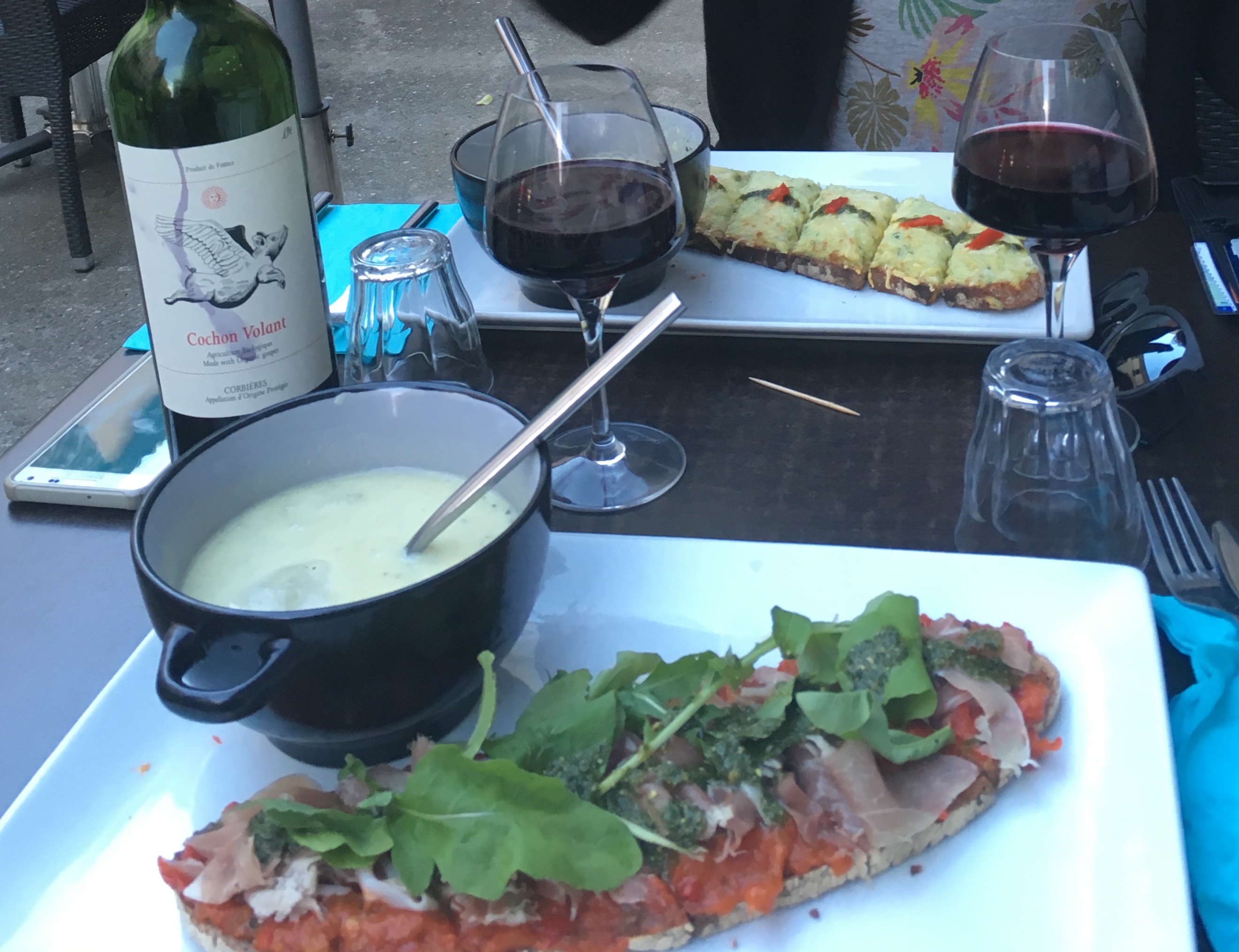 Restaurant bien situé, dans une petite ruelle calme à Carcassonne. Le monsieur au tablier jaune (peut-être le patron ?) est très sympathique, souriant, etc.. Nous avons commandé la tartine au fromage et la tartine pancetta, le tout accompagné d’une soupe froide courgette ricotta-menthe, très bon ! Seul petit bémol (mais je chipote peut-être un peu), pas sûre que le thé blanc en était vraiment ; il était très foncé et sentait très fort, tandis que le thé blanc est censé être très légèrement coloré, voir même transparent… Peut-être a-t-il été malmené avec une eau bouillante, ou bien était-ce un mélange thé noir/thé blanc ? En tout cas à part ça, très sympa pour un petit dîner romantique, et la serveuse est très sympathique !