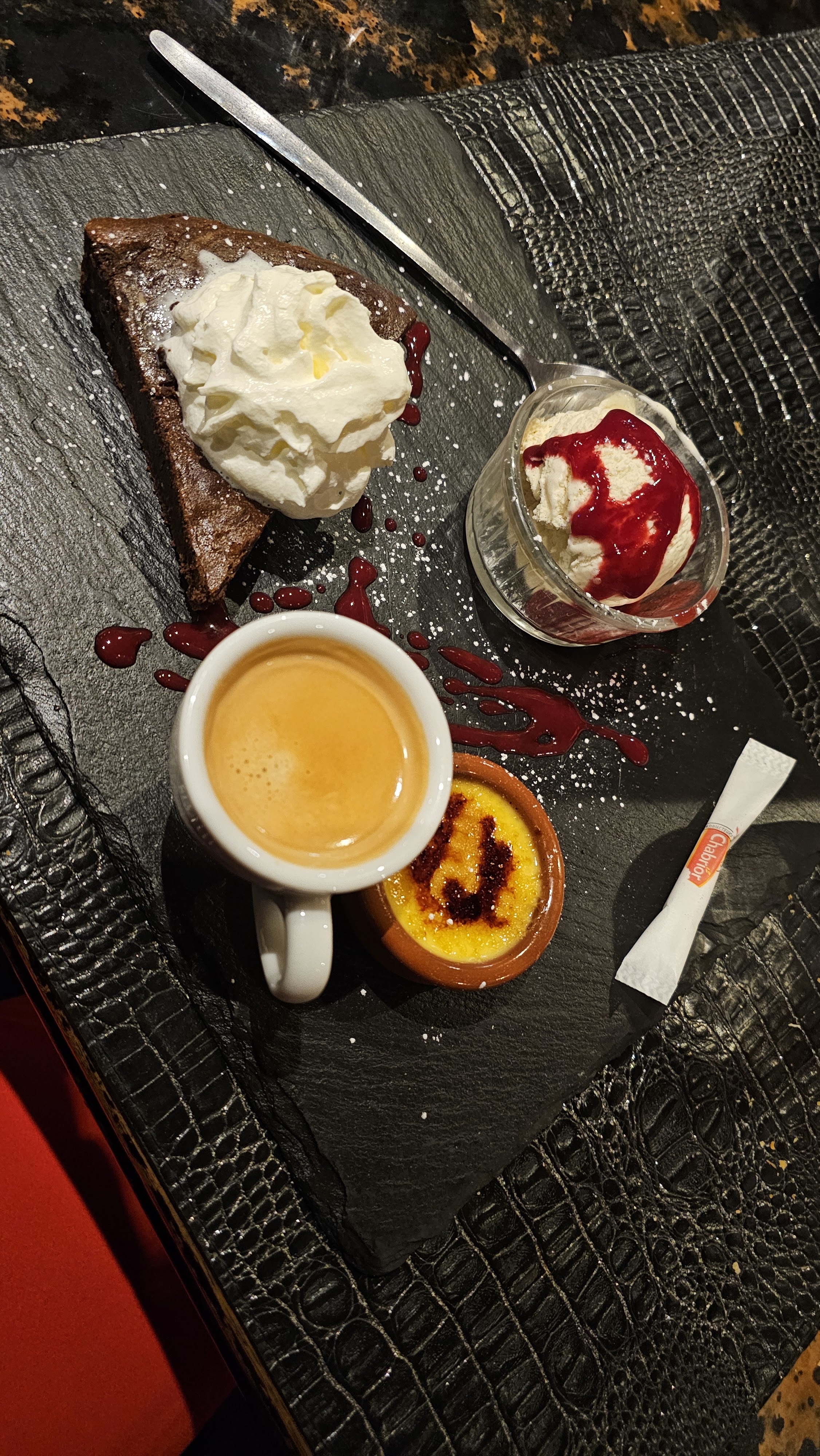 Le vin et le café étaient excellents. Intérieur intéressant, service très sympathique.
