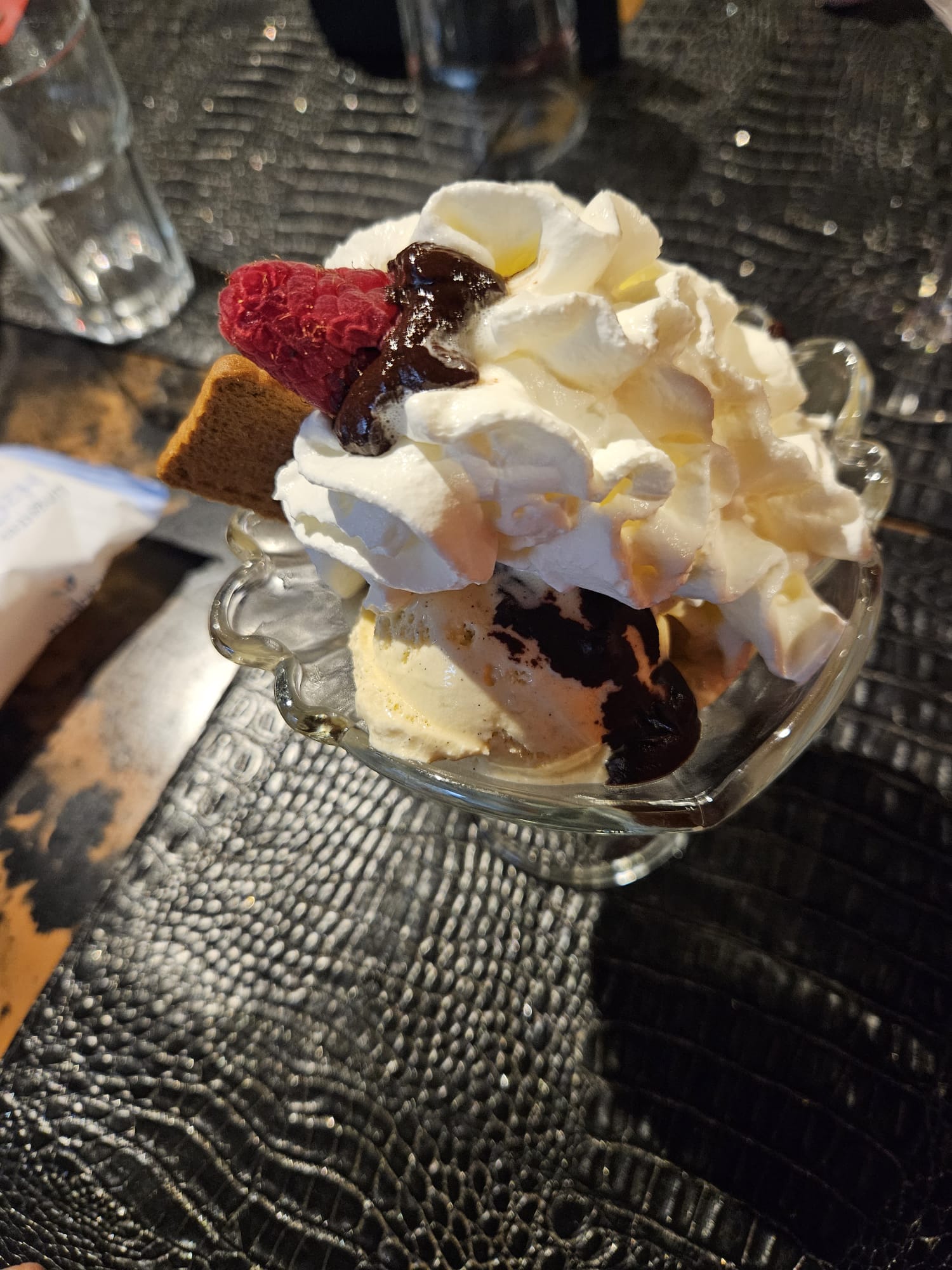 Cuisine sans finesse et chère. Le cuisinier remplace la qualité par la quantité. Nous avons mangé au mieux que la moitié de nos plats. Part conséquent, bien sûr, exit les desserts... En plus, dîner avec le son d'une grosse radio commerciale à l'humour gras, bof... Moyennement glam'... Restaurant dispensable. Peut-être pour ça qu'il était si vide quand tous les restaurants alentours affichaient salles combles...