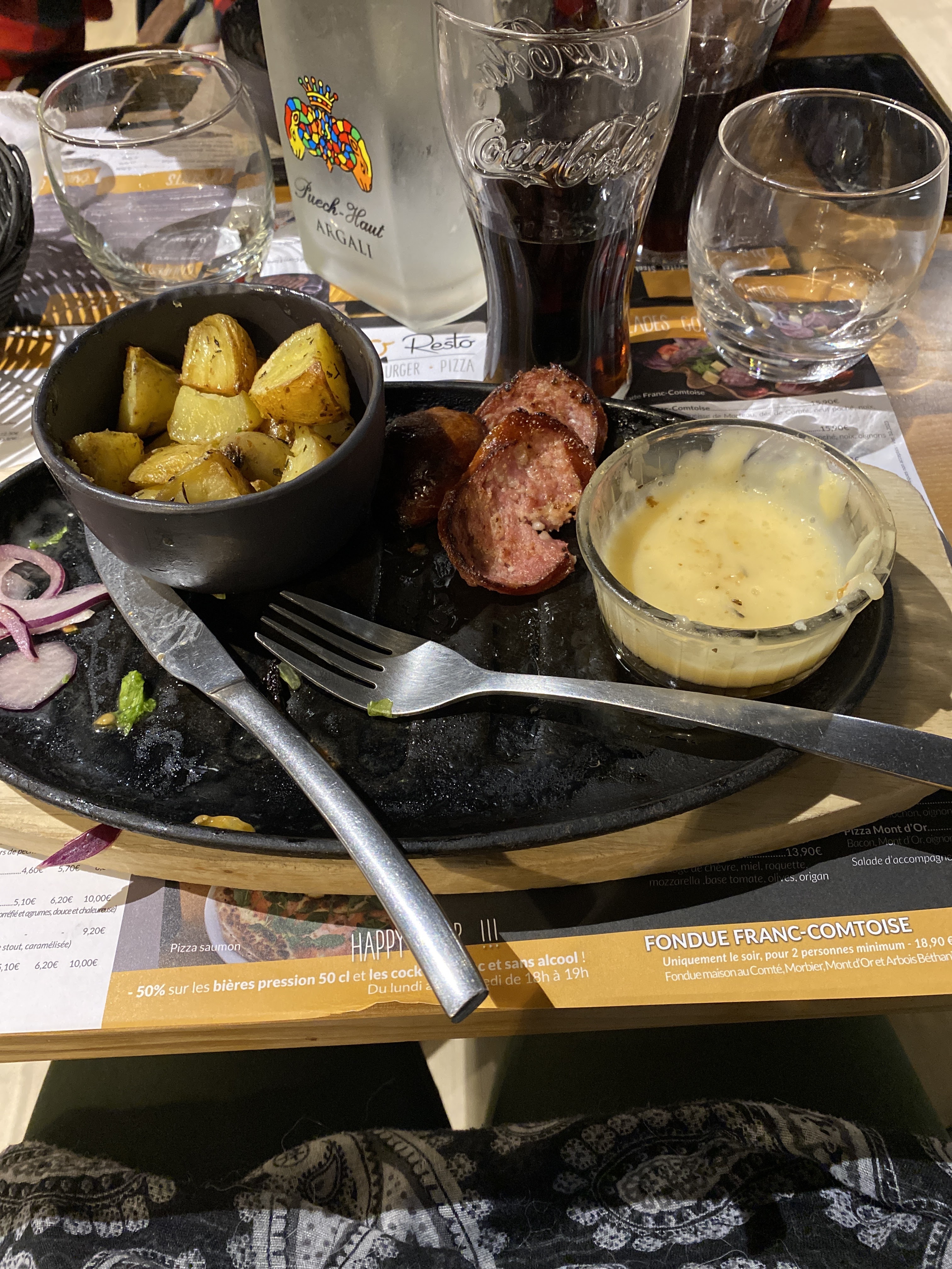 Attente très longue pour être servie, mon verre a le rebord casser. Au niveau du plat un poelon franc comtois les pomme de terre sont dures et la cancoillotte un goût qui laisse à désirer et une couleur étrangement foncé.. Très décevant dans l’ensemble je repars sur ma faim.