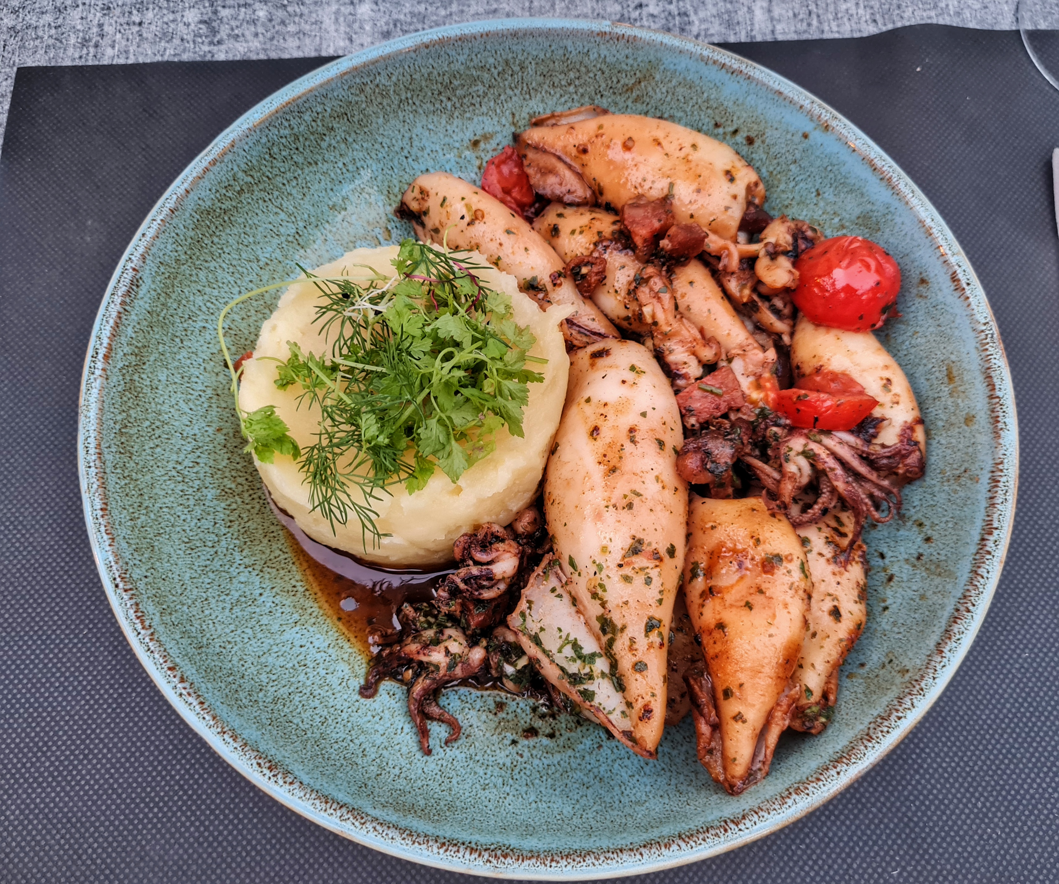 Repas bon et bien présenté mais que ça soit les encornets ou le duo de poisson, c’était presque froid… dommage !!