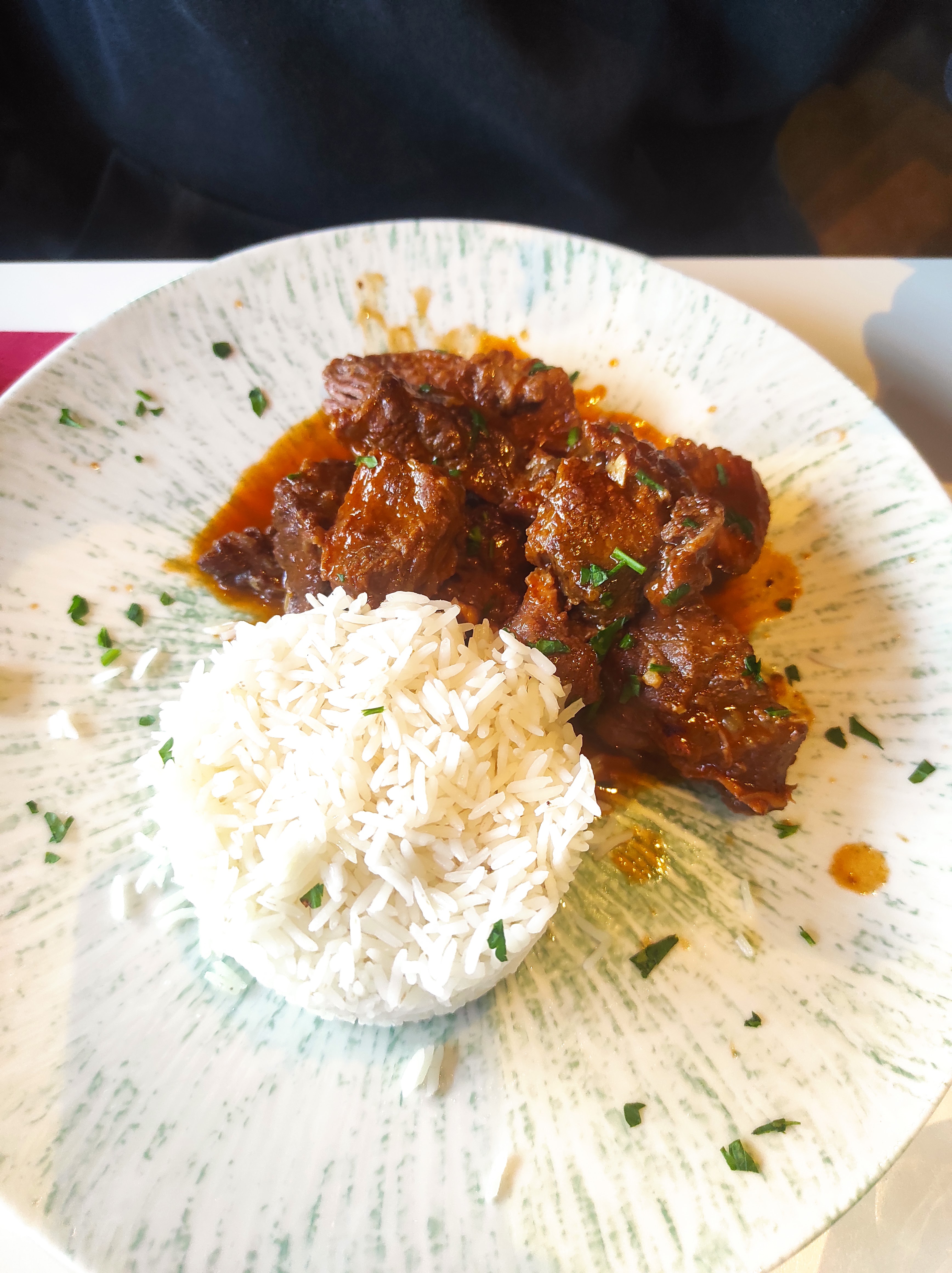 Très bon déjeuner au bistro 21 Je me suis régalé avec le plat du jour : porc au curry servi avec du riz, la tarte poire chocolat était délicieuse