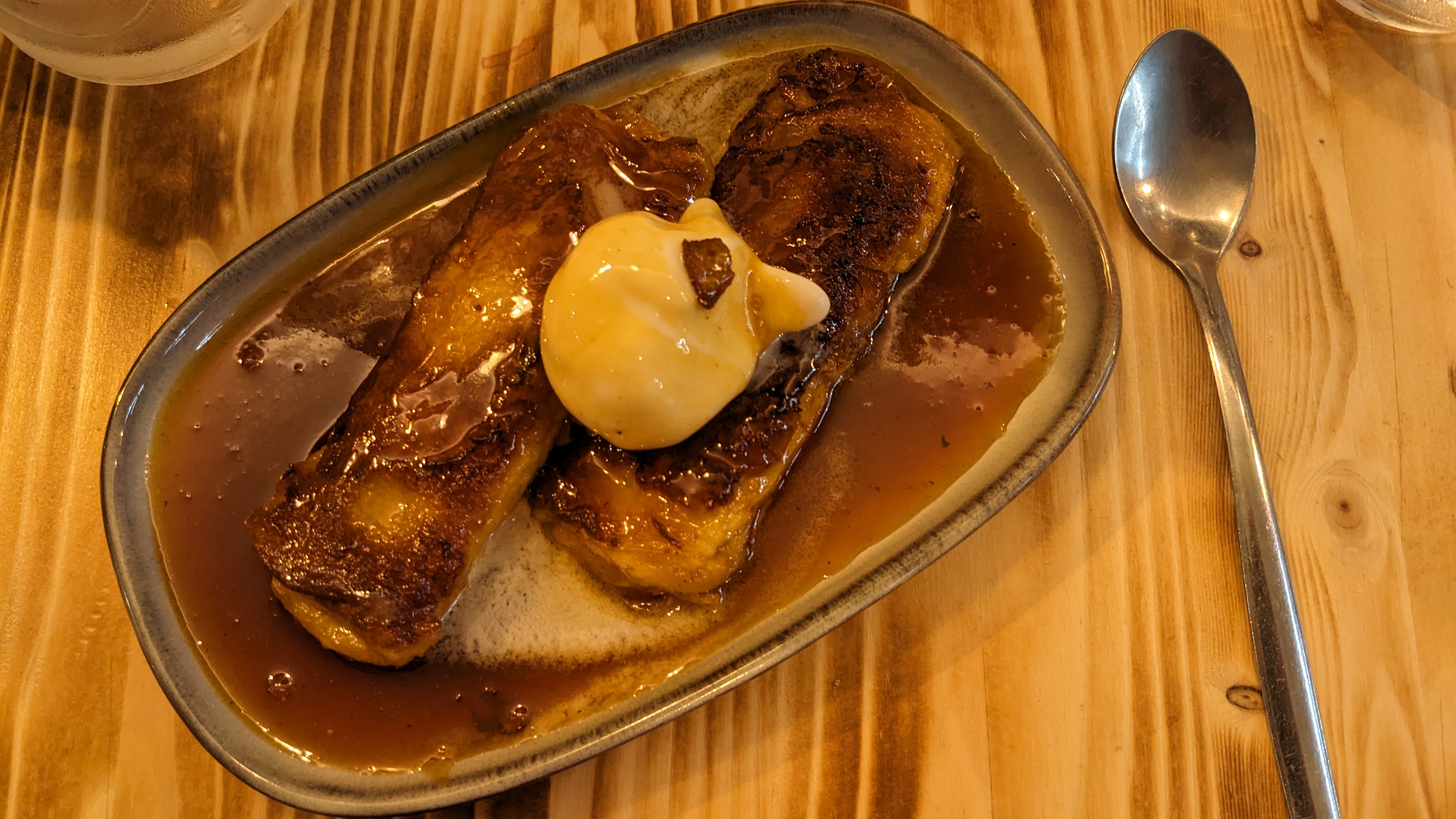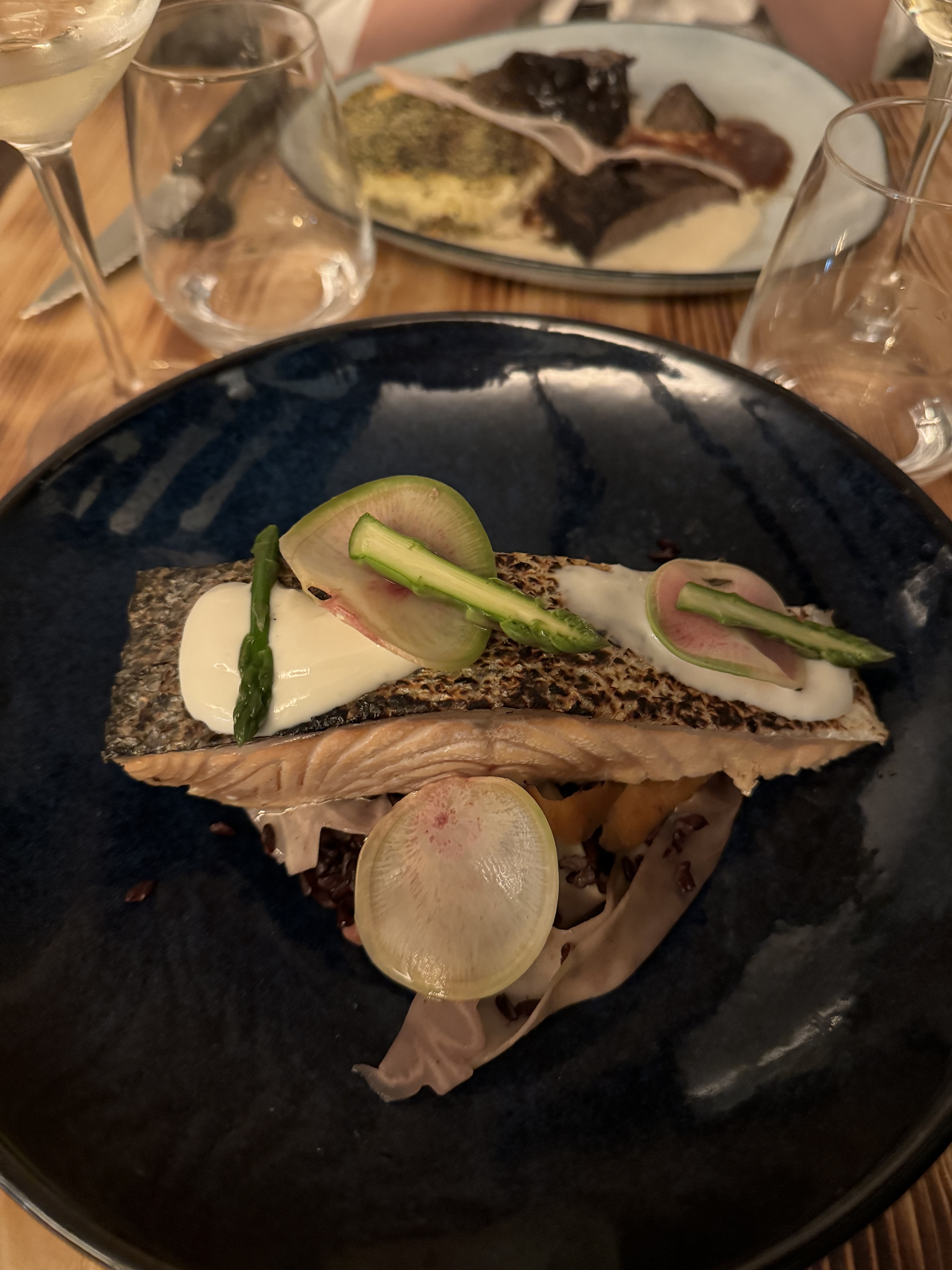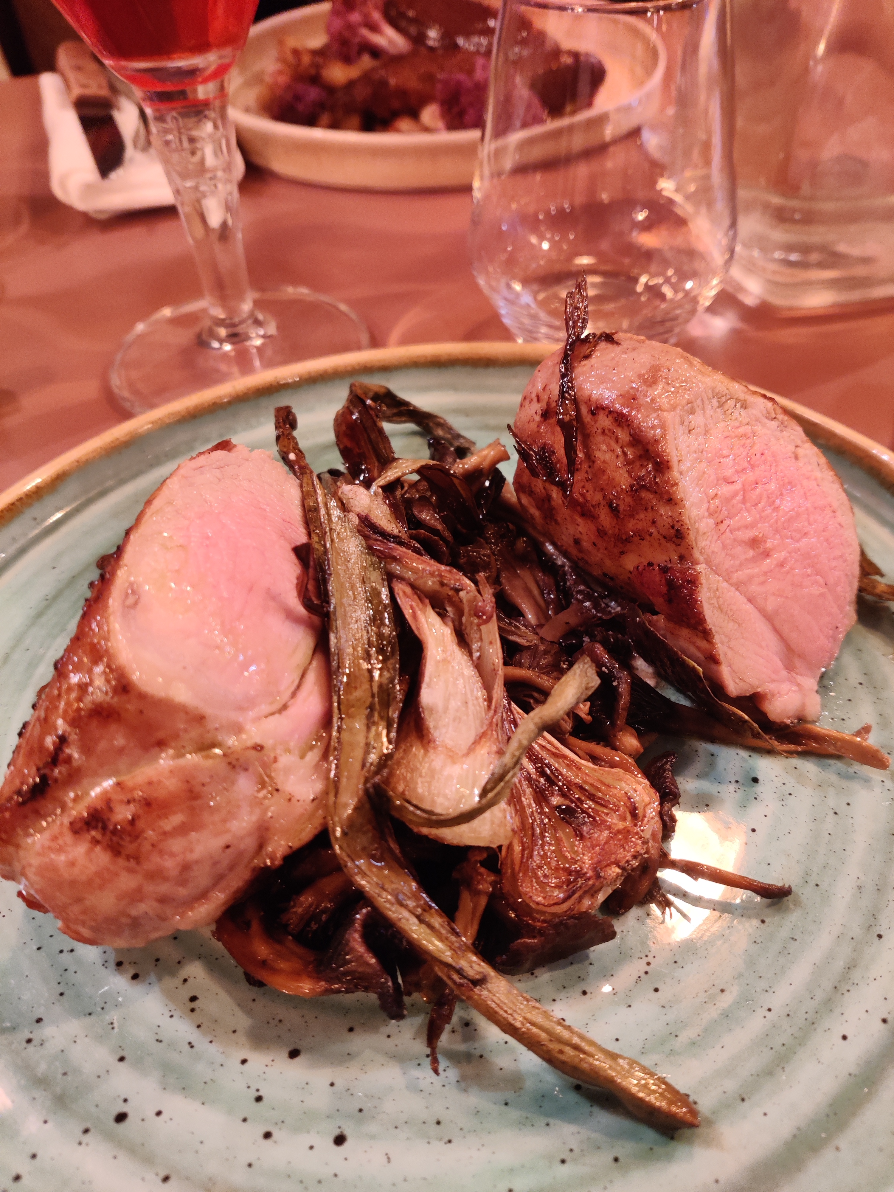 Notre dîner de longe de porc avec de merveilleux poireaux. des truffes aux champignons étaient vraiment bonnes, tout comme notre serveur Alexandra. Nous avons aussi trouvé le pain super ainsi que le beau beurre local. J'aime le fait que ce restaurant soit très petit et intime. Des sièges confortables ainsi qu'une bonne climatisation.