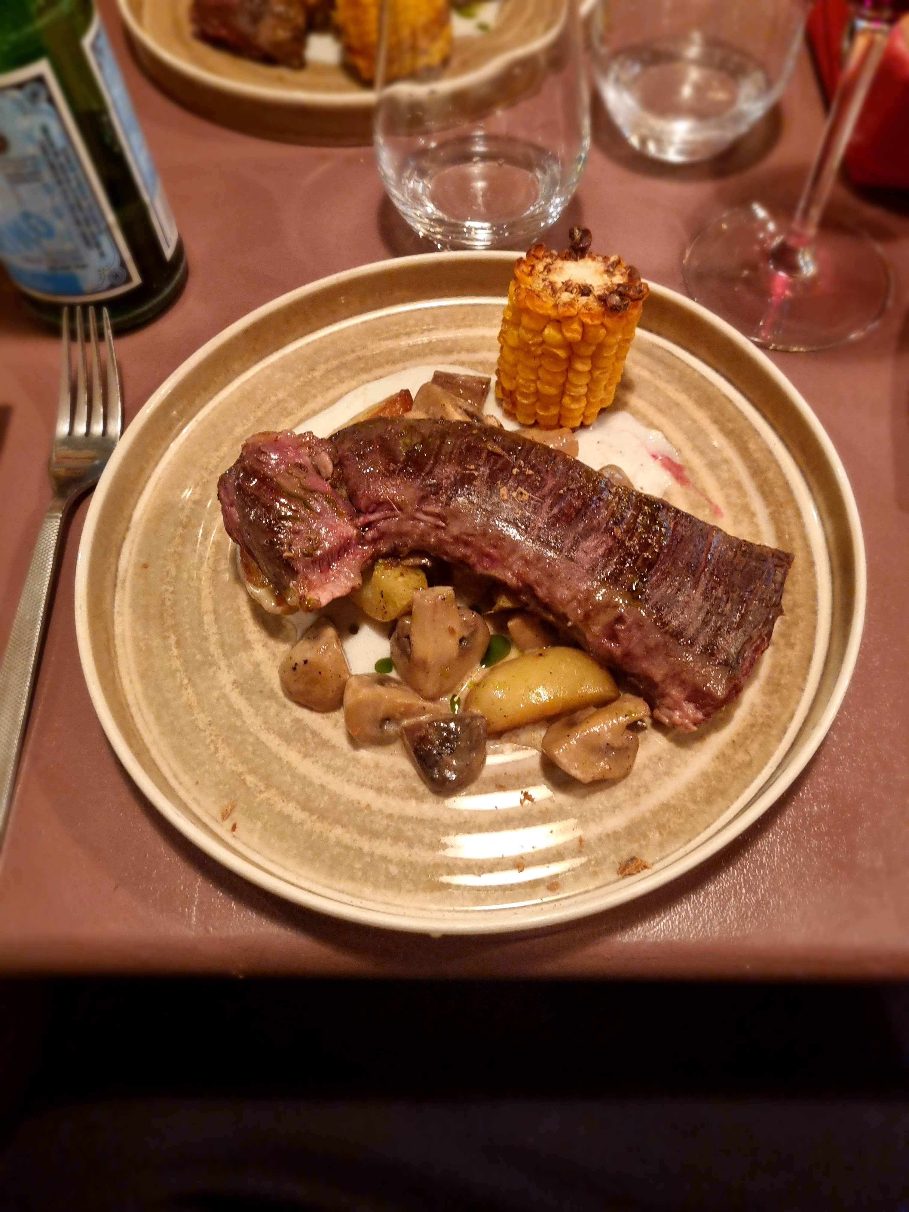 L'ambiance et le service étaient excellents. Il y avait de la musique live et du vin gratuit. Le bœuf était un peu trop moelleux et le légume d'accompagnement était amer, à part ça, tout était vraiment bon.