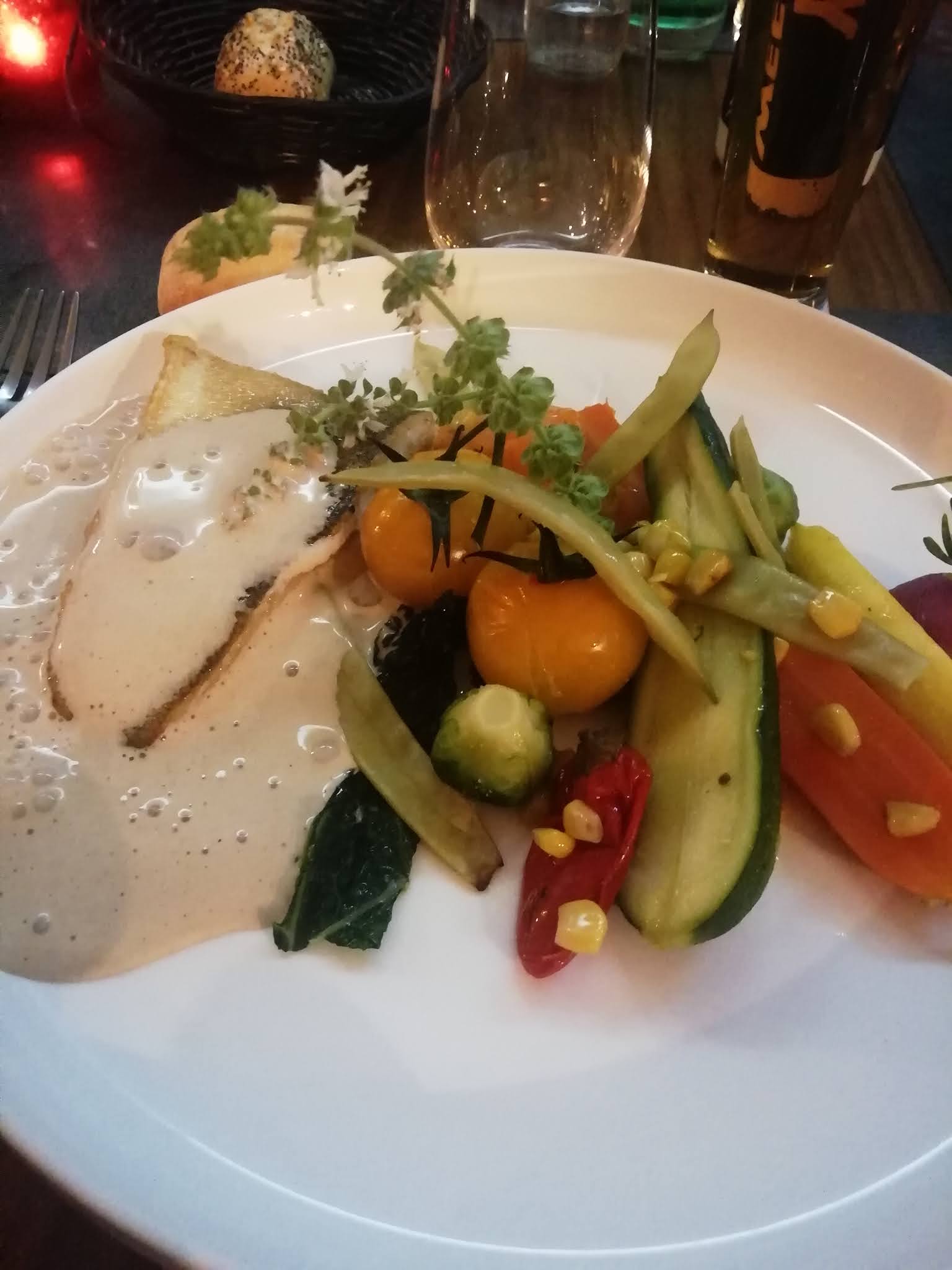 Un excellent accueil. Entrée en trio de saveurs différentes dont un gaspacho sicilien ...un bel Accra et une glace au thym...n ayez pas peur cette dernière elle est juste très douce! Et le choix d un bar (pas assez de bar pour moi..) avec un mélange de légumes dont aubergine, petites grenailles, champignon, radis chauds et navet frais servis avec une sauce copieuse. Je n aurai pas pris de dessert...je n avais plus faim! Service délicat, attentionné dans un cadre calme. J y étais déjà allée il y a longtemps...je n ai rien reconnu. Les propositions sont très différentes et le style aussi. Une belle Re découverte. Merci a l équipe! (Forcément le vin au verre augmente bien l addition !)