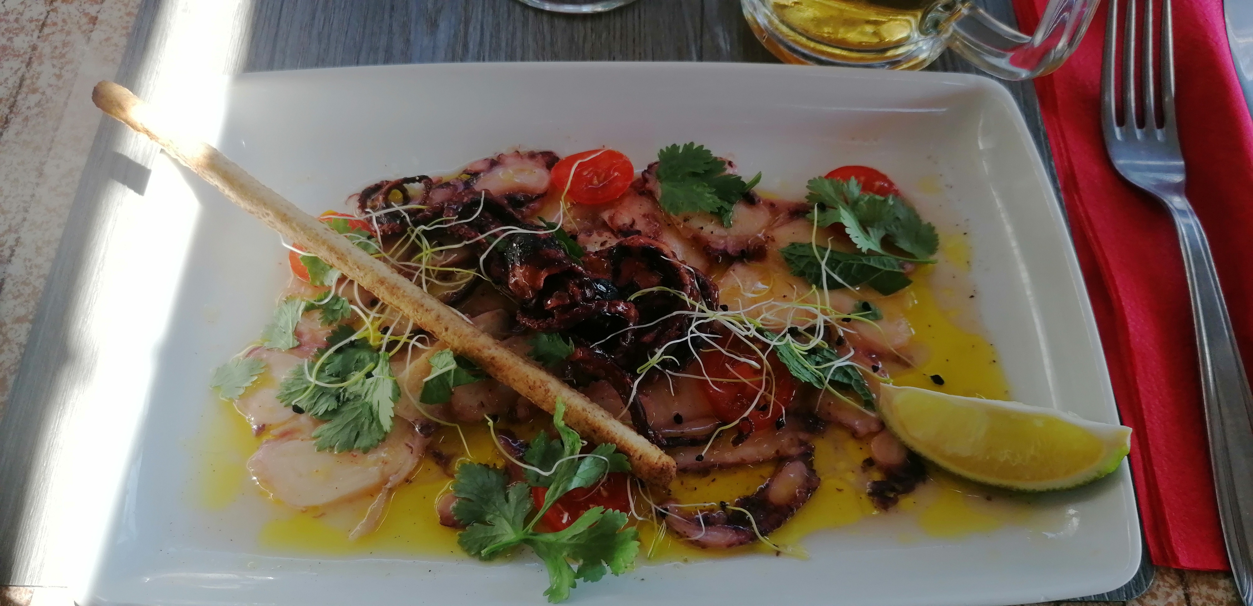 Le carpaccio de poulpes était délicieux avec sa coriandre et ses jeunes pousses. Le fish and chips était réussi et accompagné de légumes vapeurs (carottes, asperges...), bonne idée d'accompagner le tout avec une petite salade rafraîchissante servi dans une verrine, ne pas se fier au horaire d'ouverture de google, le restaurant est ouvert pour midi... Ma femme a aussi aimé les moules à la crème et l'accompagnement : tranche de pastèque et verrine de salade. Un bon moment, merci !