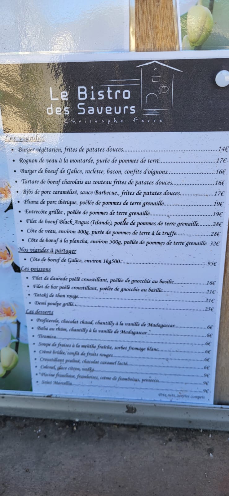 L'entrée était plutôt deux que trois étoiles, le peu de goût qu'avaient les pétoncles et non pas les st jacques comme c'était noté dans la carte, n'était même pas bon. Quant à la côte de boeuf à laquelle il faut rajouter 12 euros au prix du menu, c'était juste une assez bonne cote de boeuf, comme je peux l'acheter à Intermarché. Déçu, vraiment ! Car il y a quelques mois de cela, j'en avais gardé un autre souvenir...