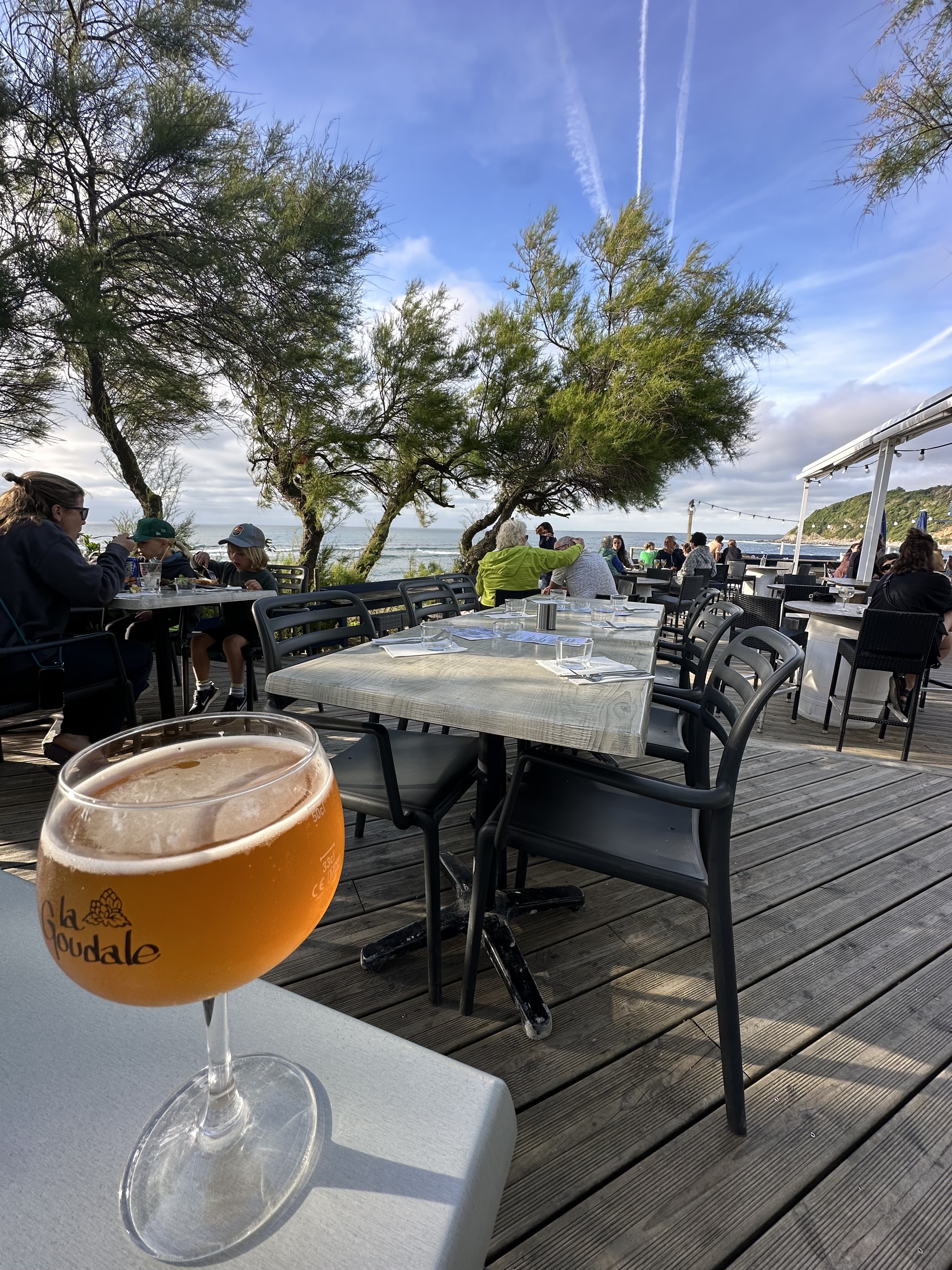 Mitigée sur ce bar brasserie. Le lieu est sans doute féérique en journée car il surplombe la mer. En soirée, nous avons profité d'une très jolie terrasse très arborée. Attention, les épines de sapin nous tombent dessus et peuvent finir dans le verre ou l'assiette. Nous entendions les vagues, c'était magique. Prévoir un pull en soirée car l'air frais maritime fait perdre rapidement quelques degrés surtout en arrière saison. Nous avons pris des croquettes de jambon ainsi que des frites pour accompagner nos verres. Nos verres : c'est là que la bât blesse. Mon virgin pina colada n'est pas fait maison. Il était très liquide et je ne sentais que le lait de coco. Mais où donc est mon ananas et où est sa texture onctueuse qu'on recherche. Il n'y a plus de barmaid, on nous sert du tout prêt et je trouve cela dommage surtout au prix du verre. Bref, bel endroit pour la vue et le cadre, et certains plats que l'on a vu passer (très copieux et cher : comptez environ 20€ le plat) ... le personnel est très sympathique et réactif.