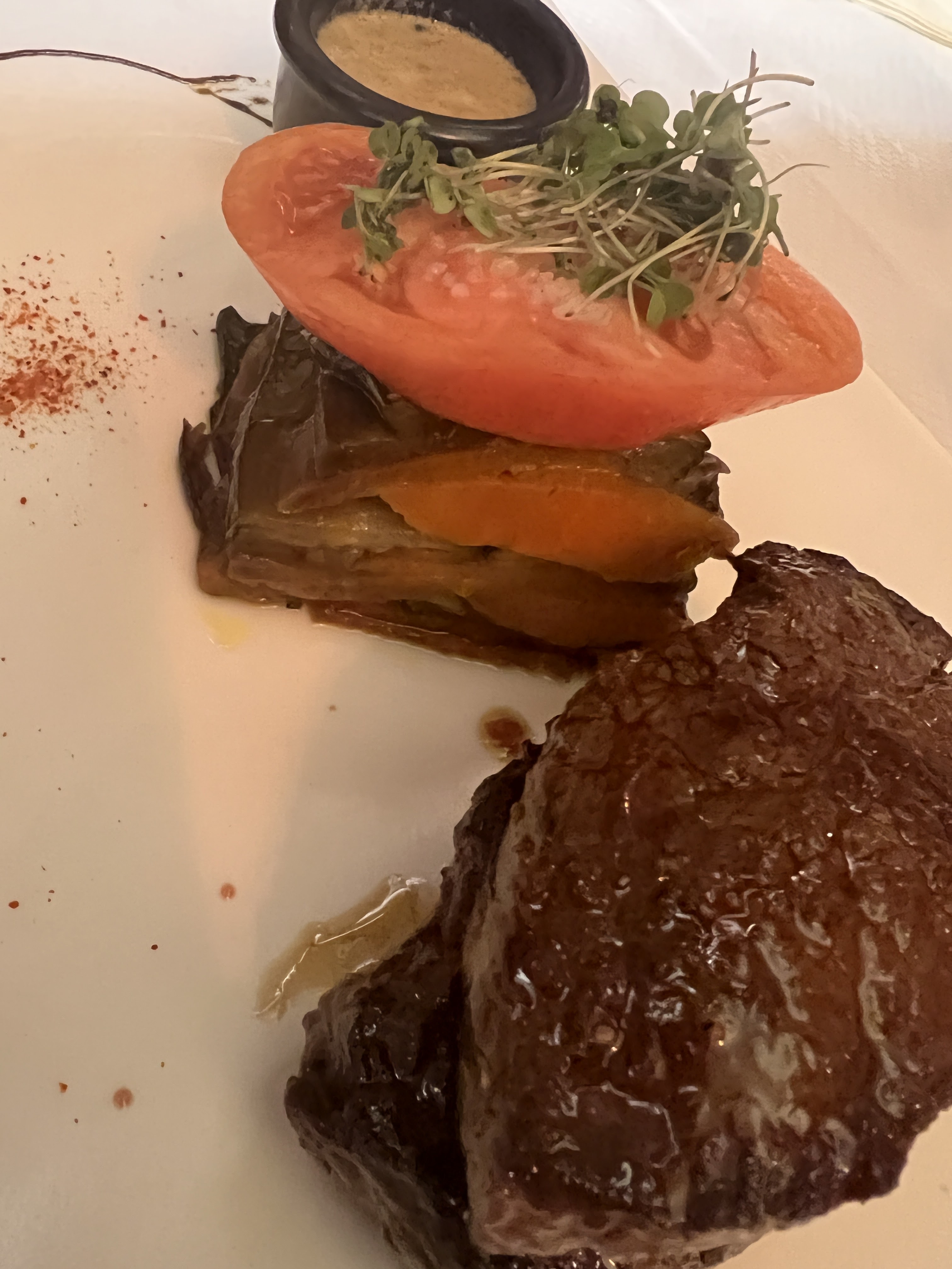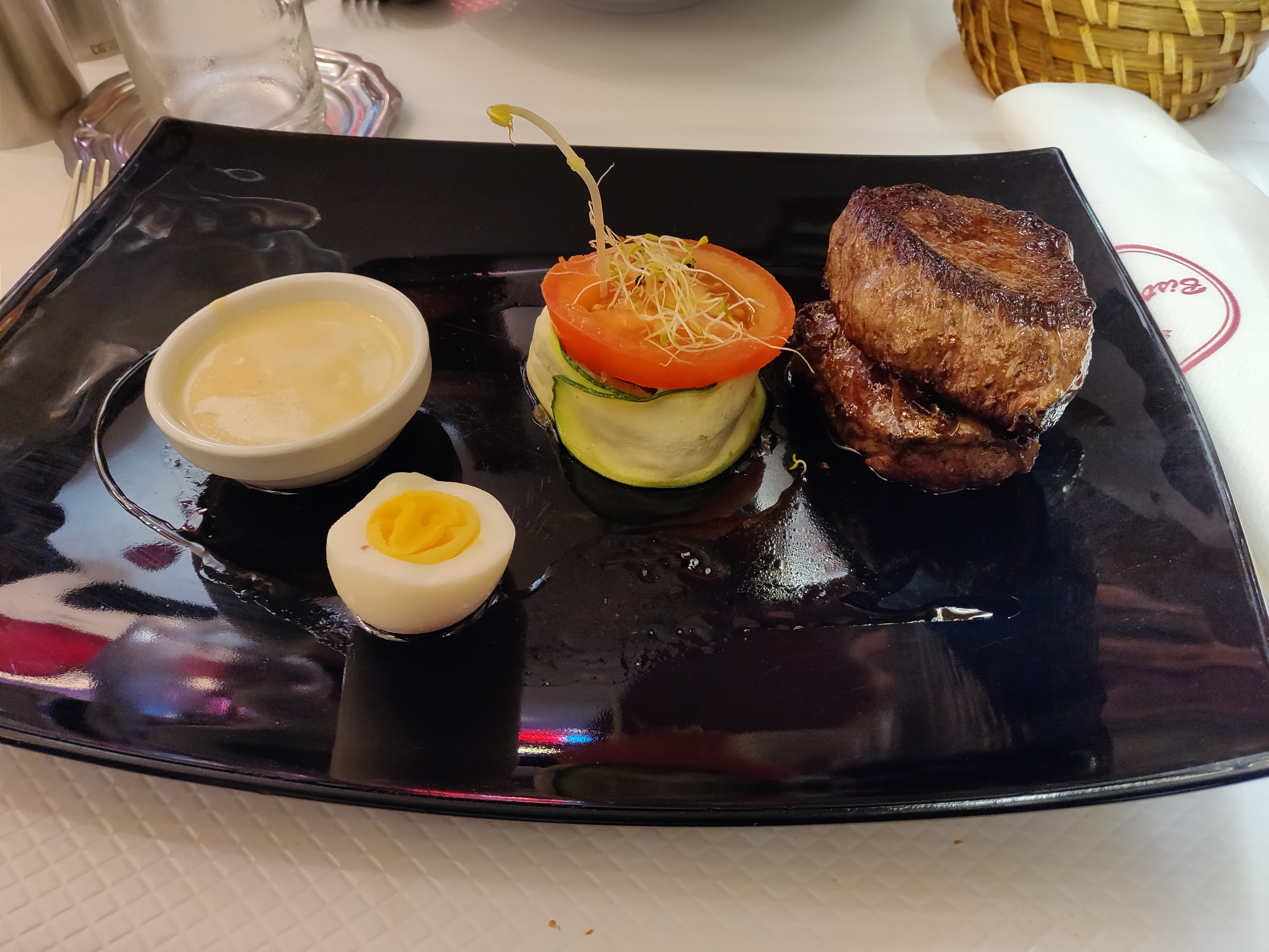 Le médaillon de steak était parfaitement réalisé ! Mais la sauce à la crème au poivre était à vivre !!! L'escargot et le dessert à la pistache étaient incroyables ! Merci Karem !!