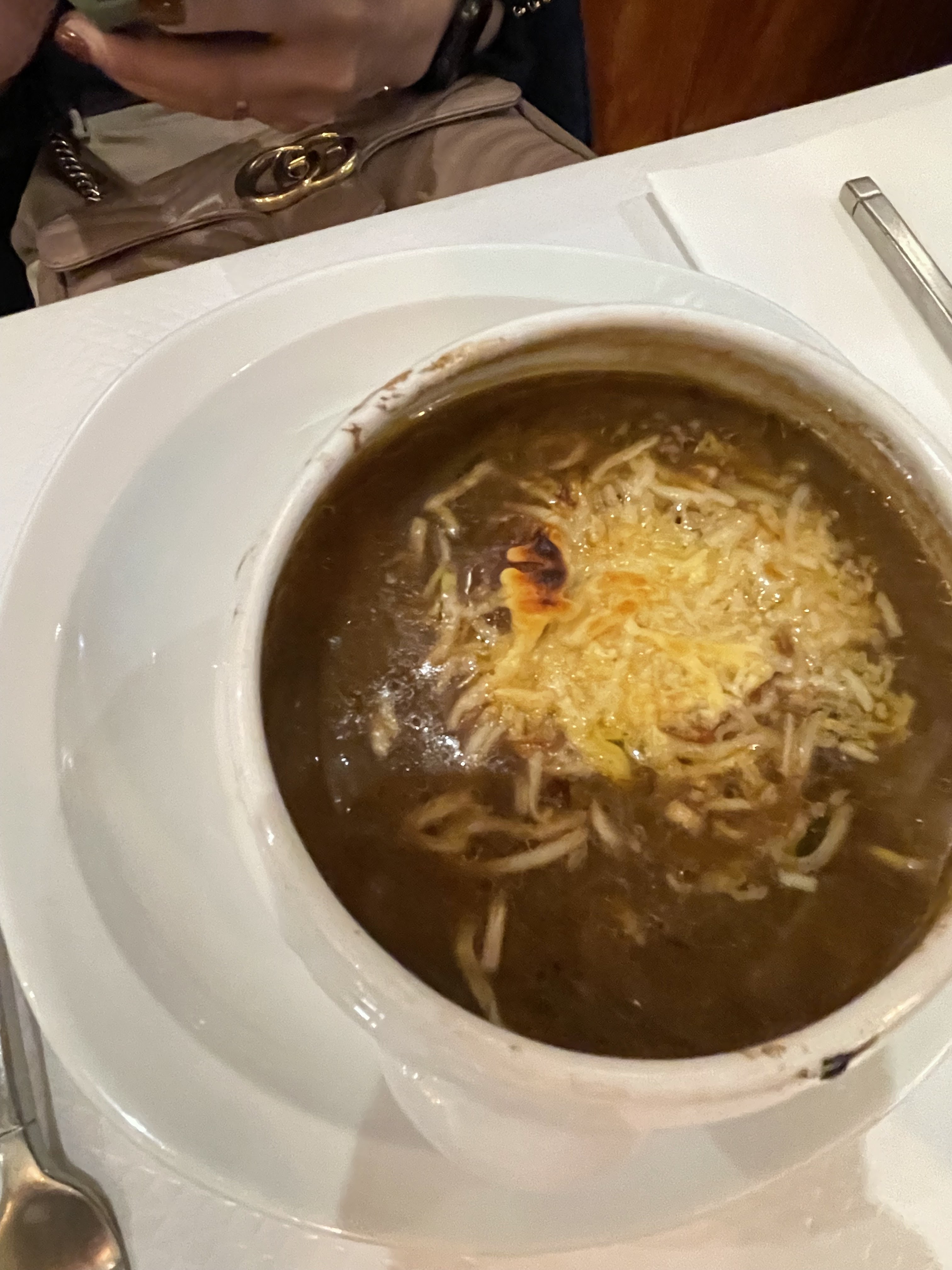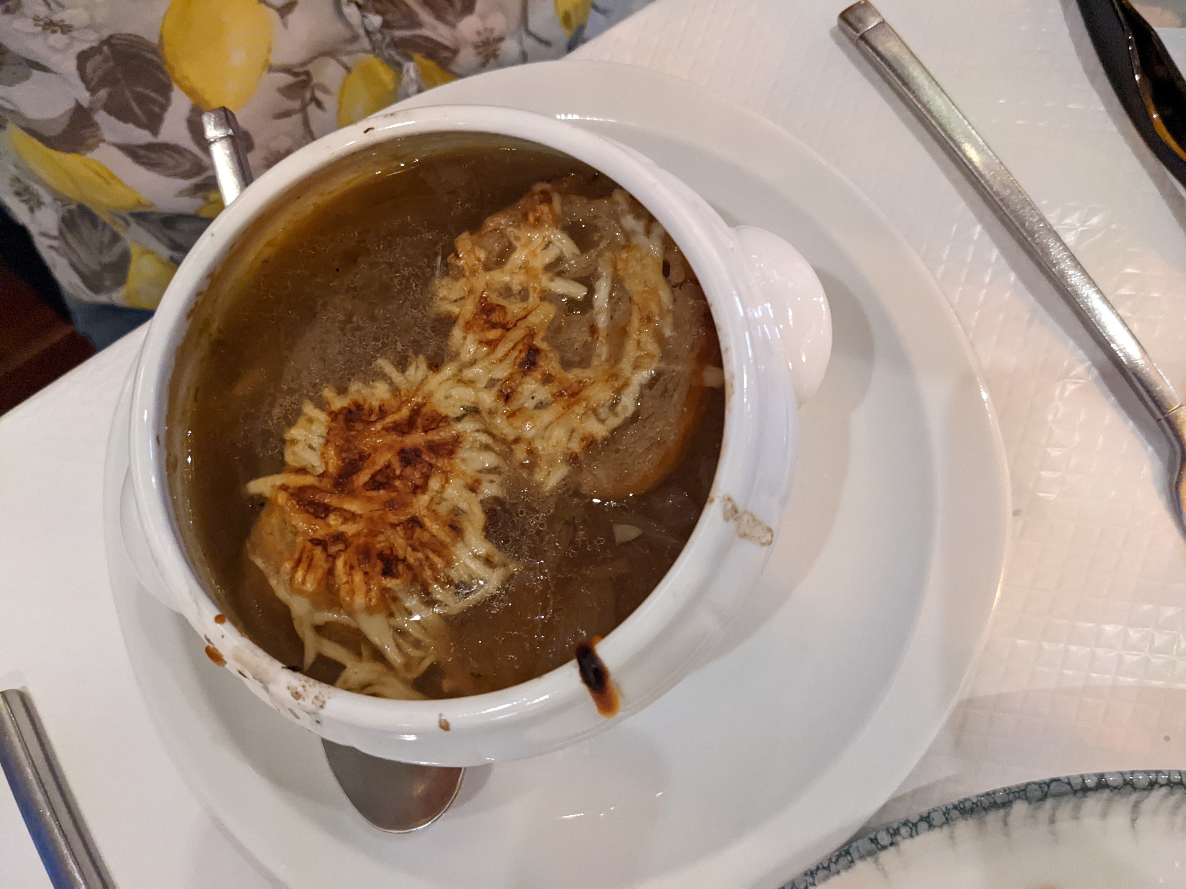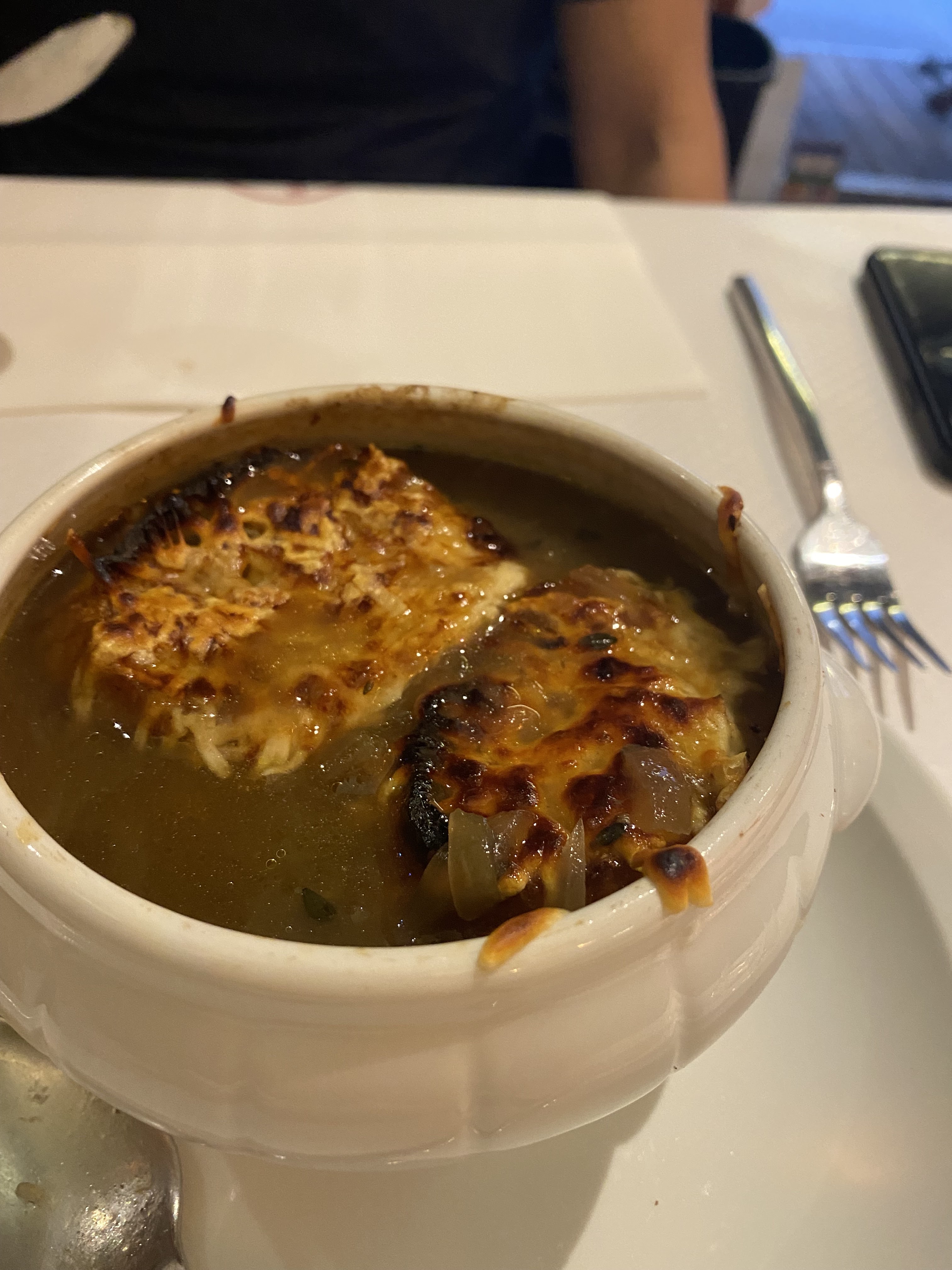La sélection de boissons est large, donc tout le monde a pu choisir un vin qu'il aimait, les cocktails n'étaient pas mauvais non plus. Allez-y certainement avec le repas préfixe ici. Ça vaut chaque bouchée. Évidemment, j'ai opté pour la soupe à l'oignon française, ils sont connus pour cela. J'aurais aimé que le fromage soit un peu moins fondu mais c'était quand même délicieux. Mon plat principal était un poisson blanc sur des linguine à l'encre de seiche.