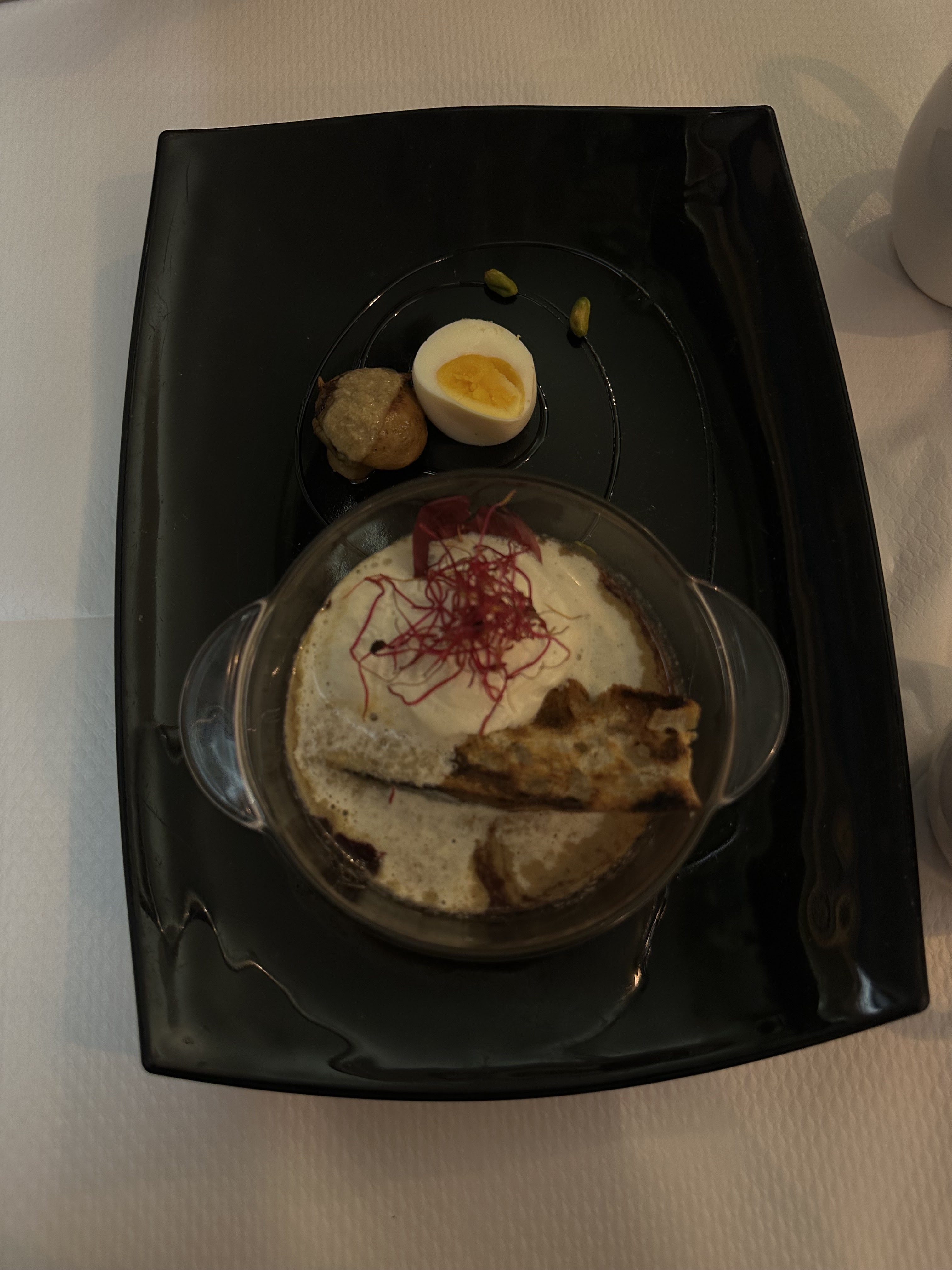 Ma famille et moi voulions de bons escargots, et cet endroit avait de très bonnes critiques, alors nous avons pensé essayer. Tout ce que je peux dire c'est WOW ! Nous avons mangé ces plats. Tout était INCROYABLE, mais si je devais choisir une chose, la Tarte feuilletée du désert, crème pistache aux figues, sauce orange-canelle était époustouflante. Je le recommanderais certainement. Voici tout ce que nous avions Soupe à l'oignon gratinée maison Cappuccino de champignons des bois à l'arôme de truffe Escargots de Bourgogne maison Assiette Végétarienne : Assortiment de légumes