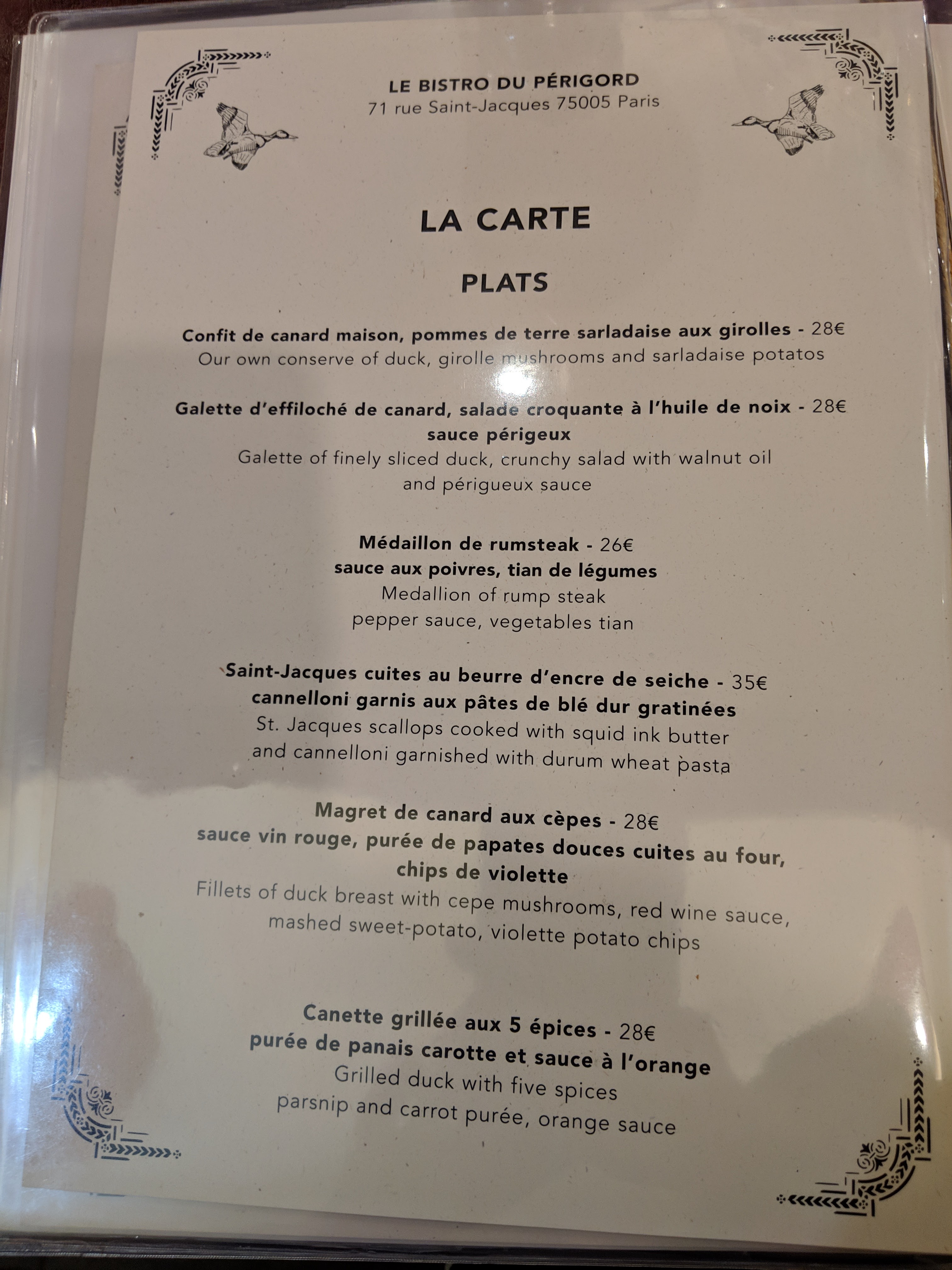 Le serveur était sympathique et parlait anglais. 40 e pour la soupe à trois plats et le dessert étaient délicieux mais le canard était trop cuit comme moyen selon les normes américaines. bref, prenez la soupe à l'oignon française et peut-être un dessert.