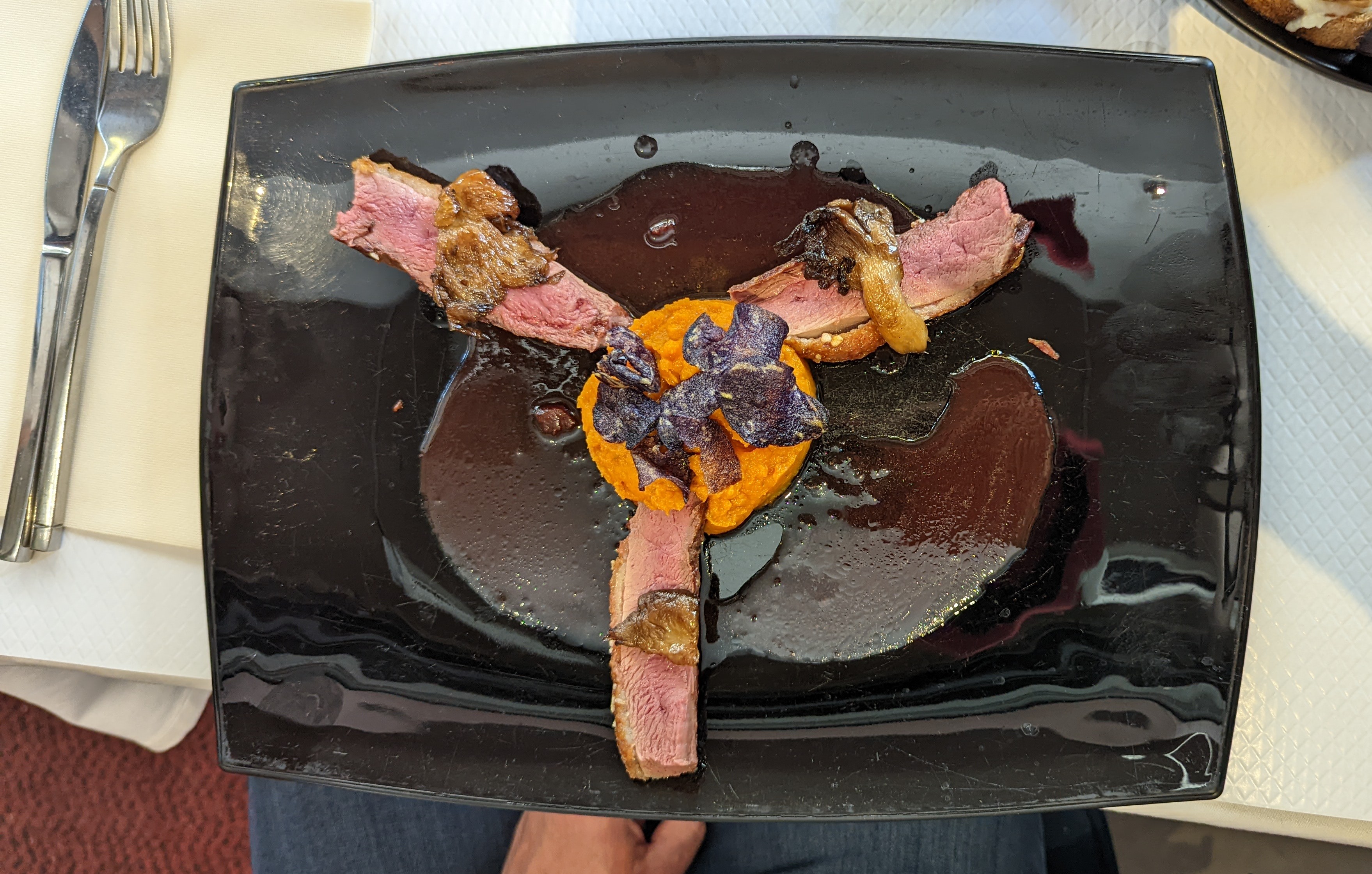 Le canard et le steak étaient trop cuits et avaient un goût de roche. Les desserts étaient ok.