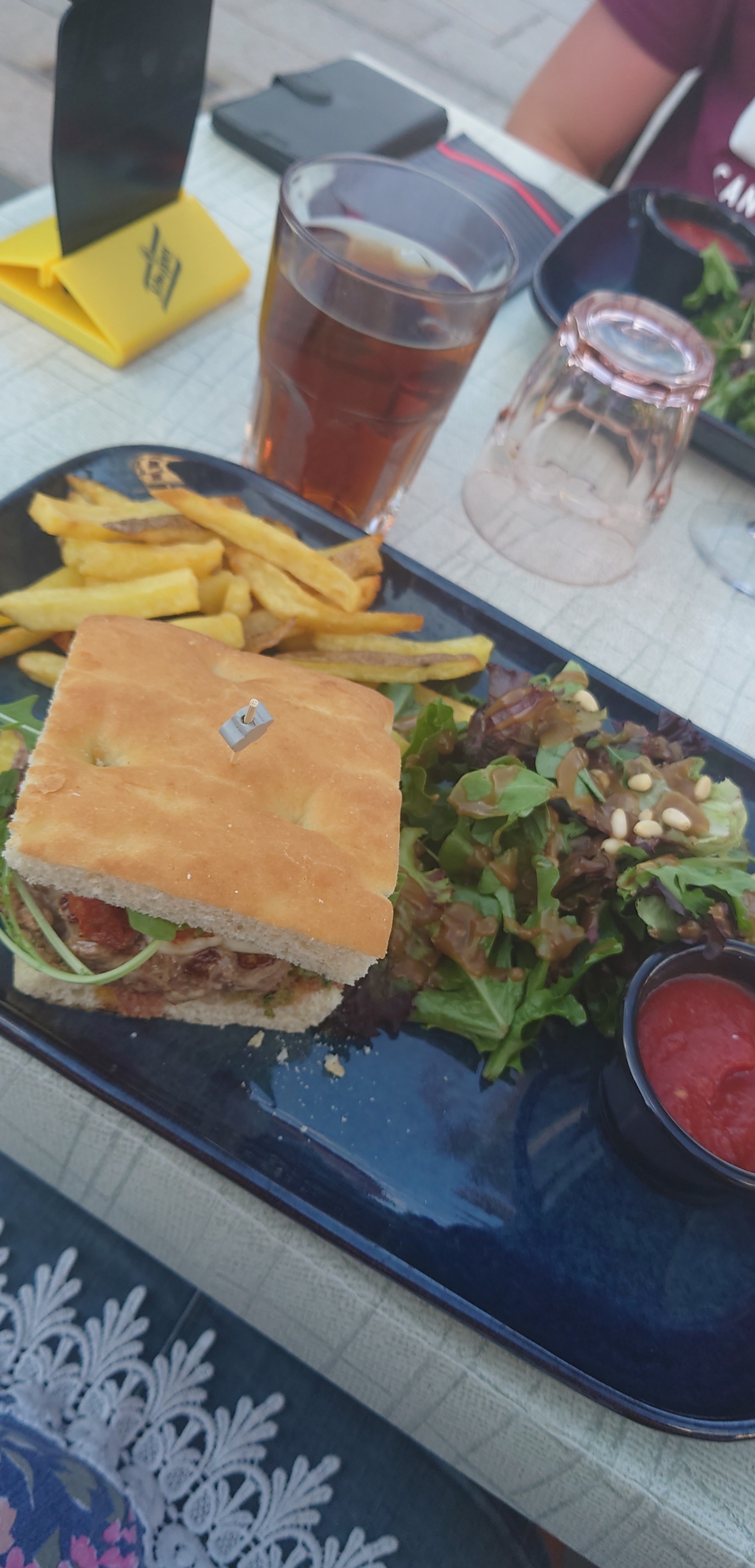 Le burger très original avec le foccacia, en toute légèreté. Le seul hic, le café gourmand était composé que de desserts à base de crème, le sablé à l'anis Top!