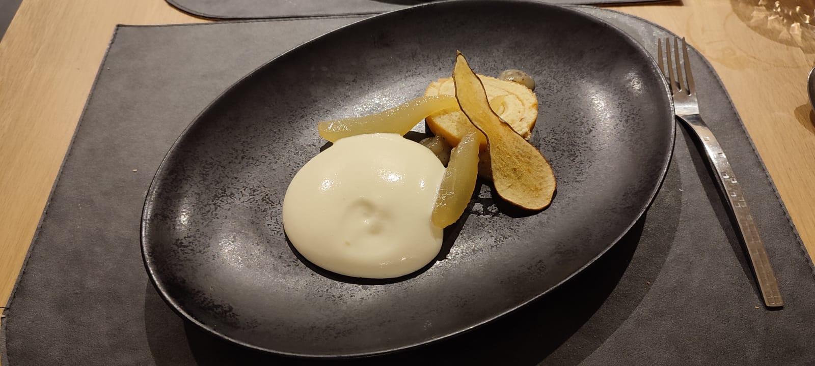 Aucune fausse note, mise en bouche : velouté champignons café 😊 lieu jaune, crème de courgettes au citron confit, parfait. Et le chef très sympa,